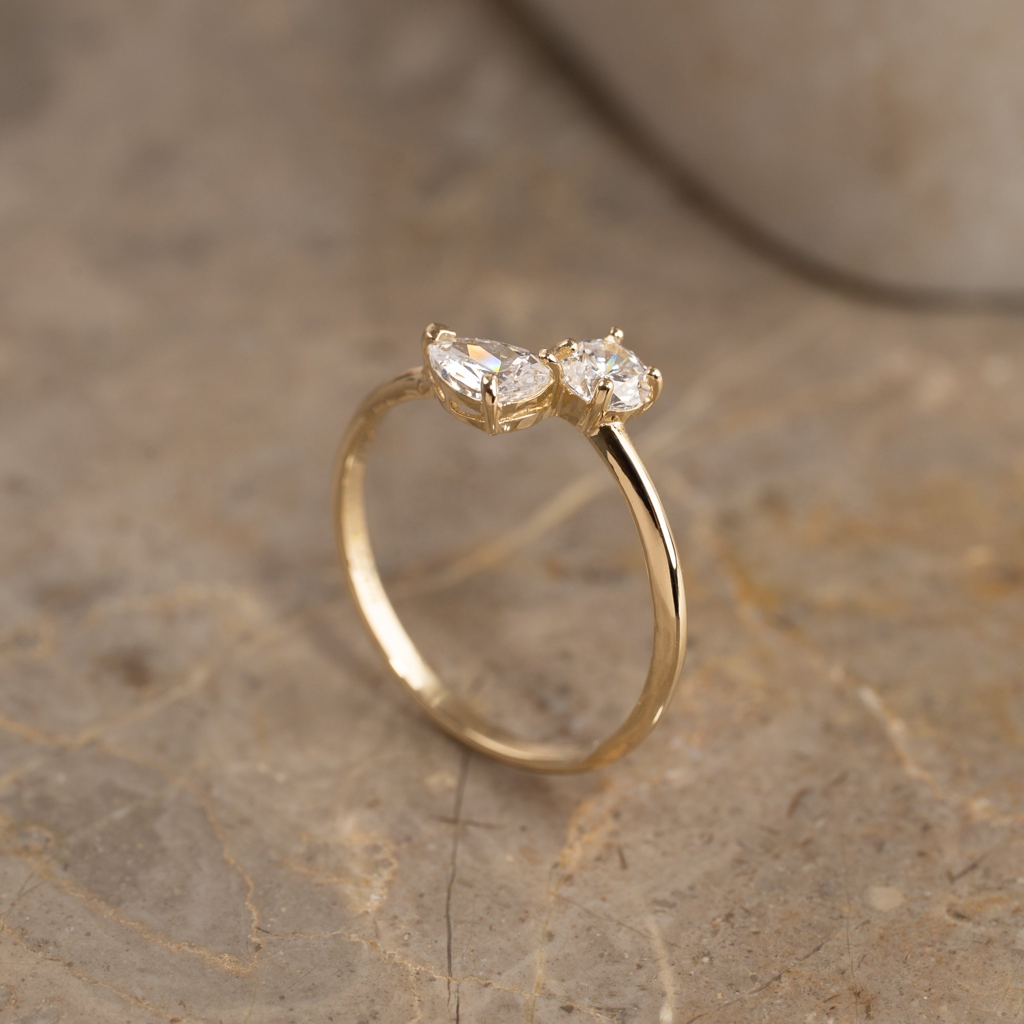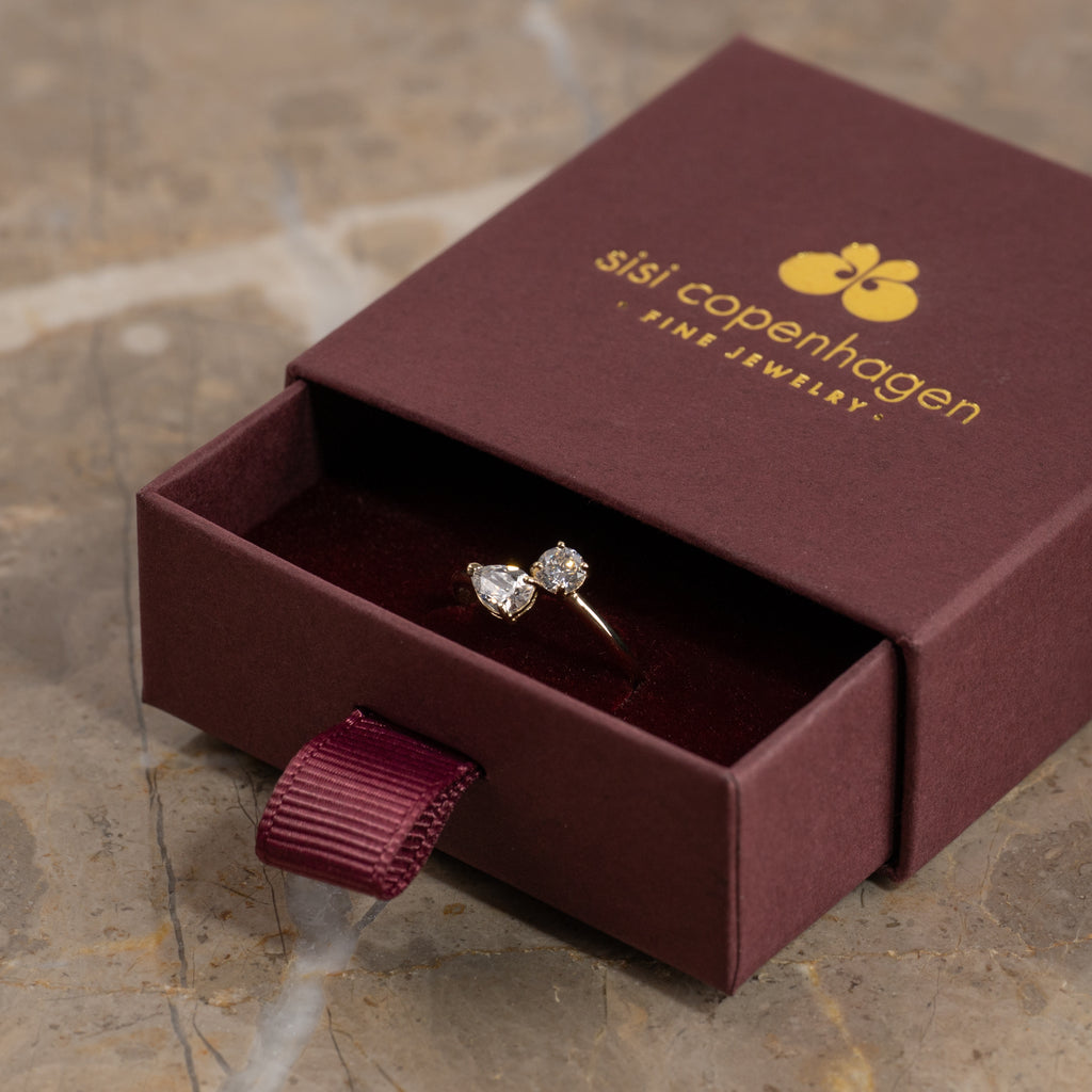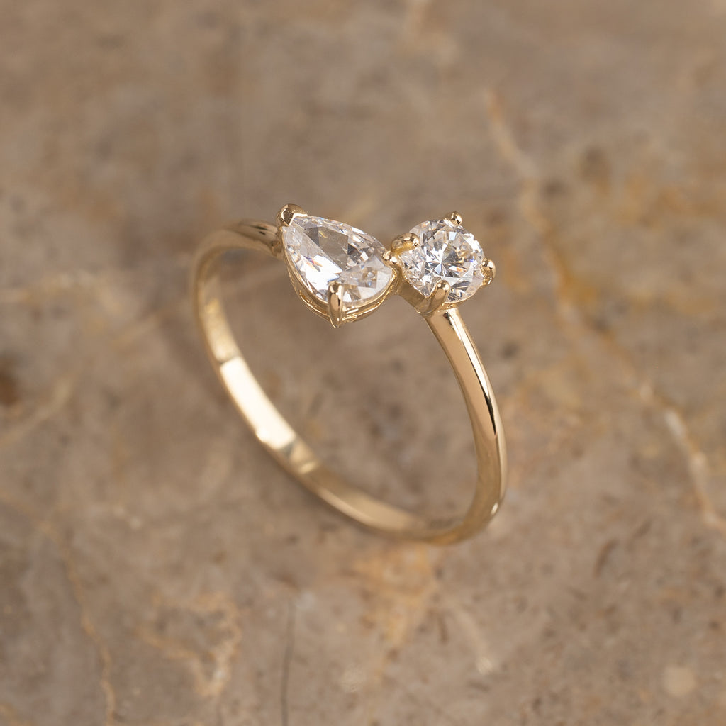 En fin og feminin ring med en rund og en pæreformet zirkon, placeret forskudt af hinanden for et unikt og elegant udtryk