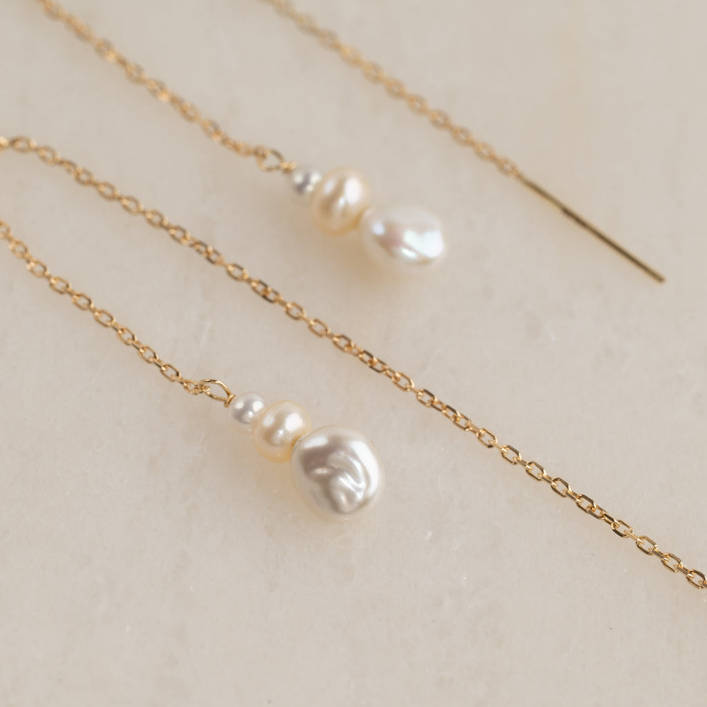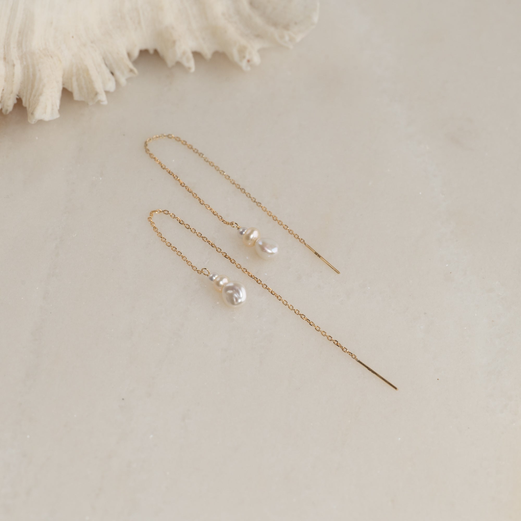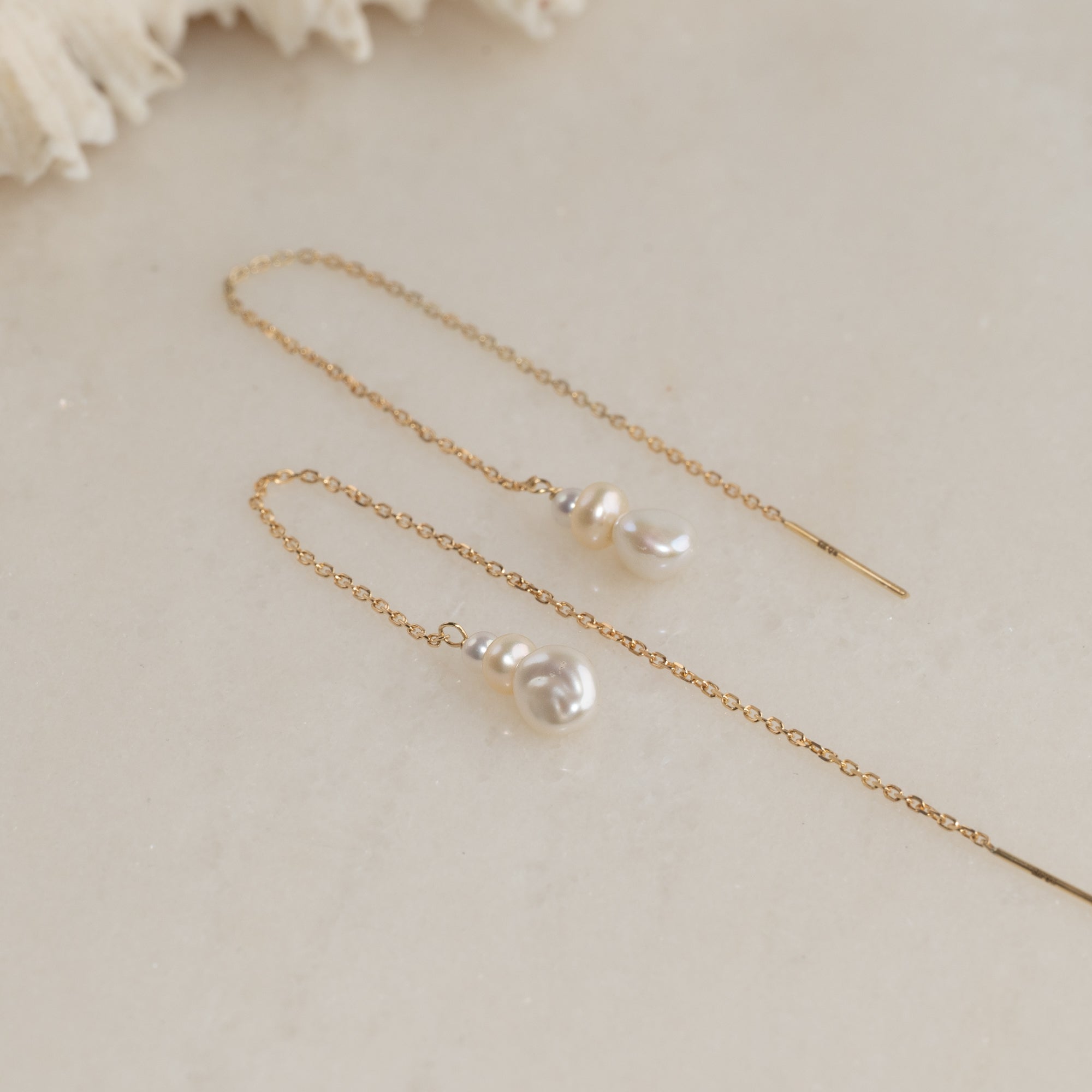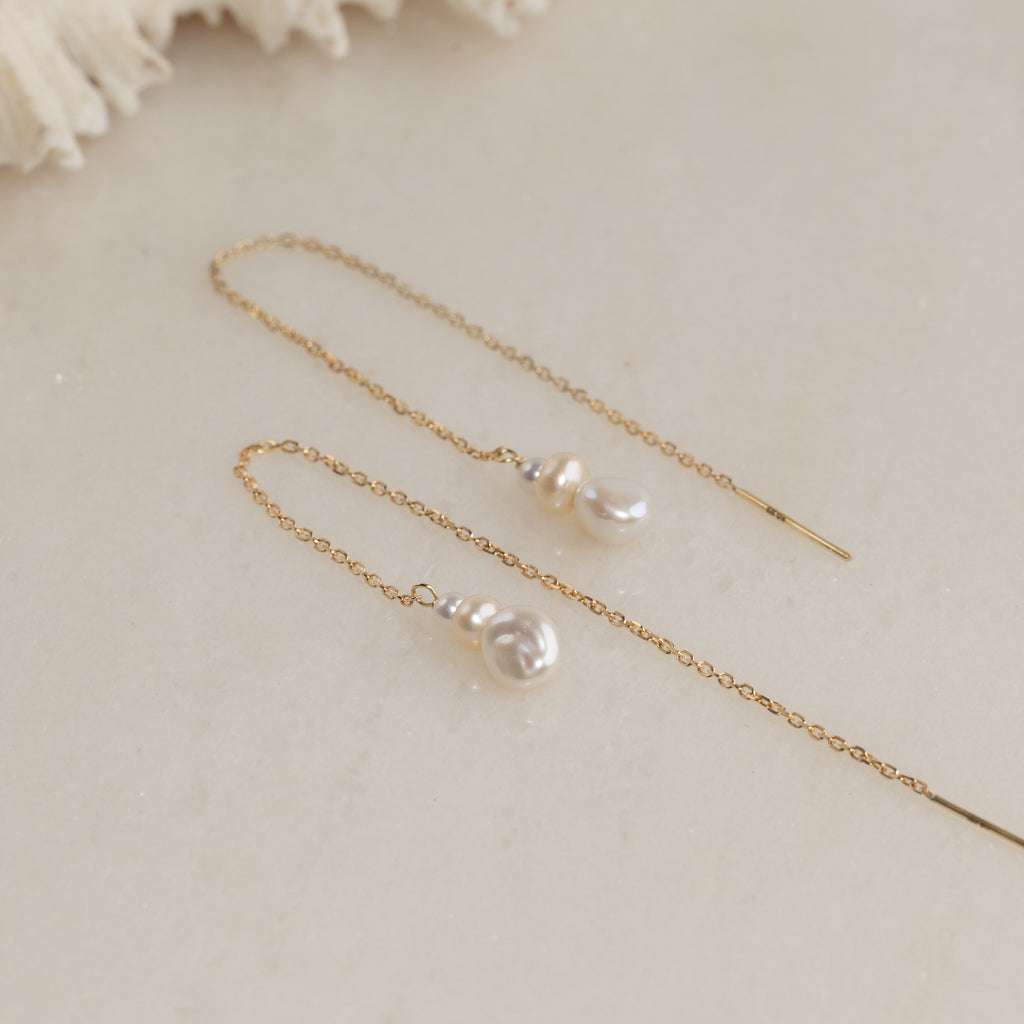 Øreringene kan bæres alene eller kombineres med andre, hvis du har flere huller i øret. Den fine guldkæde giver et elegant udtryk, mens perlen tilføjer et feminint touch.