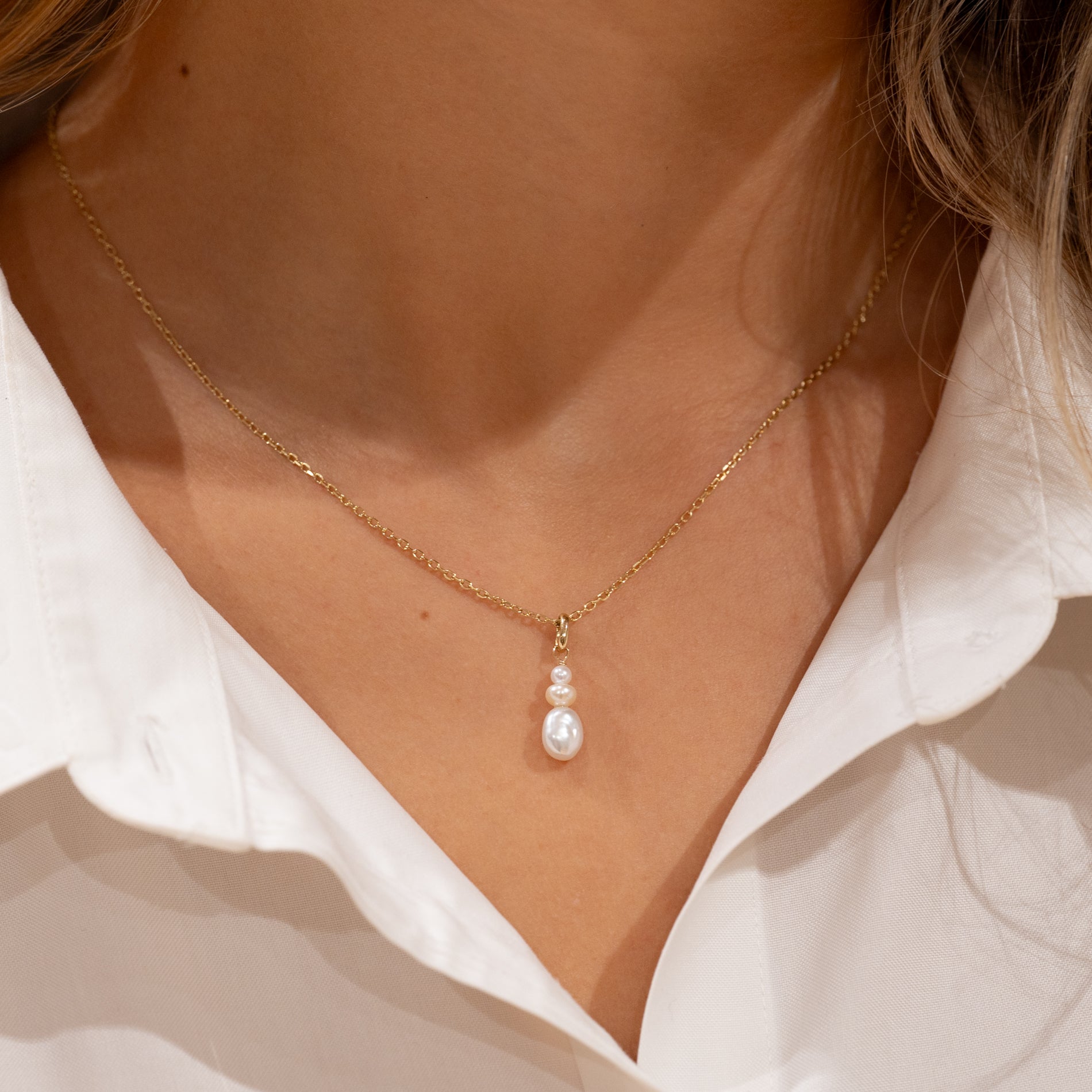 Vedhænget er lavet af 100% genanvendt massivt 9 karat guld med tre ferskvandsperler.