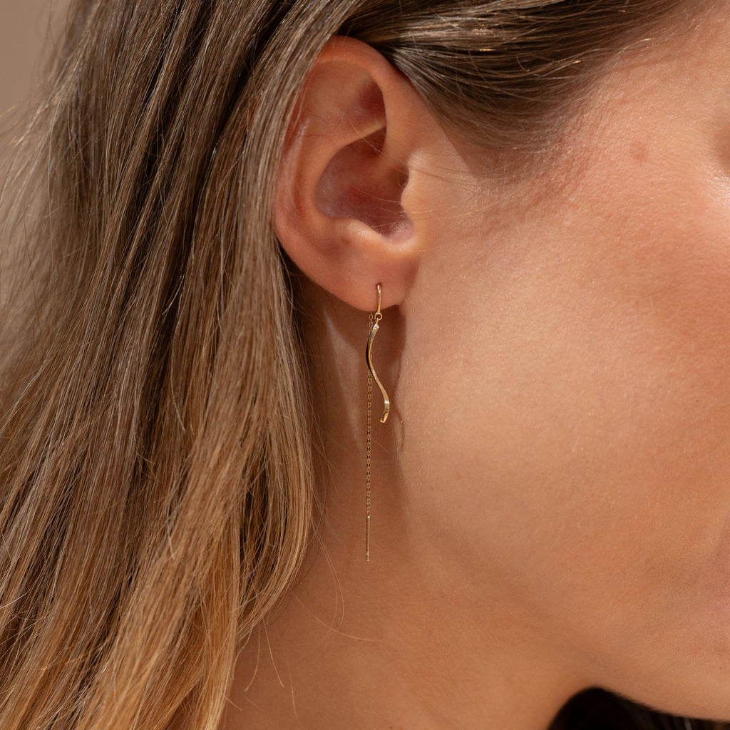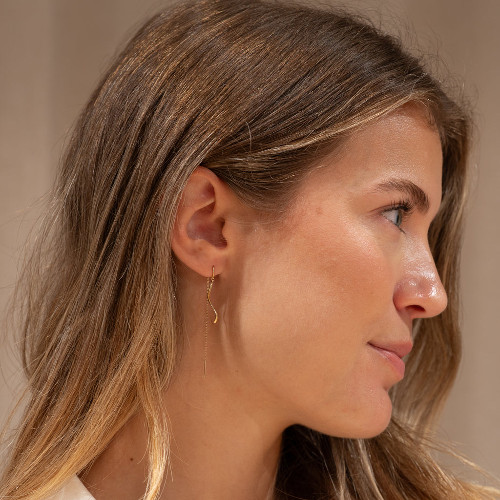 De består af en fin, tynd kæde, der trækkes let gennem øret. Foran sidder et snoet vedhæng, mens kæden falder elegant på bagsiden og skaber et smukt, organisk og let udtryk.