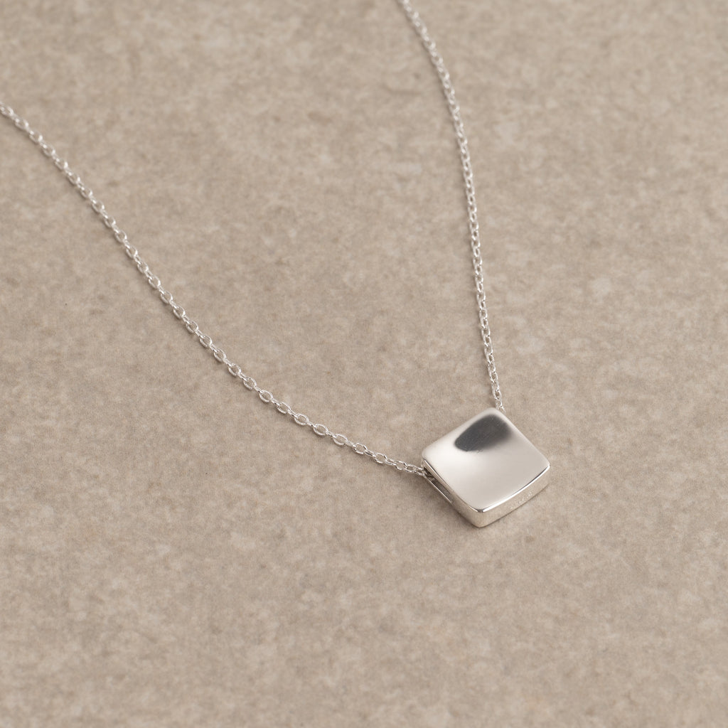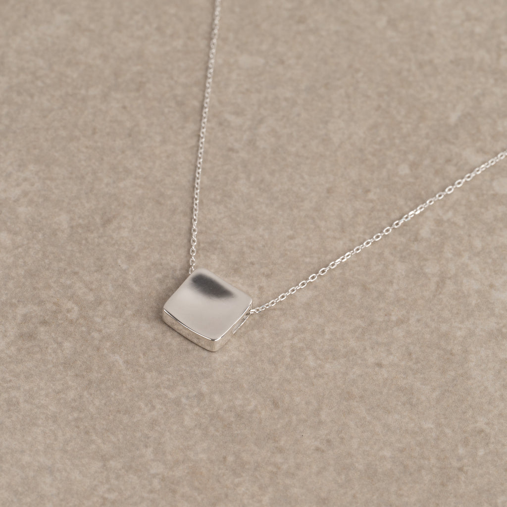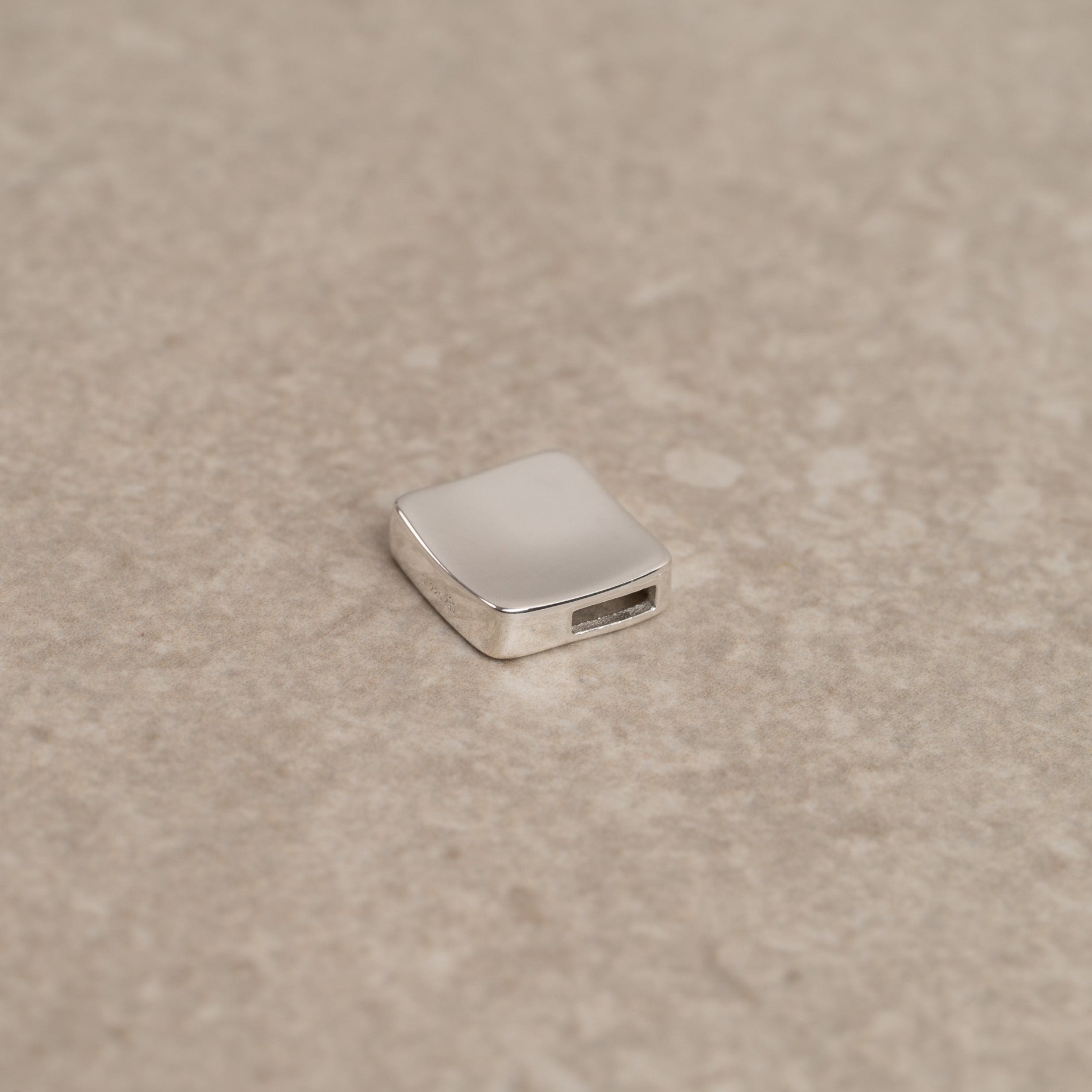 Det firkantede design med afrundede hjørner giver et blødt og retroinspireret udtryk. Vedhænget måler 12 x 12 mm og har en slide-in-åbning på ca. 4,3 mm, som gør det nemt at sætte på en halskæde.