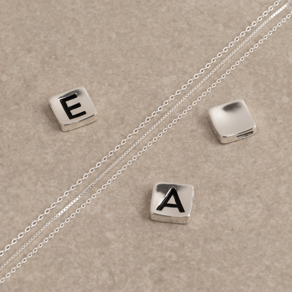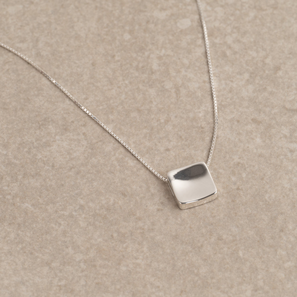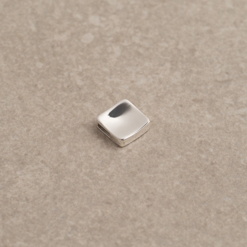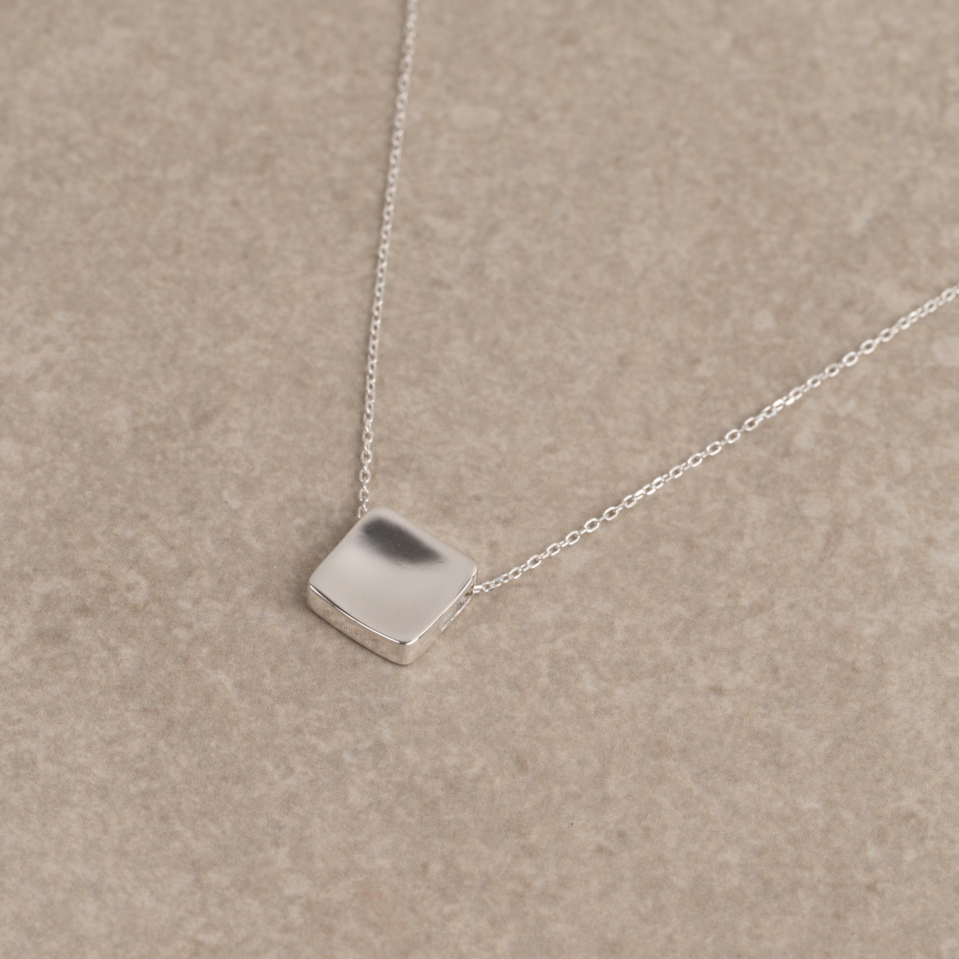 Det firkantede design med afrundede hjørner giver et blødt og retroinspireret udtryk. Vedhænget måler 12 x 12 mm og har en slide-in-åbning på ca. 4,3 mm, som gør det nemt at sætte på en halskæde.