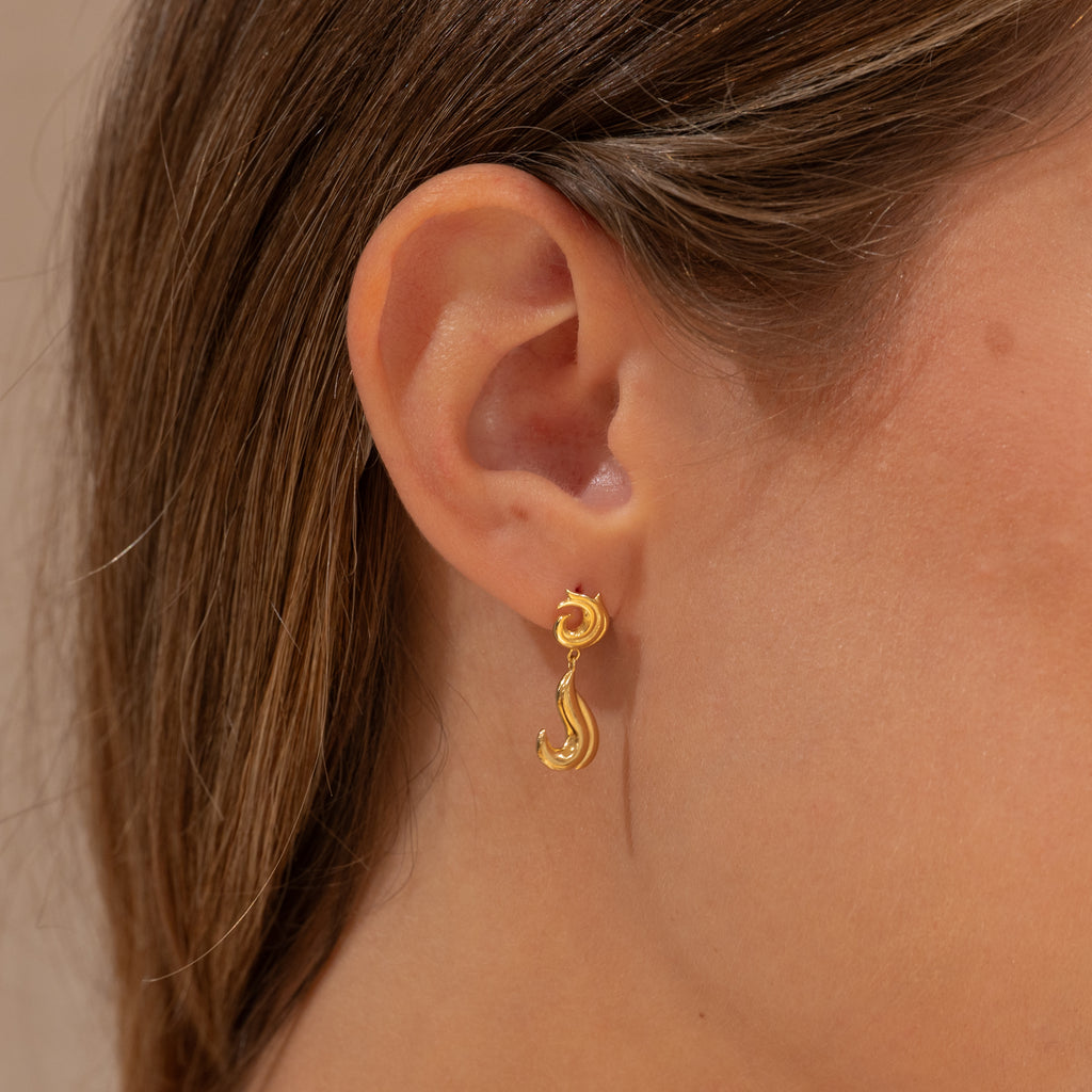 Øreringe i 100% genanvendt 18 karat forgyldt sterlingsølv med bølgeinspirerede detaljer, der giver et dynamisk og levende udtryk. Et unikt og iøjnefaldende valg til både hverdag og særlige anledninger.