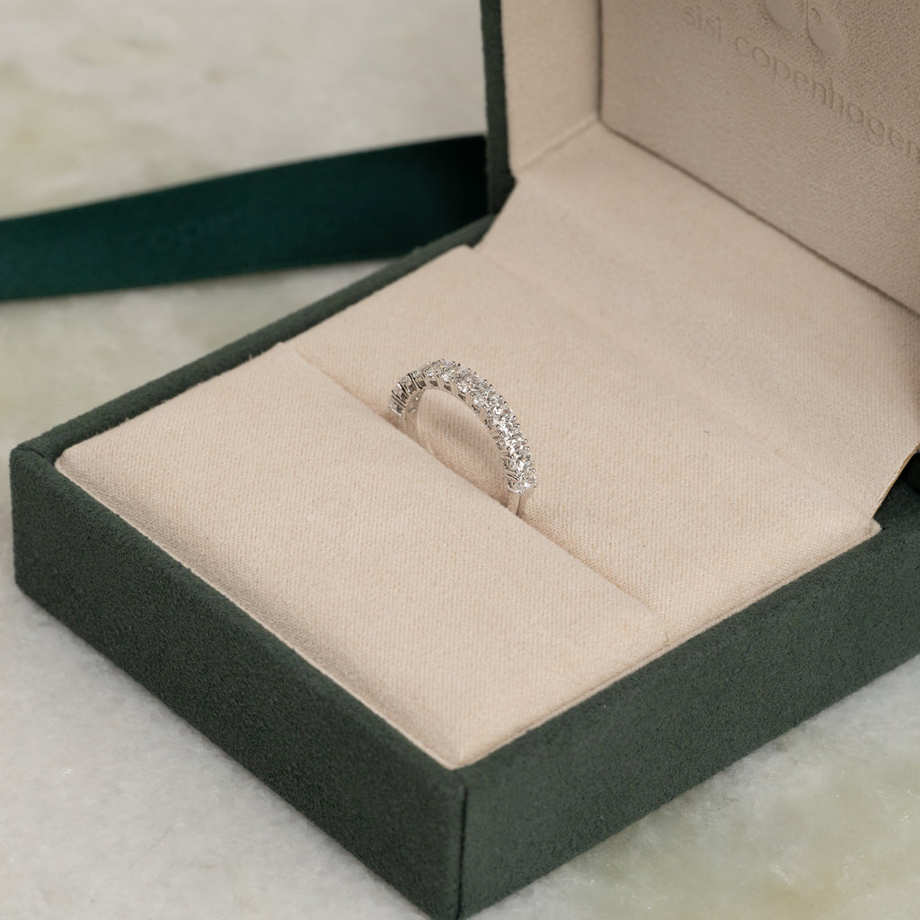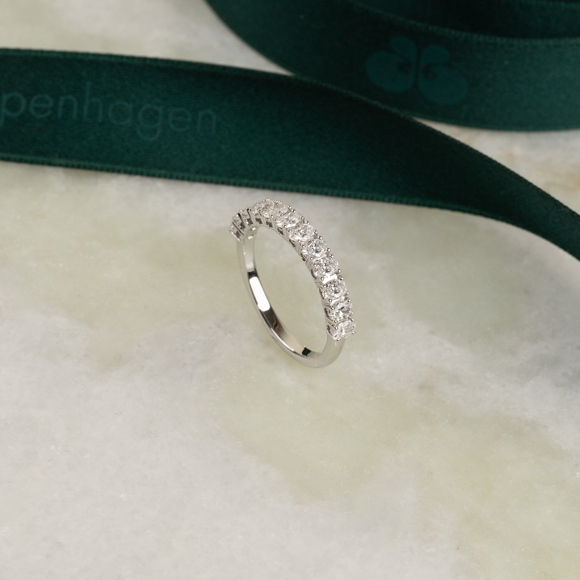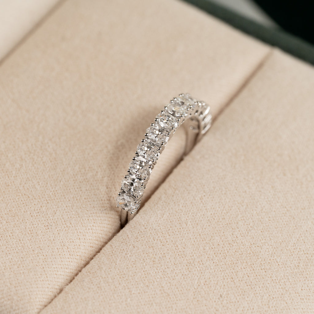 Allianceringen er skabt i 14 kt. massiv hvidguld og 12 ovale lab-grown diamanter på samlet 1,0 ct. ned langs den øvre halvdel af ringskinnen.