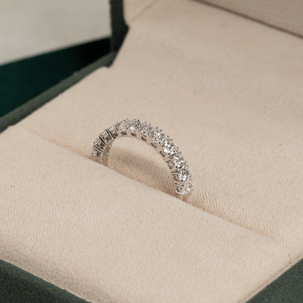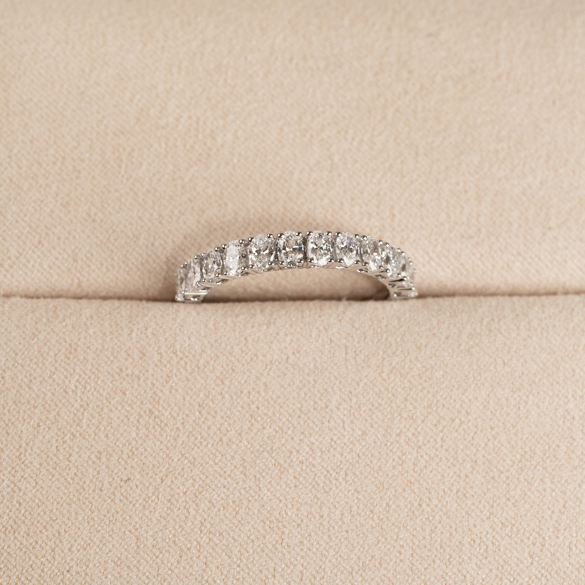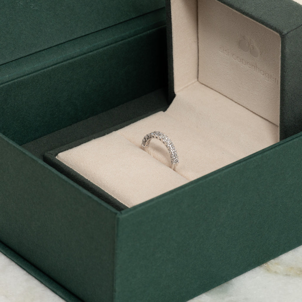 Allianceringen er skabt i 14 kt. massiv hvidguld og 12 ovale lab-grown diamanter på samlet 1,0 ct. ned langs den øvre halvdel af ringskinnen.