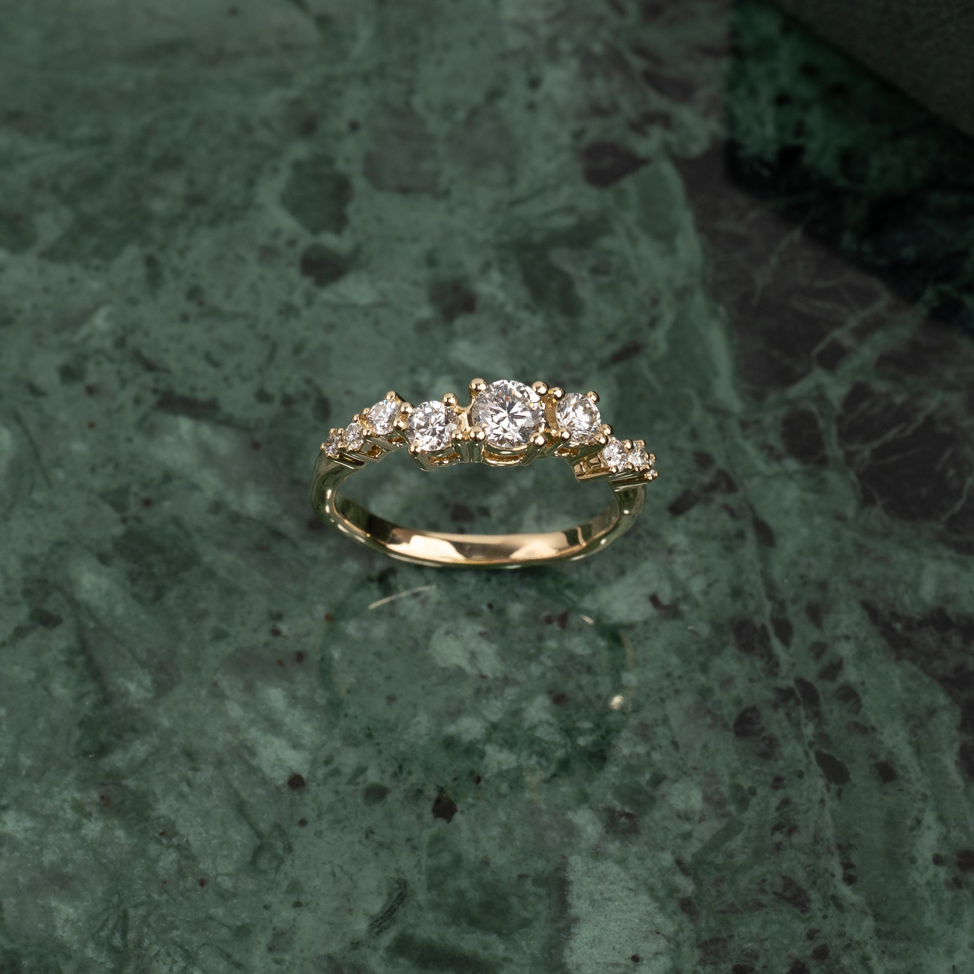 Ring med lab-grown diamanter i graduerende størrelser. Vælg mellem 2 forskellige carat størrelser. Fatningen er smukt og dekorativt designet, hvor stenene sidder forskudt af hinanden i en aflang klynge.