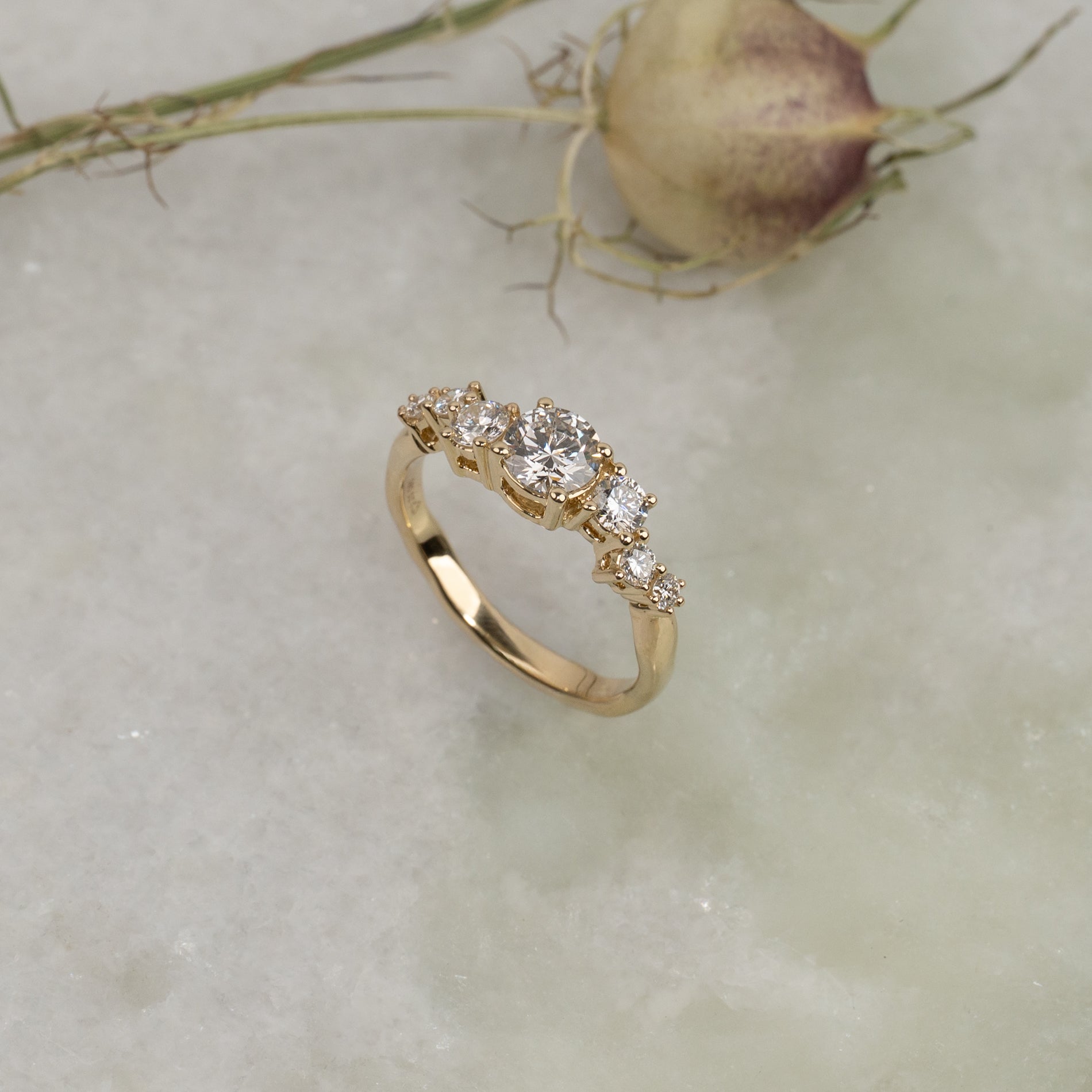 Ringener lavet med lab-grown diamanter, der har farven E/F (River ) og klarheden VVS. Smykket er skabt med omtanke; diamanterne er blandt andet fremstillet med solenergi, og guldet er 100% certificeret genanvendt.
