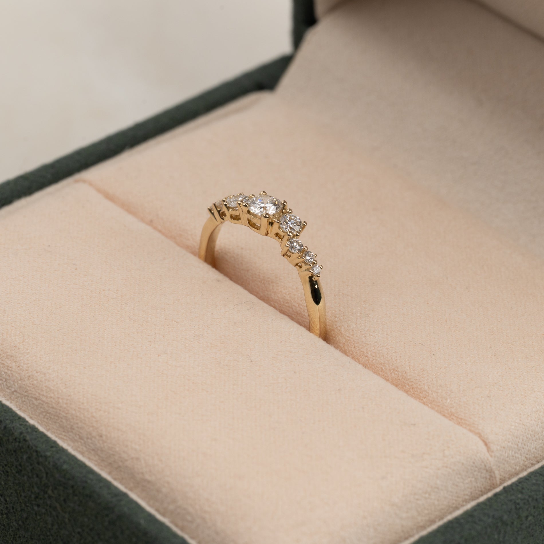 Ring i 14 karat guld med 0,5 ct. lab-grown diamanter i graduerende størrelser; i alt 9 stk. - heraf en centersten på 0,22 ct. Fatningen er smukt og dekorativt designet, hvor stenene sidder forskudt af hinanden i en aflang klynge. Selve ringskinnen har et organisk design, der giver et moderne twist.