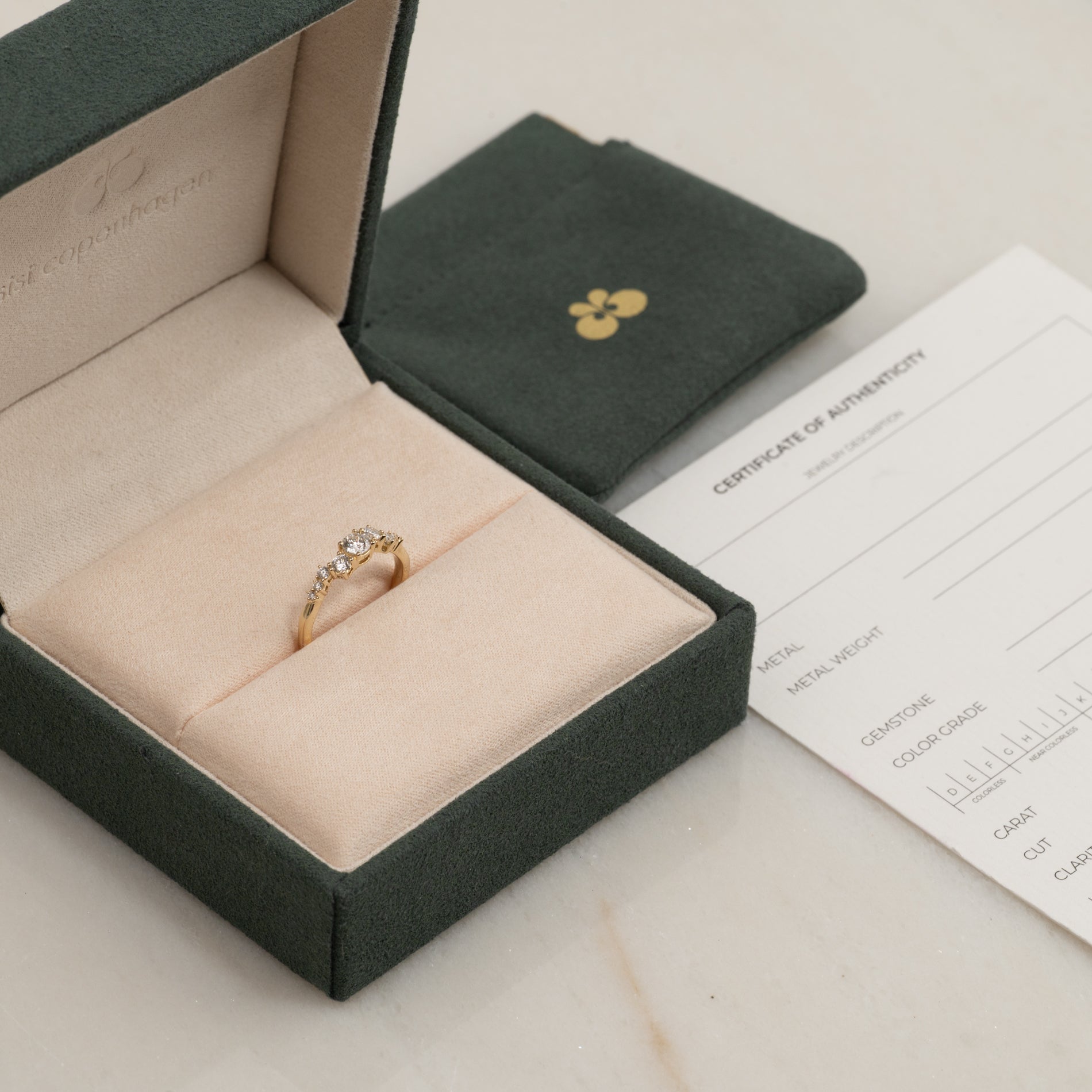Ringen er i 14 karat massivt guld med 9 lab-grown diamanter på i alt 0,5 ct. Diamanterne har farven E/F (River) og klarheden VVS. Smykket er skabt med omtanke; diamanterne er blandt andet fremstillet med solenergi, og guldet er 100% certificeret genanvendt.