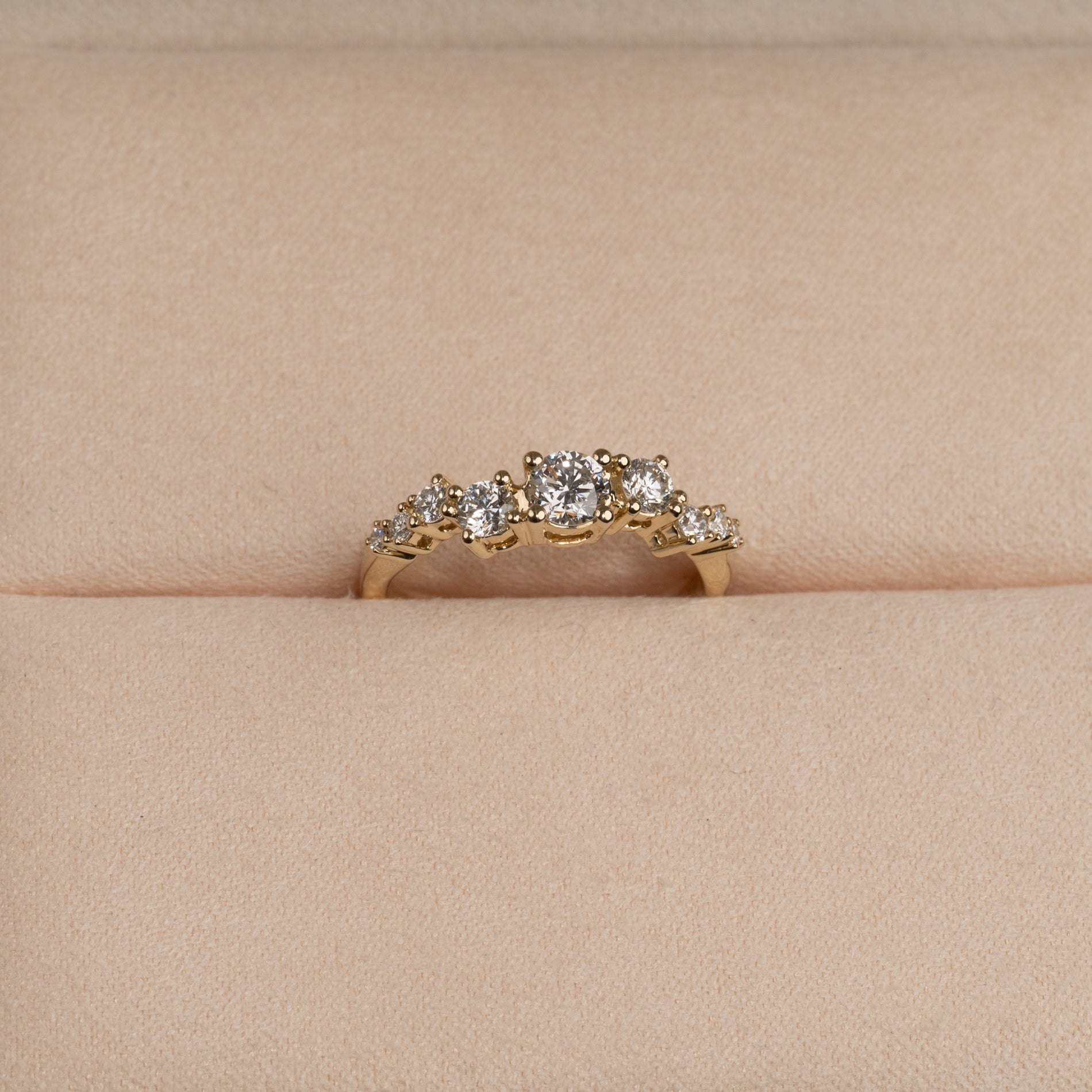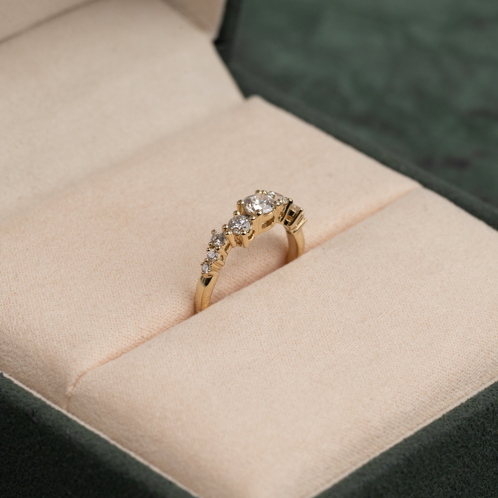 Ring i 14 karat guld med 0,7 ct. lab-grown diamanter i graduerende størrelser; i alt 9 stk. - heraf en centersten på 0,3 ct. Fatningen er smukt og dekorativt designet, hvor stenene sidder forskudt af hinanden i en aflang klynge. Selve ringskinnen har et organisk design, der giver et moderne twist.