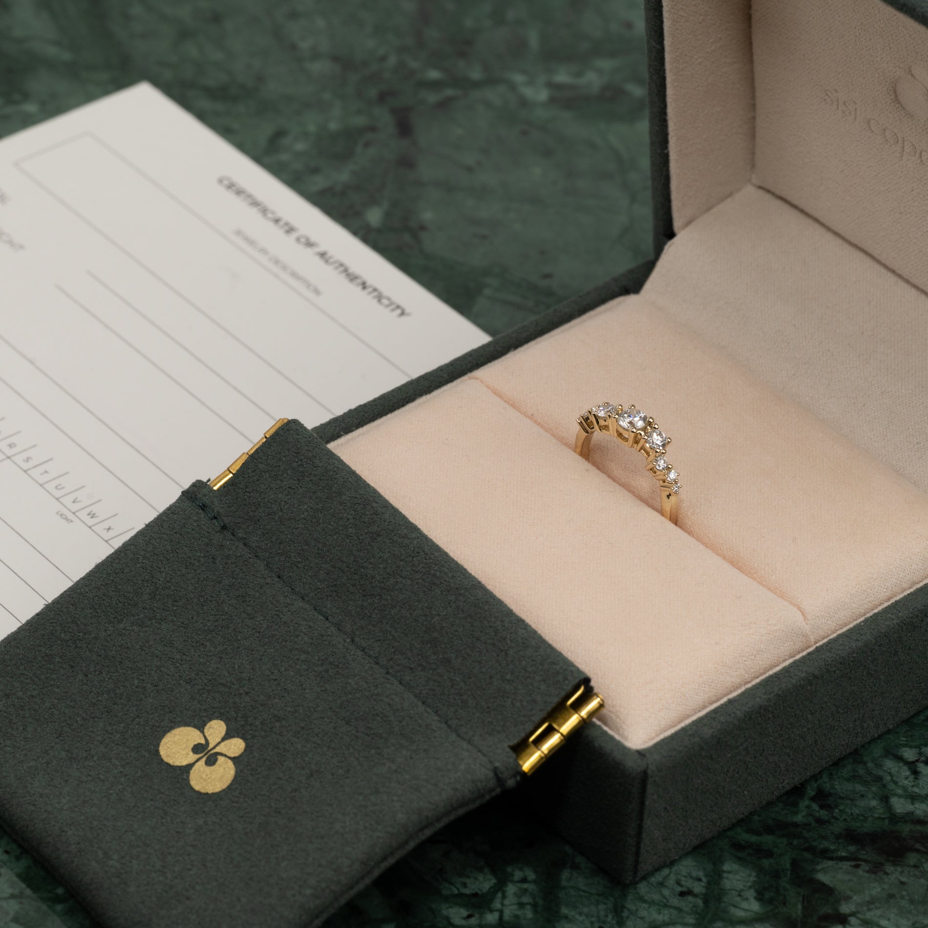 Ringen er i 14 karat massivt guld med ni lab-grown diamanter på i alt 0,7 ct. Diamanterne har farven E/F (River) og klarheden VVS. Smykket er skabt med omtanke; diamanterne er blandt andet fremstillet med solenergi, og guldet er 100% certificeret genanvendt.
