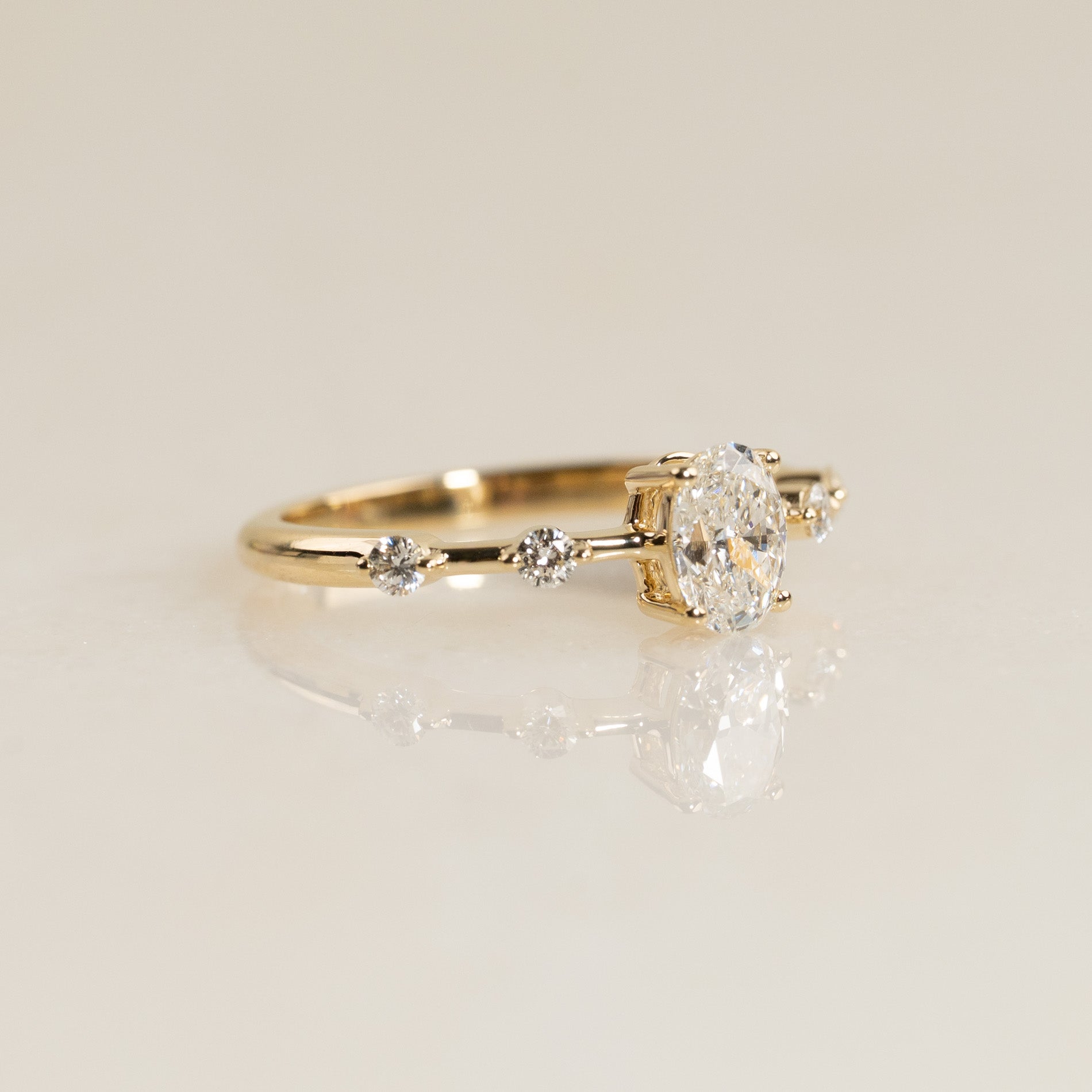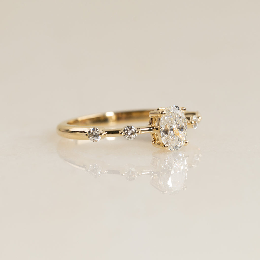 Ringen er fremstillet i 14 karat guld og har et romantisk og tidløst udtryk. I centrum sidder en 0,60 ct. oval-slebet, minet diamant, der fremhæves af to sidesten på hver side af ringskinnen, hvilket tilfører ringen et personligt og feminint præg.