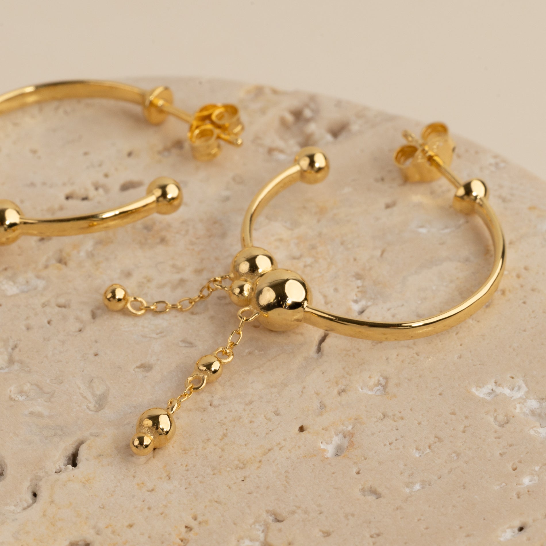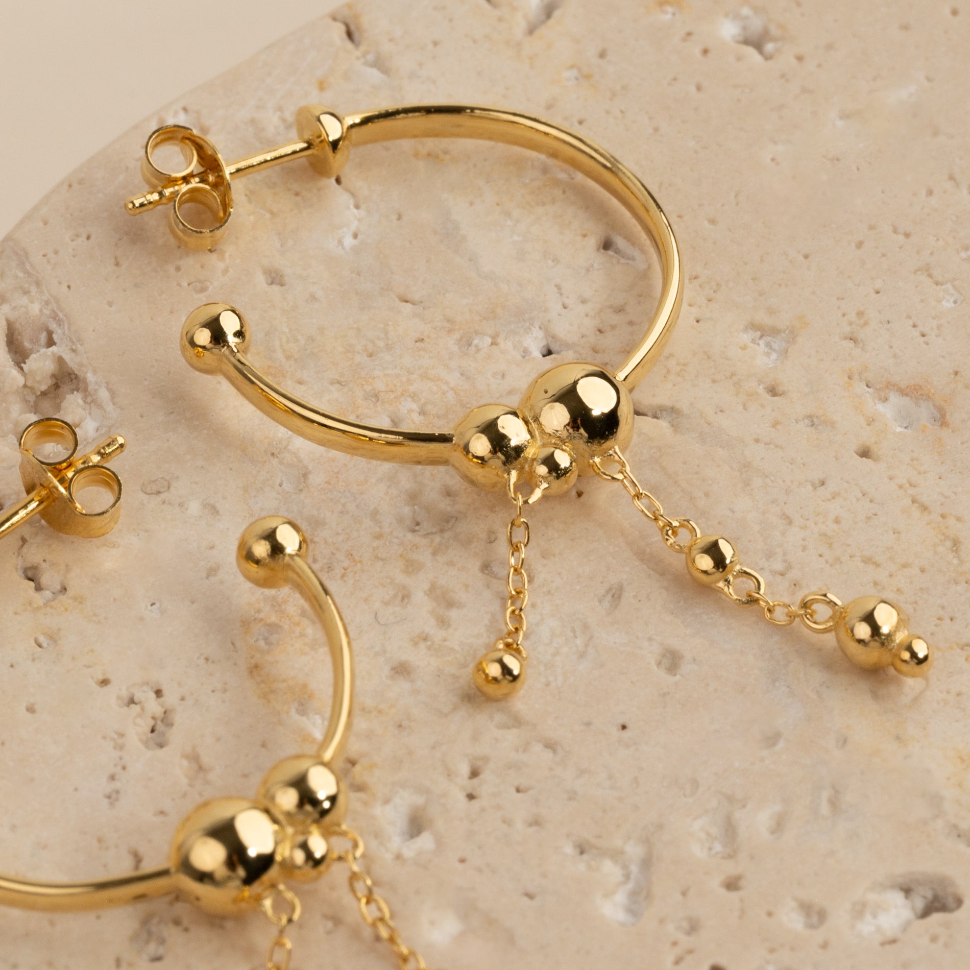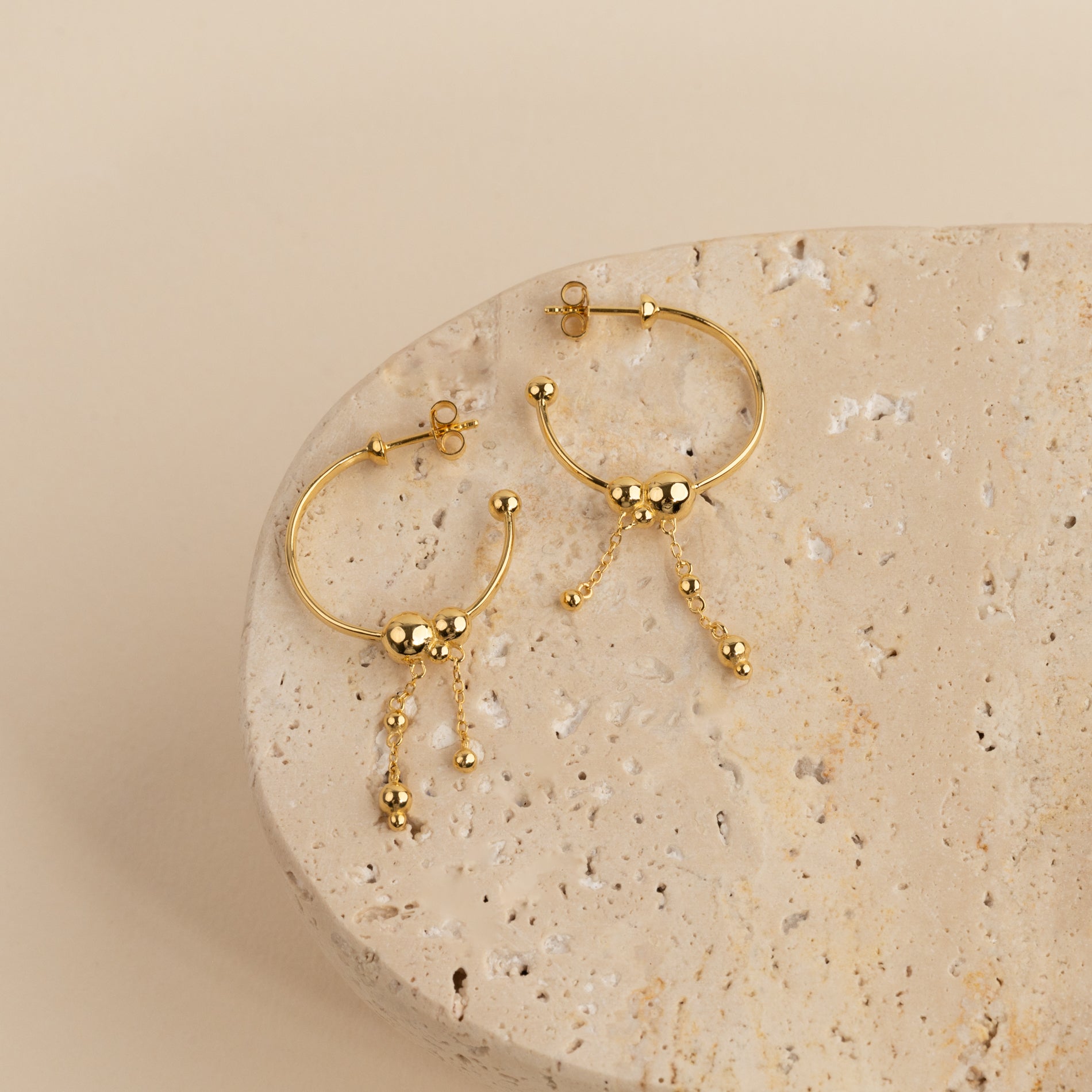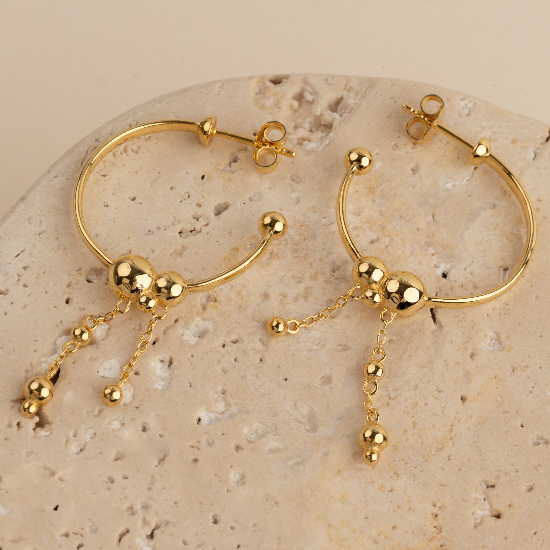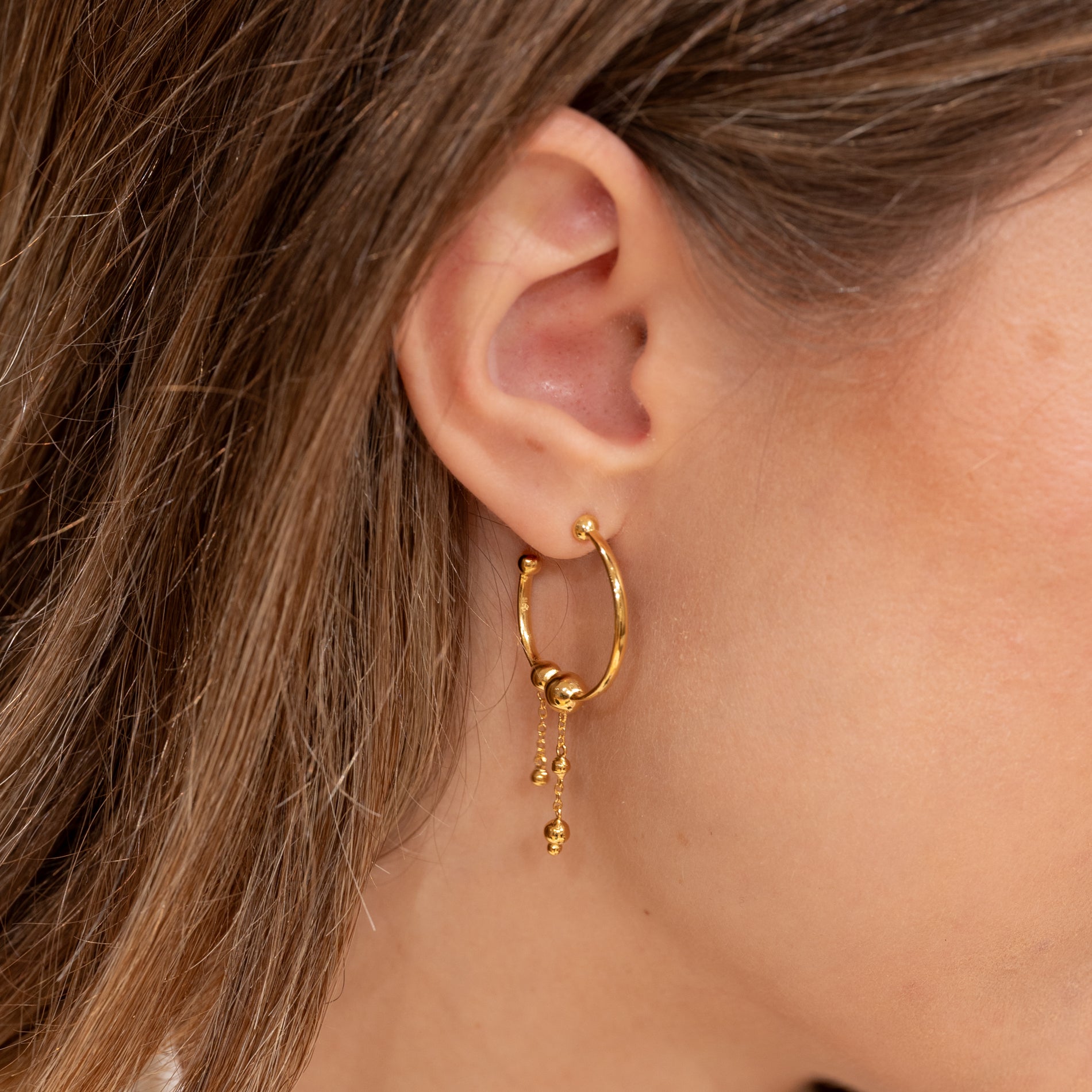 Disse unikke øreringe har et moderne og elegant udtryk, hvor små kugleformede elementer udsmykker de runde creoler. Fra bunden hænger to fine kæder, der bevæger sig let og giver øreringene et feminint og iøjnefaldende udtryk.