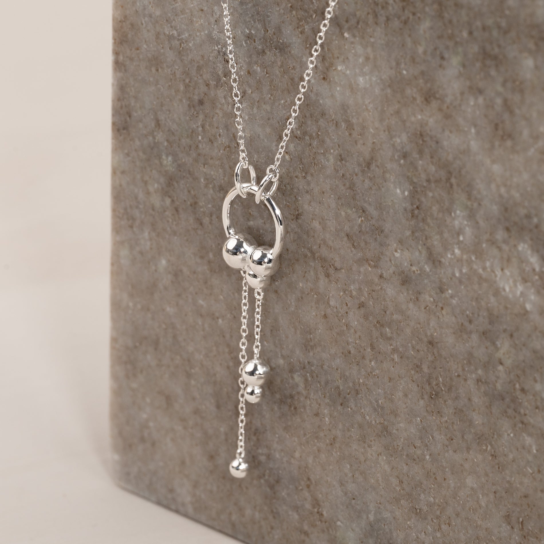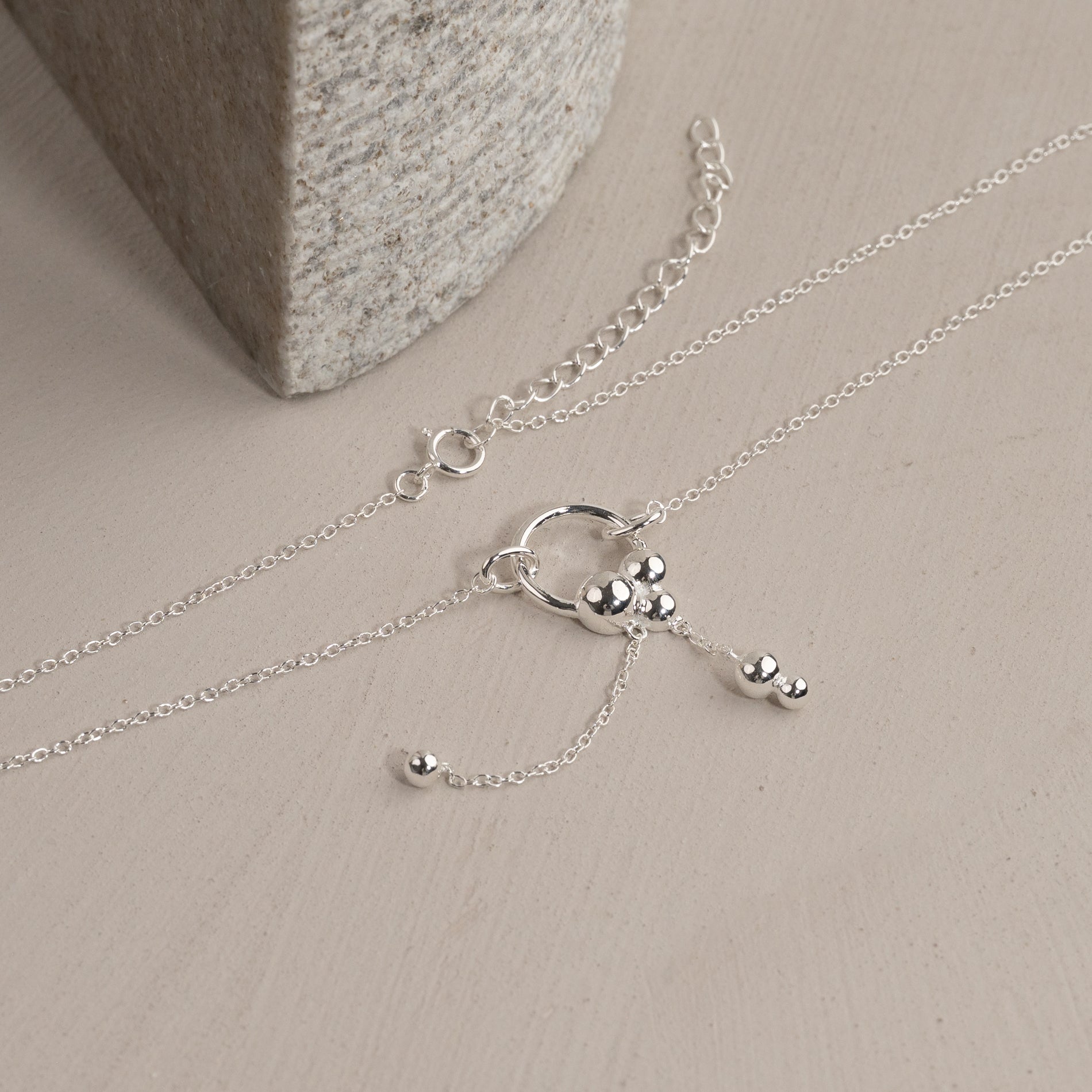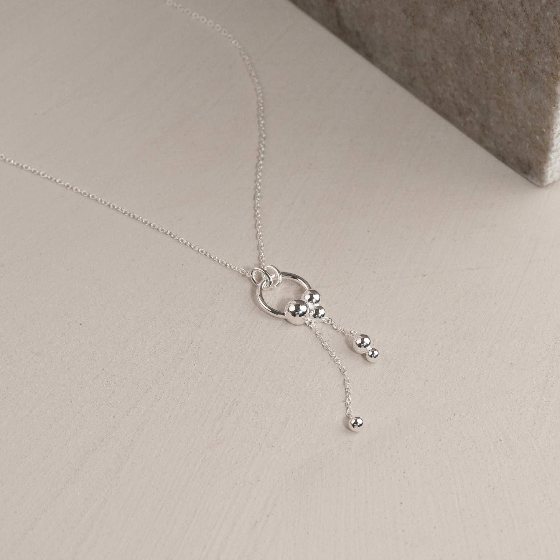 Denne unikke halskæde er lavet med en klassisk kæde og et integreret cirkelvedhæng, udsmykket med et skulpturelt kugledesign. Halskæden bevæger sig smukt og har et feminint og iøjnefaldende look.