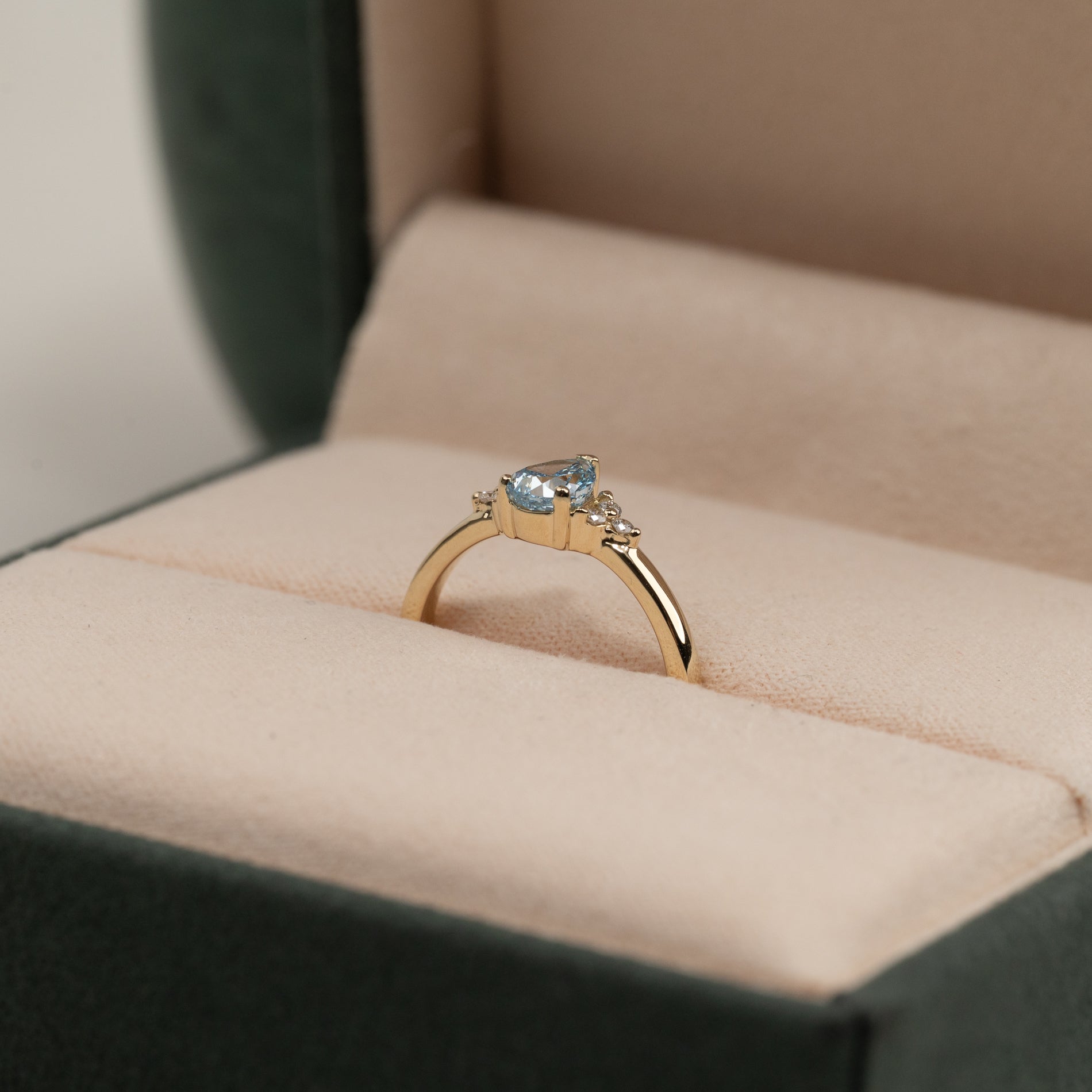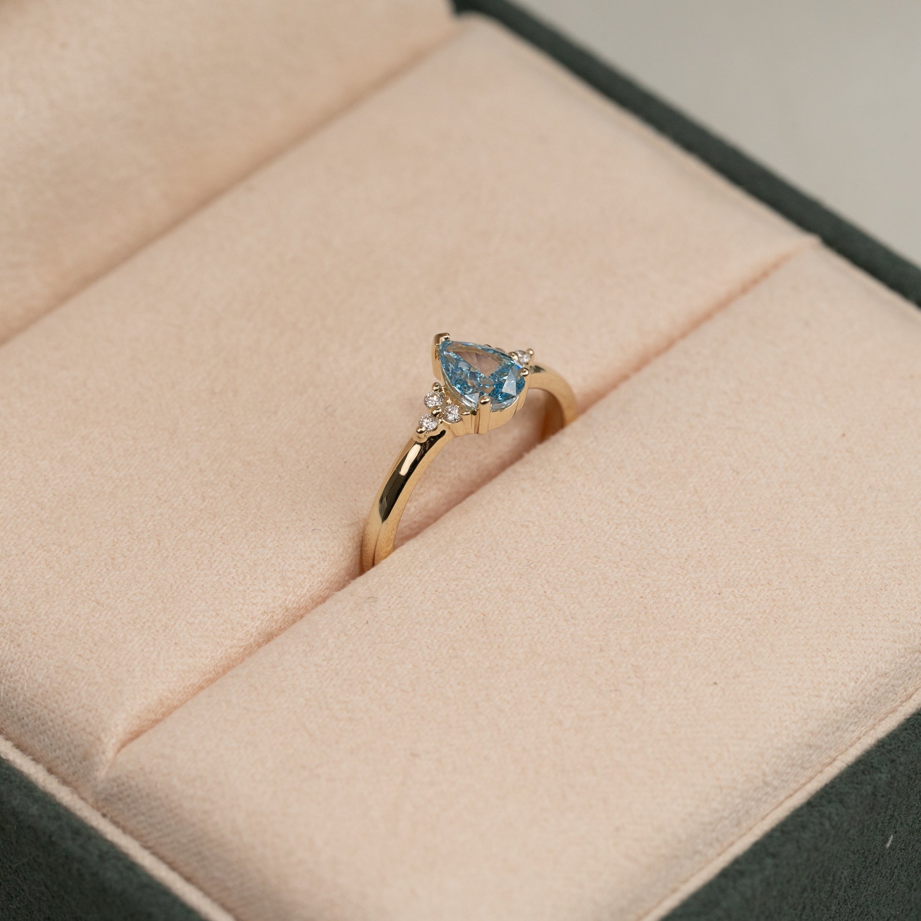 Ring i 14 karat guld med et unikt og detaljeret udtryk. I centrum sidder en smuk blå 0,6 ct. lab-grown pæreformet diamant, der fremhæves smukt af tre mindre diamanter på hver side. Tilsammen giver de ringen en samlet caratvægt på 0,65 ct.