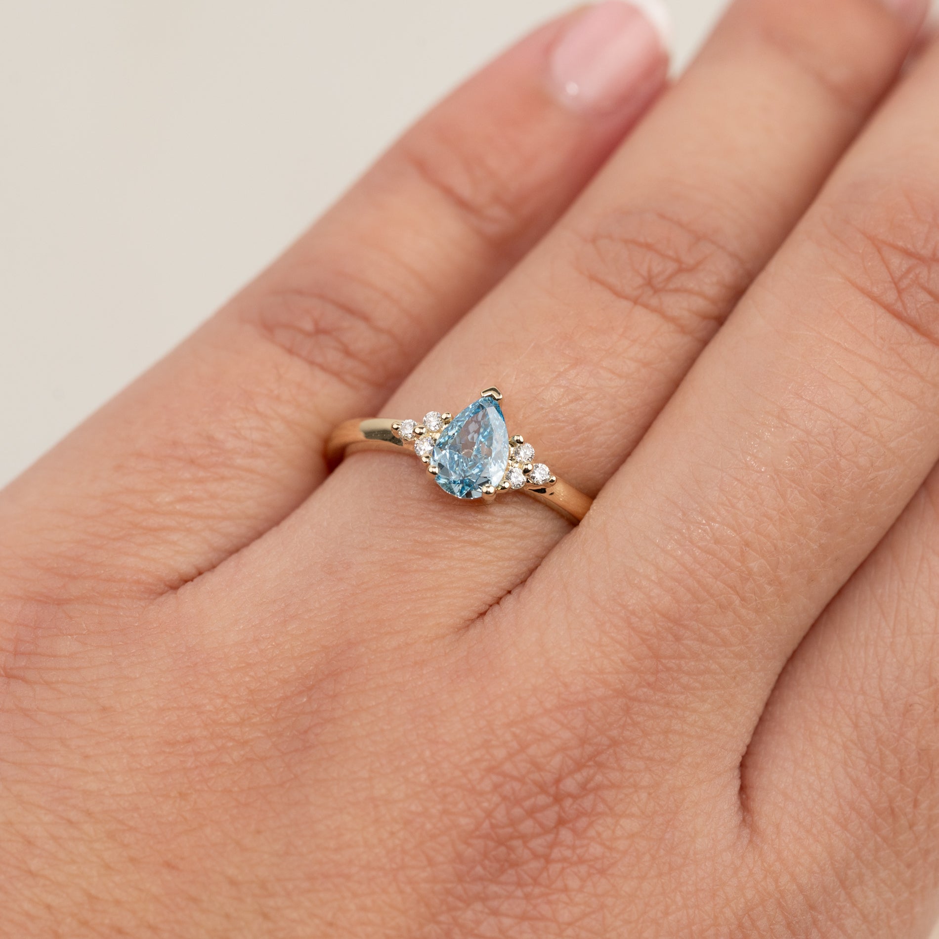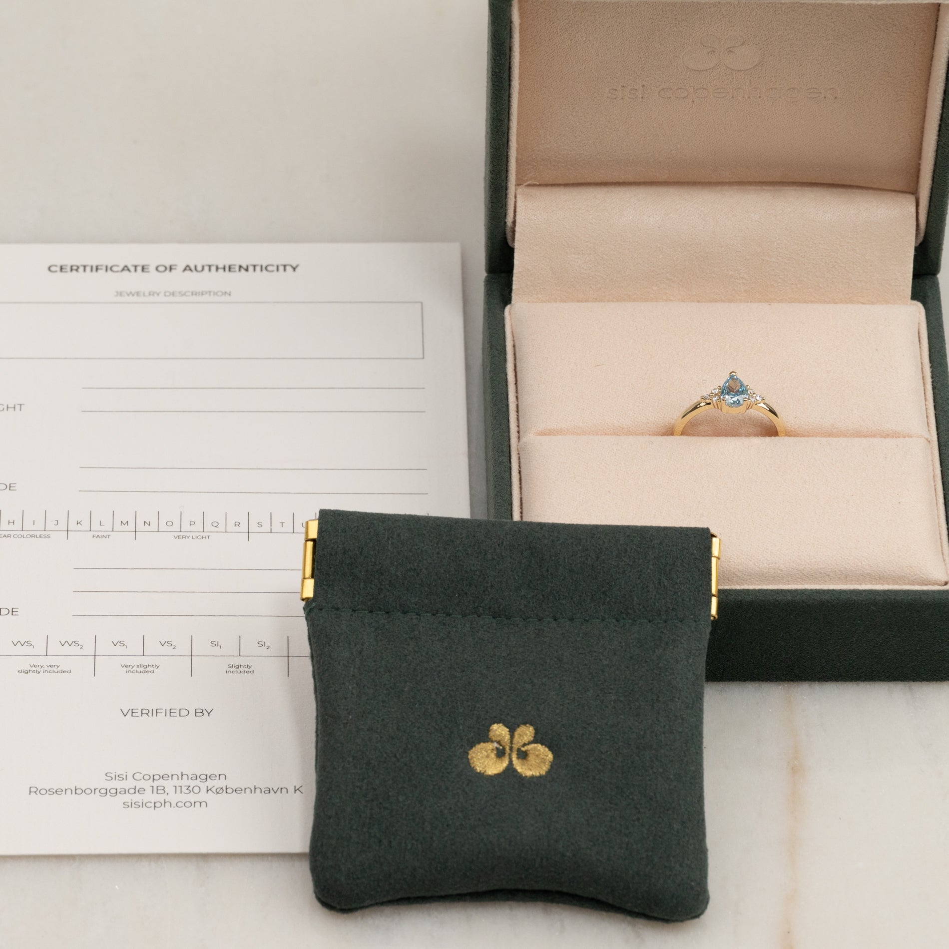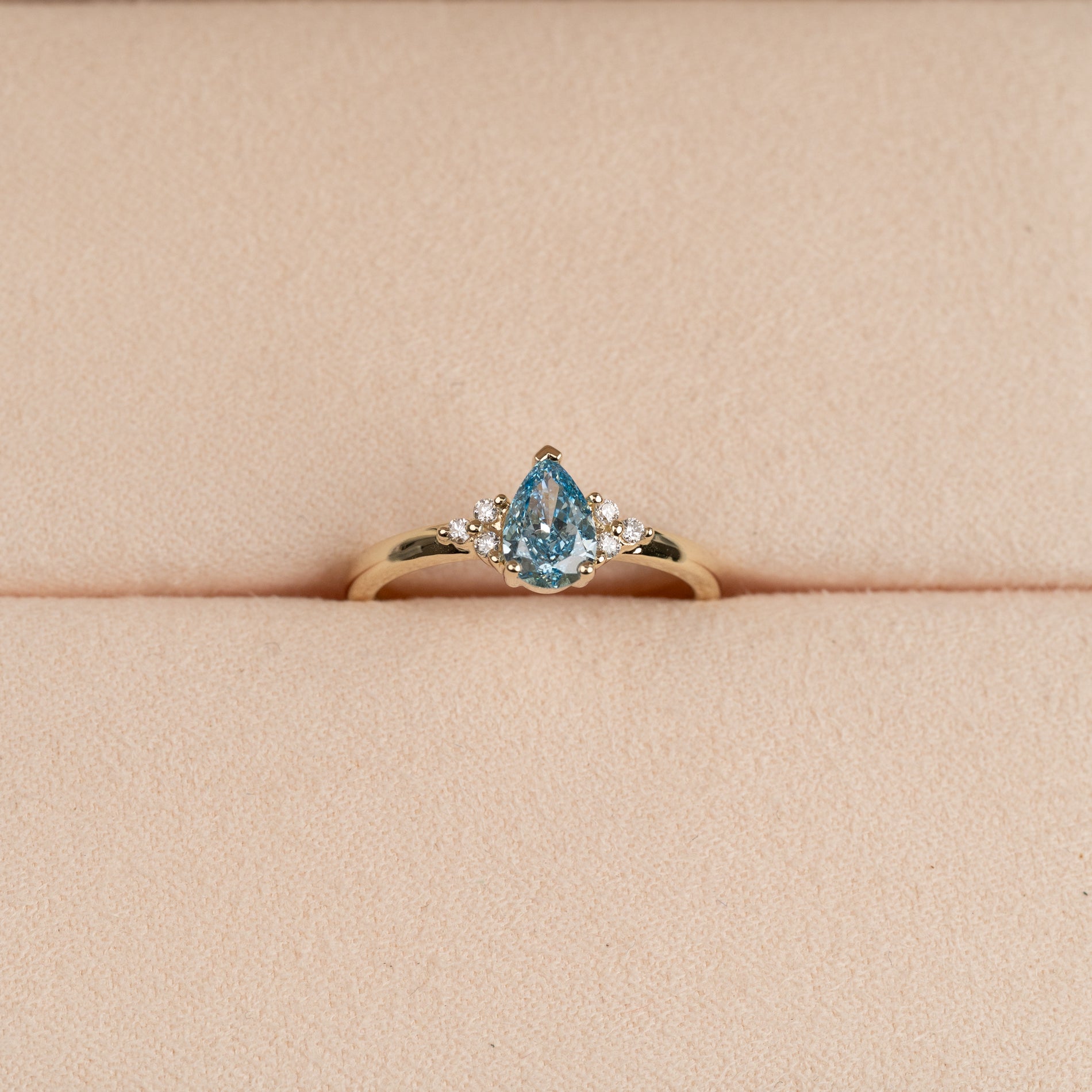 Ringen er fremstillet i 14 karat guld med en 0,60 ct pæreformet lab-grown diamant i farven Fancy Blue og klarheden VVS. Smykket er skabt med omtanke; diamanterne er produceret med blandt andet solenergi, og guldet er 100% certificeret genanvendt.