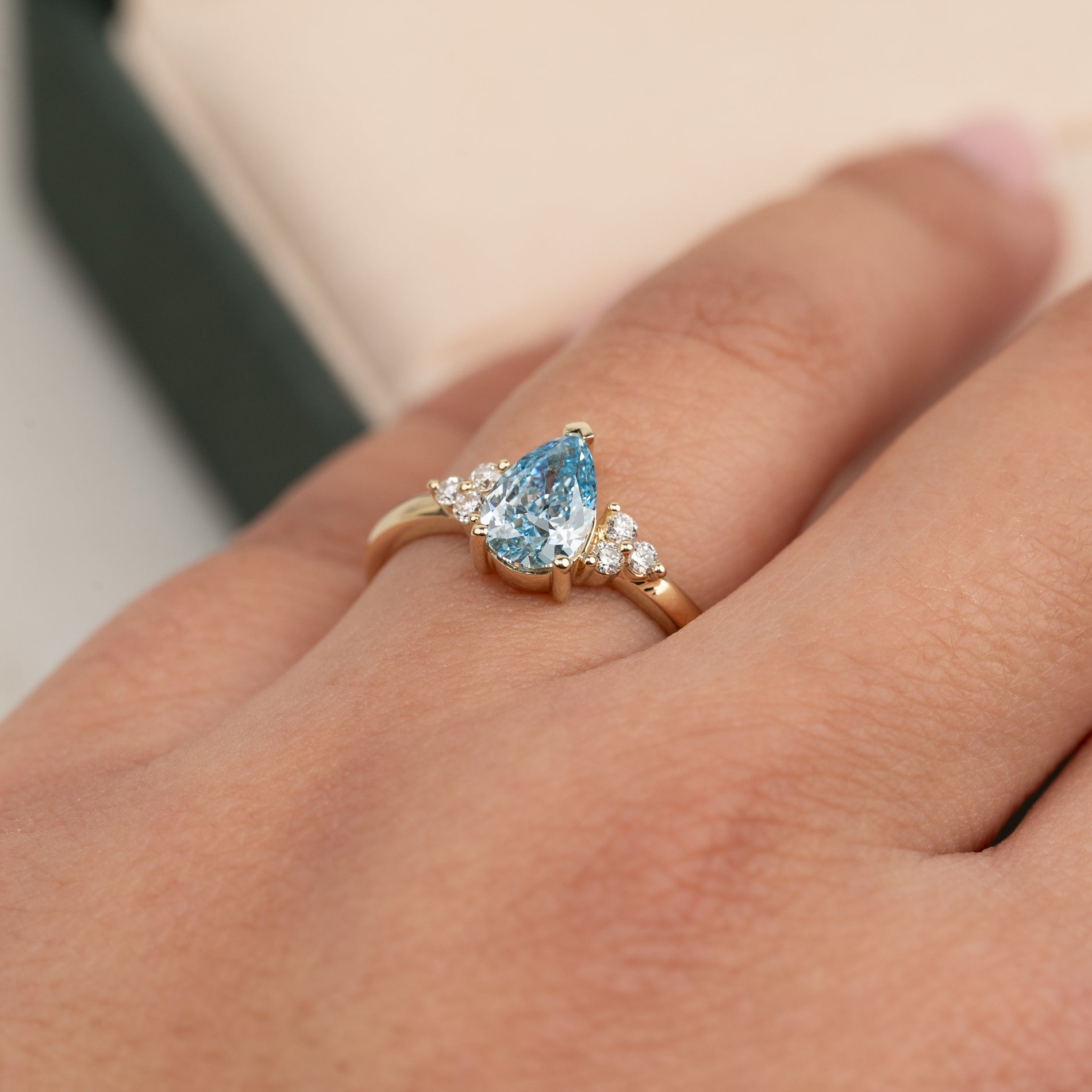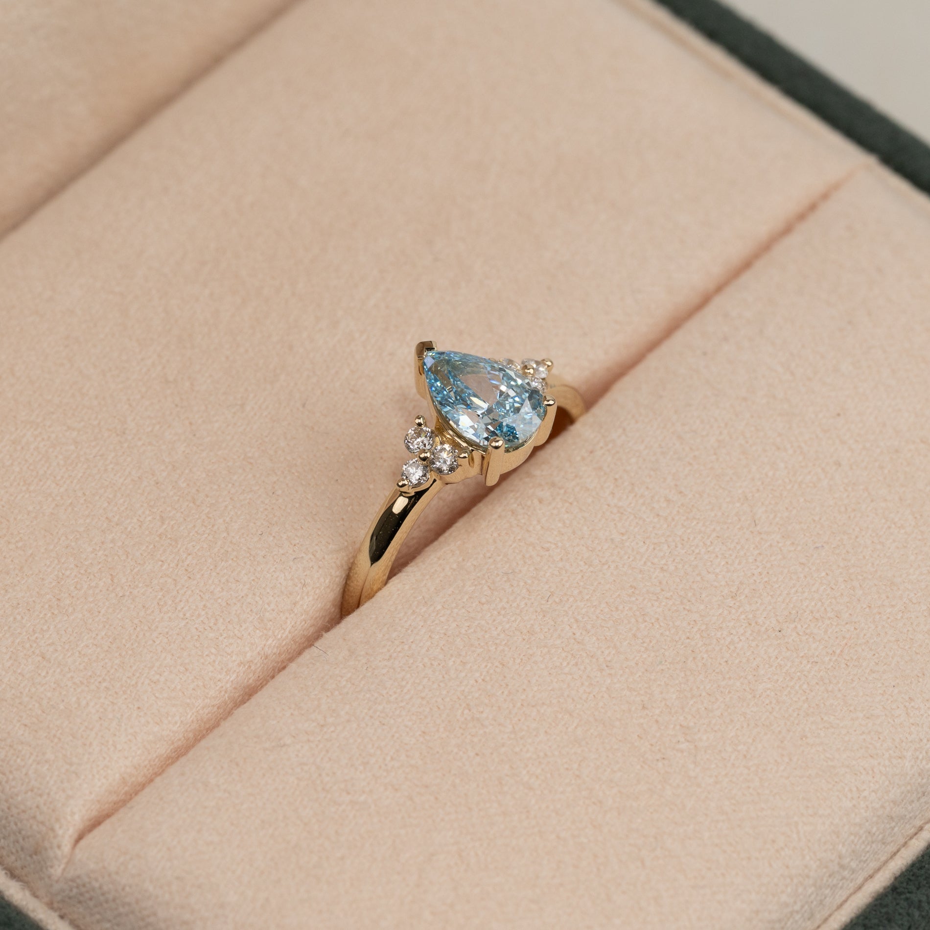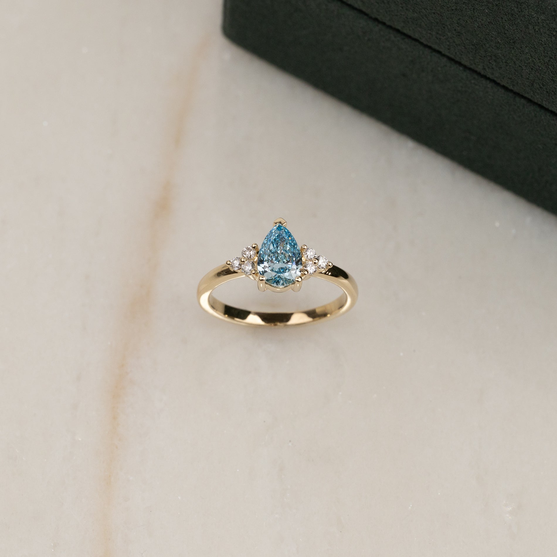 Ringen er fremstillet i 14 karat guld med en 1,0 ct. pæreformet lab-grown diamant i farven Fancy Blue og klarheden VVS. Smykket er skabt med omtanke; diamanterne er produceret med blandt andet solenergi, og guldet er 100% certificeret genanvendt.