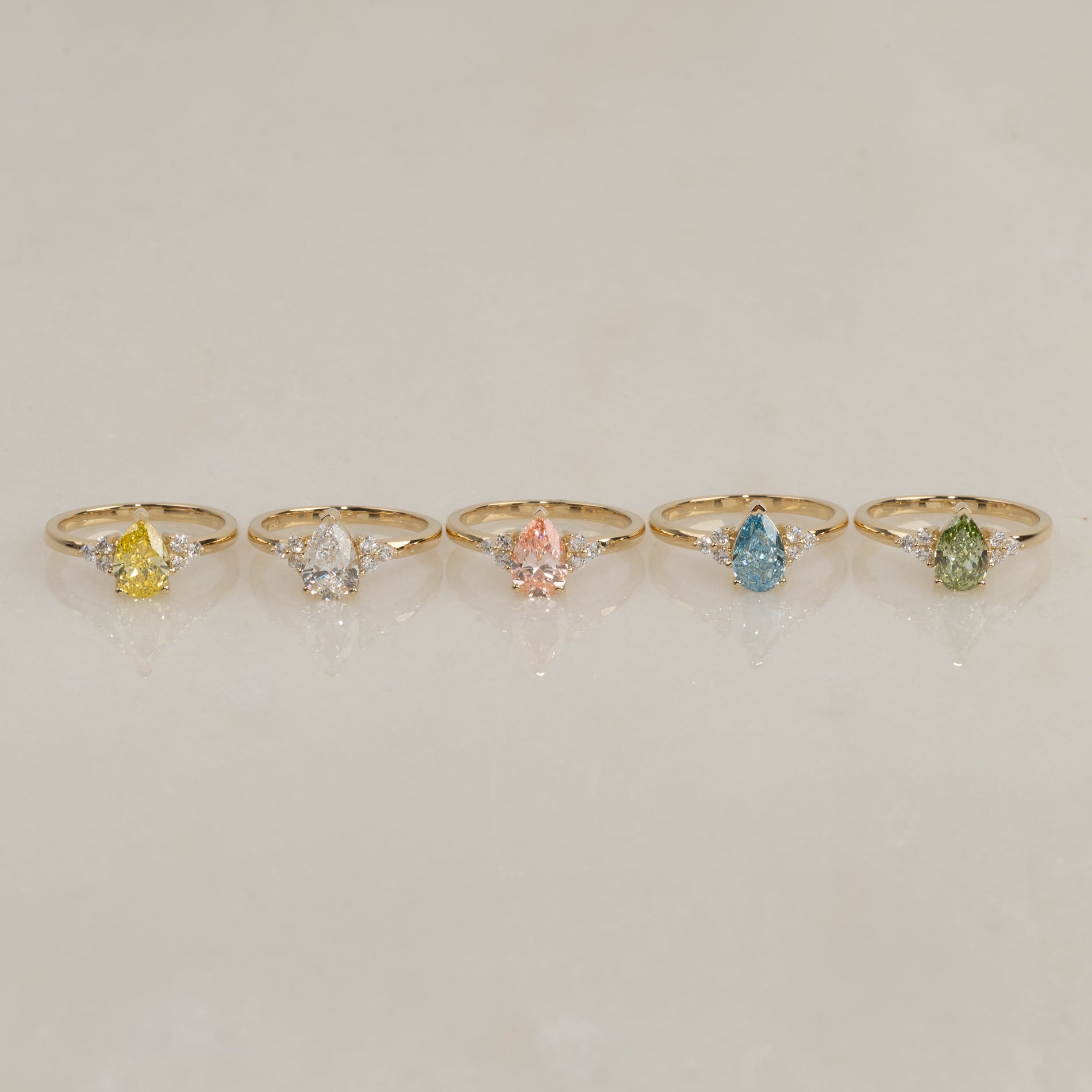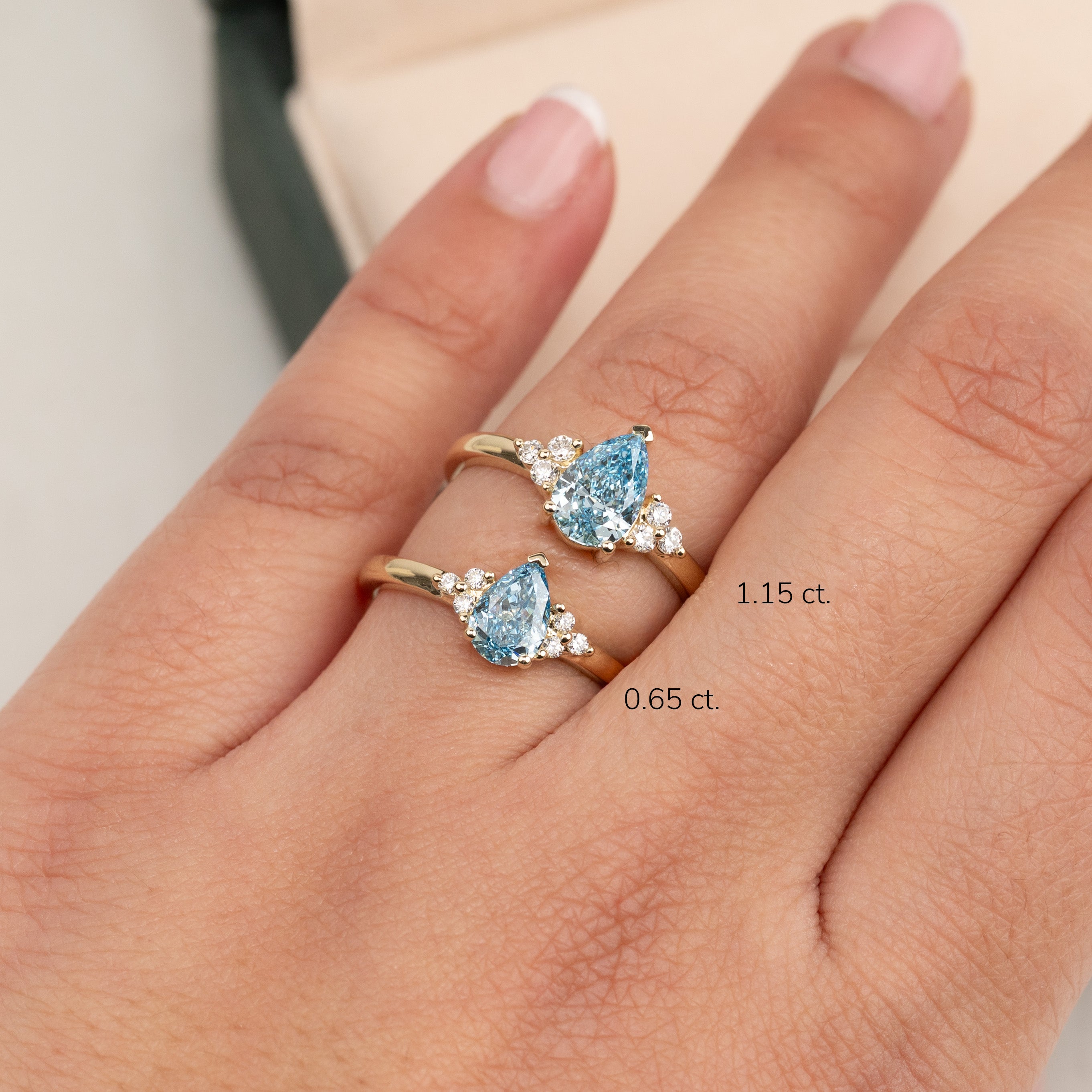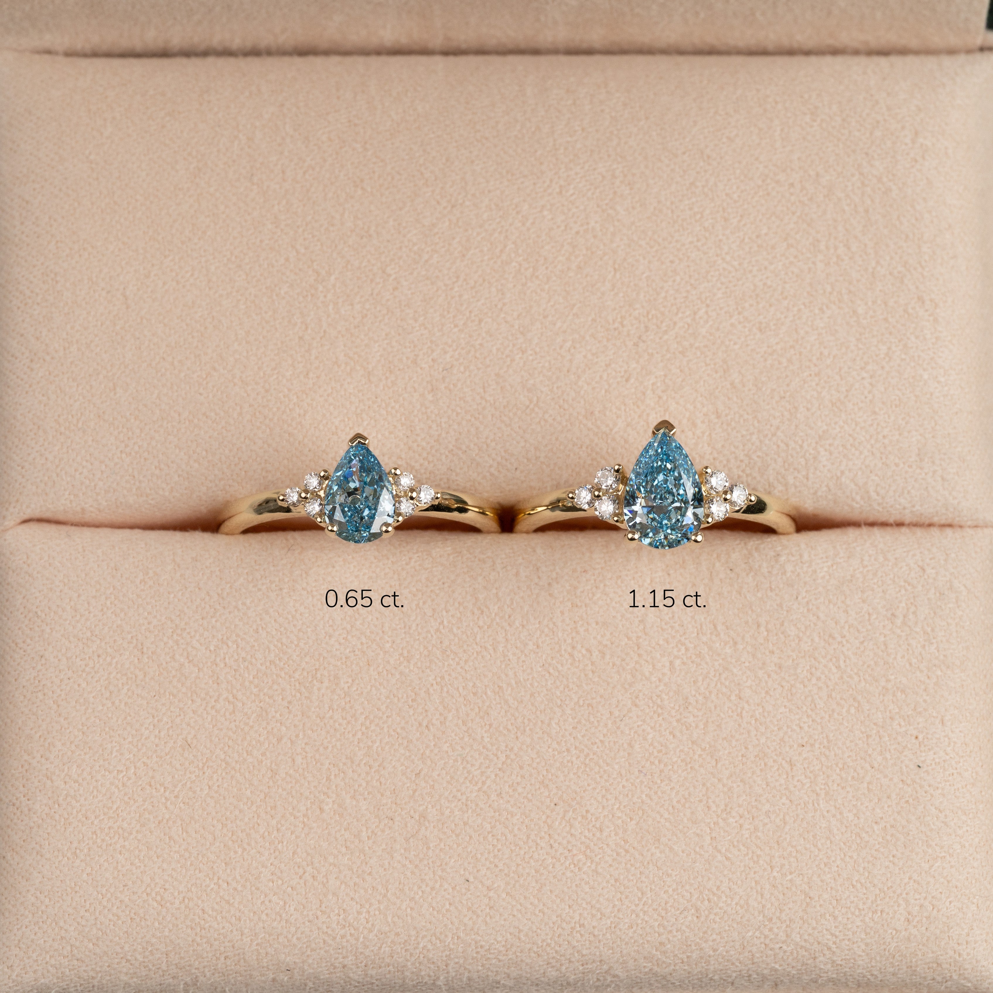 Ringen er fremstillet i 14 karat guld med en 1,0 ct. pæreformet lab-grown diamant i farven Fancy Blue og klarheden VVS. Smykket er skabt med omtanke; diamanterne er produceret med blandt andet solenergi, og guldet er 100% certificeret genanvendt.