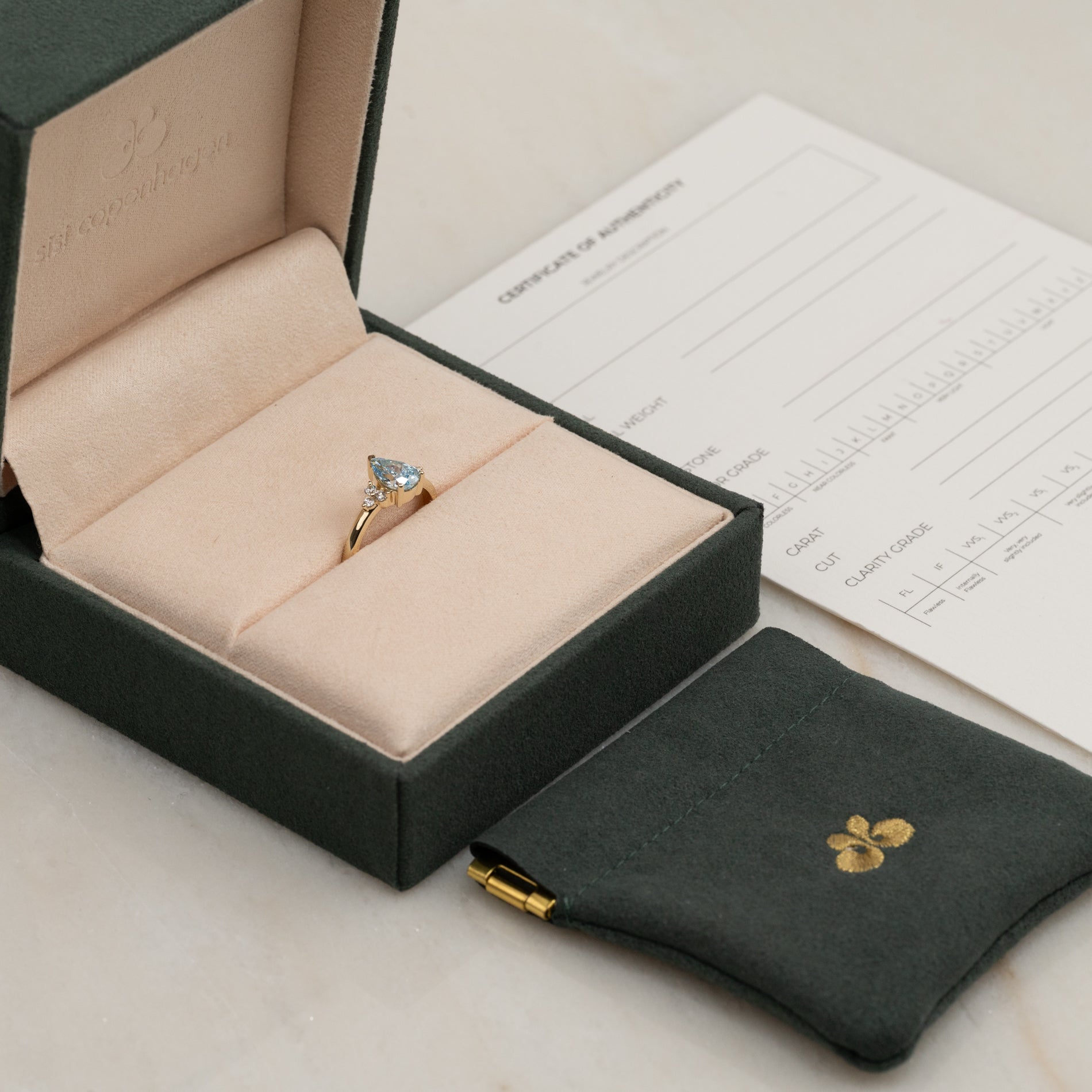 I boksen finder du en smykkeæske, pouch og 'certificate of authenticity'