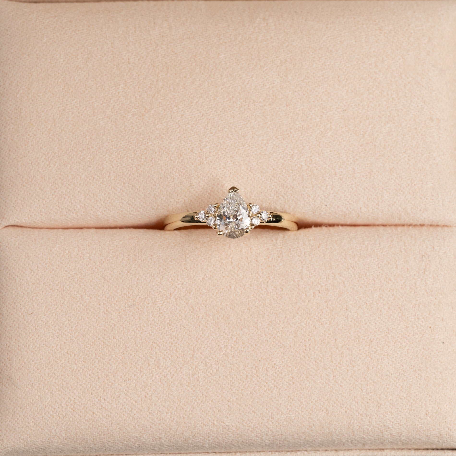 Ring i 14 karat guld med et unikt og detaljeret udtryk. I centrum sidder en smuk lab-grown pæreformet diamant, der fremhæves smukt af tre mindre diamanter på hver side.