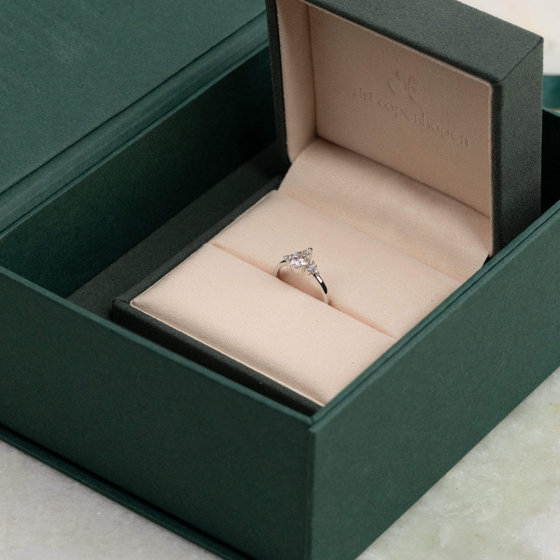 Ringen er fremstillet i 14 karat hvidguld med en 0,6 ct. pæreformet lab-grown diamant i farve E-F (River) og klarheden VVS. Smykket er skabt med omtanke; diamanterne er produceret med blandt andet solenergi, og guldet er 100% certificeret genanvendt.