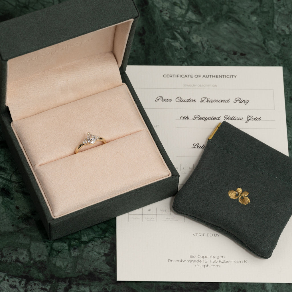 Ringen er fremstillet i 14 karat guld med en 0,6 ct. pæreformet lab-grown diamant i farve E-F (River) og klarheden VVS. Smykket er skabt med omtanke; diamanterne er produceret med blandt andet solenergi, og guldet er 100% certificeret genanvendt.