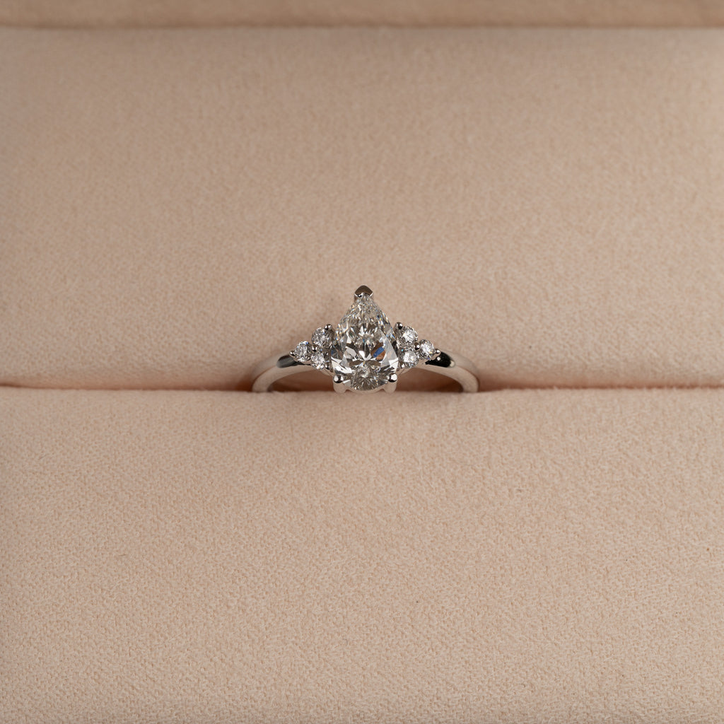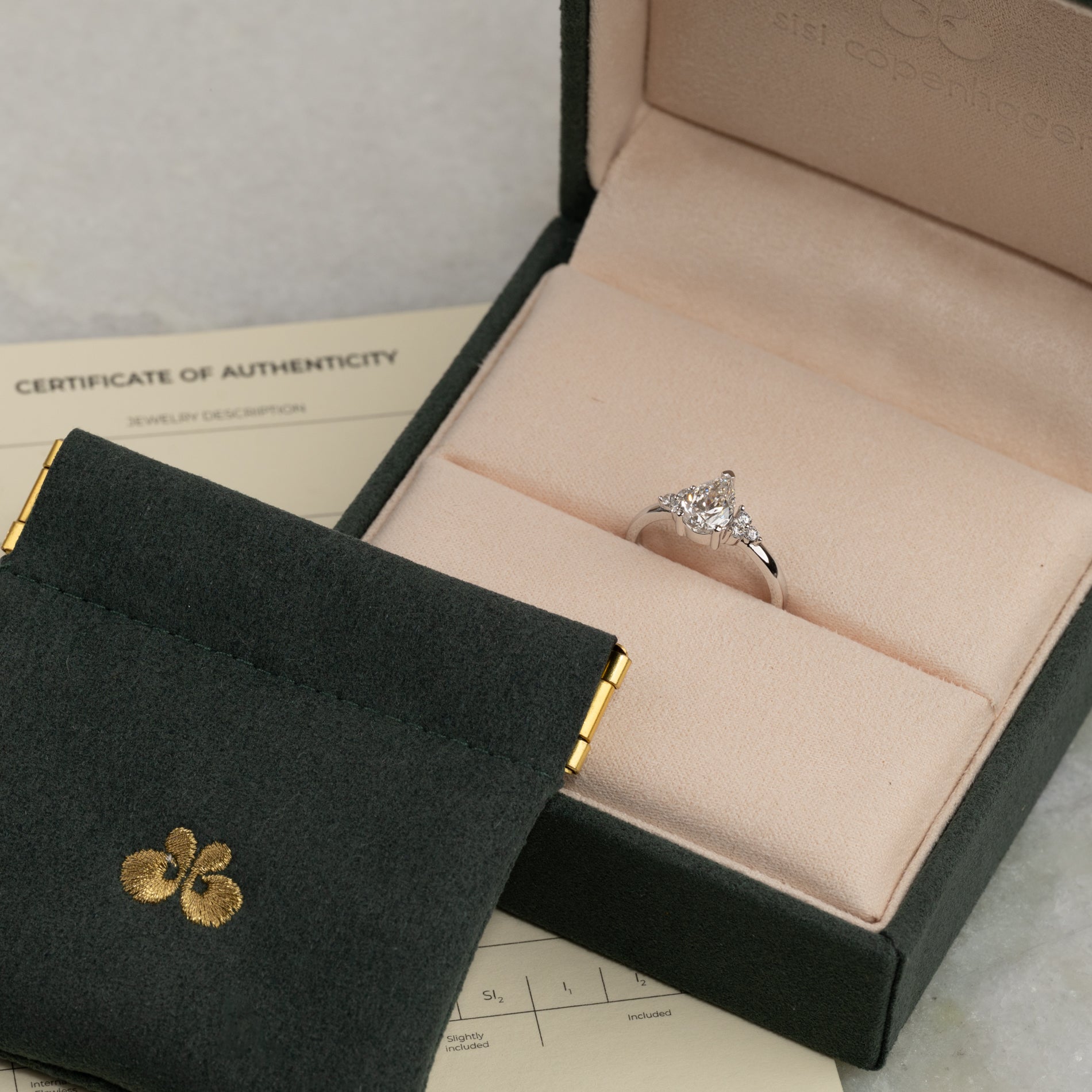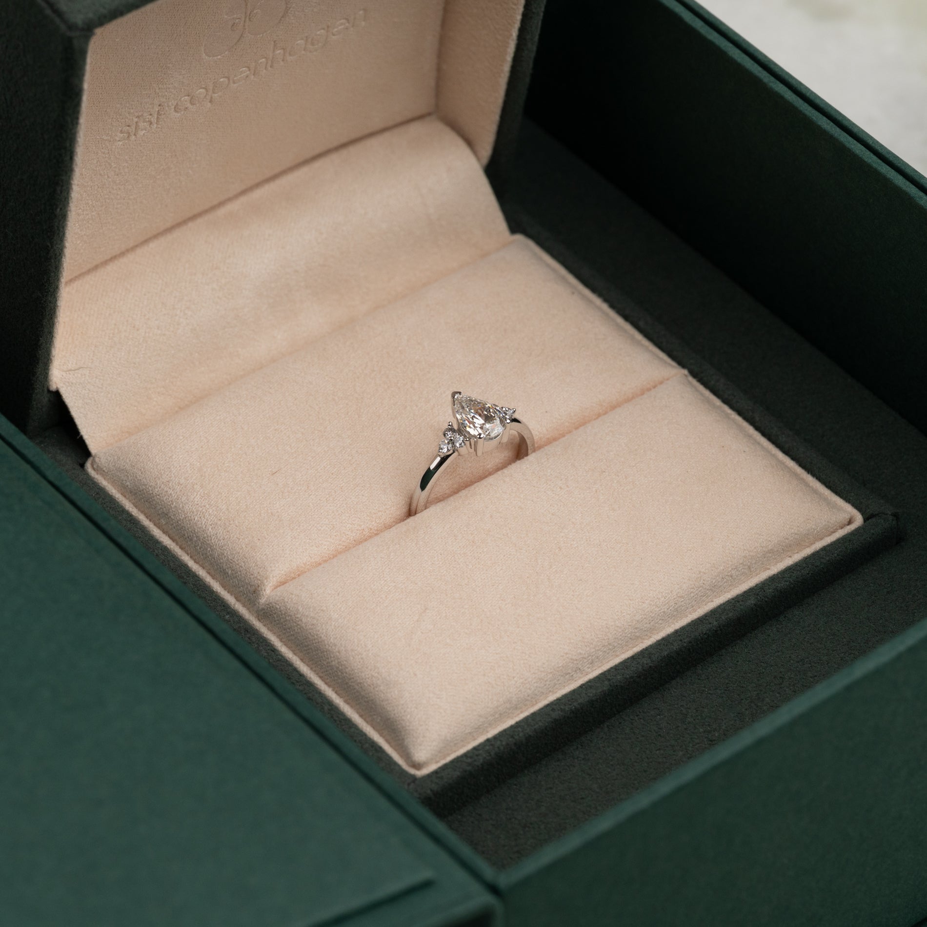 Ring i 14 karat hvidguld med et unikt og detaljeret udtryk. I centrum sidder en smuk 1,0 ct. lab-grown pæreformet diamant, der fremhæves smukt af tre mindre diamanter på hver side. Tilsammen giver de ringen en samlet caratvægt på 1,15 ct.