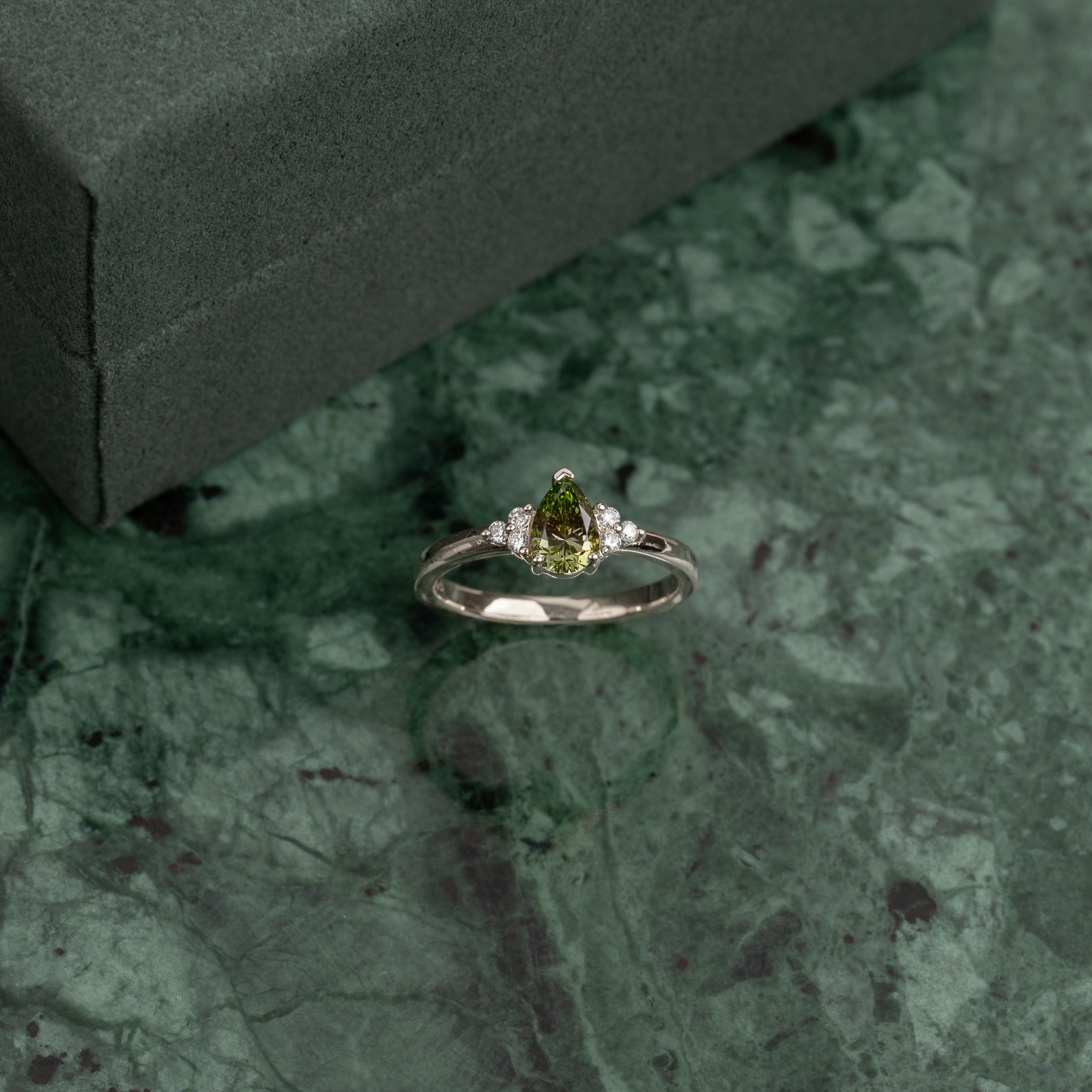 Den grønne diamant tilfører et romantisk og eventyrligt præg – perfekt til dig, der leder efter en unik forlovelsesring eller en elegant cocktailring med personlighed.