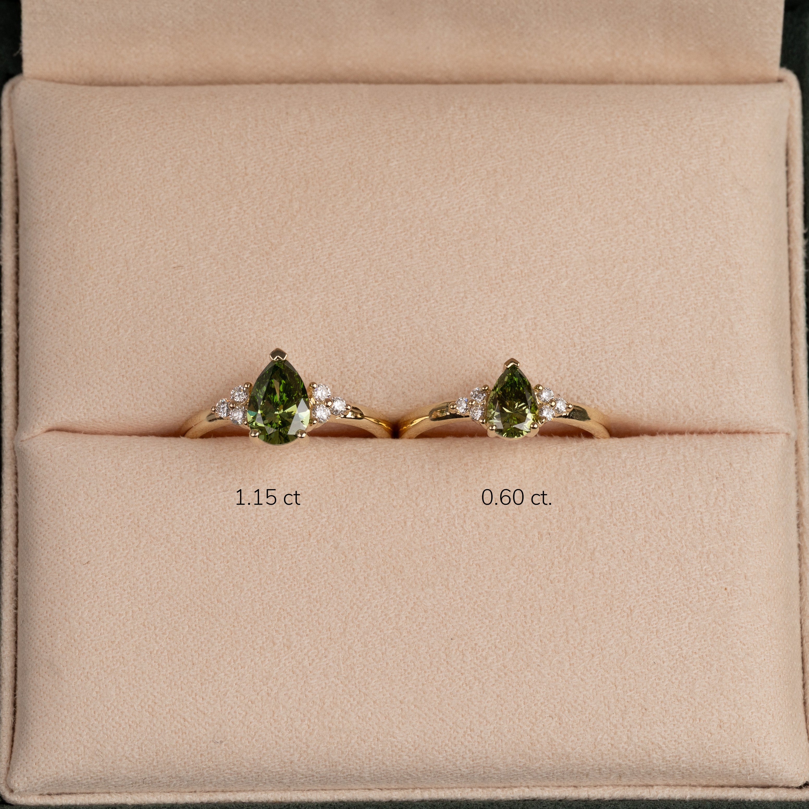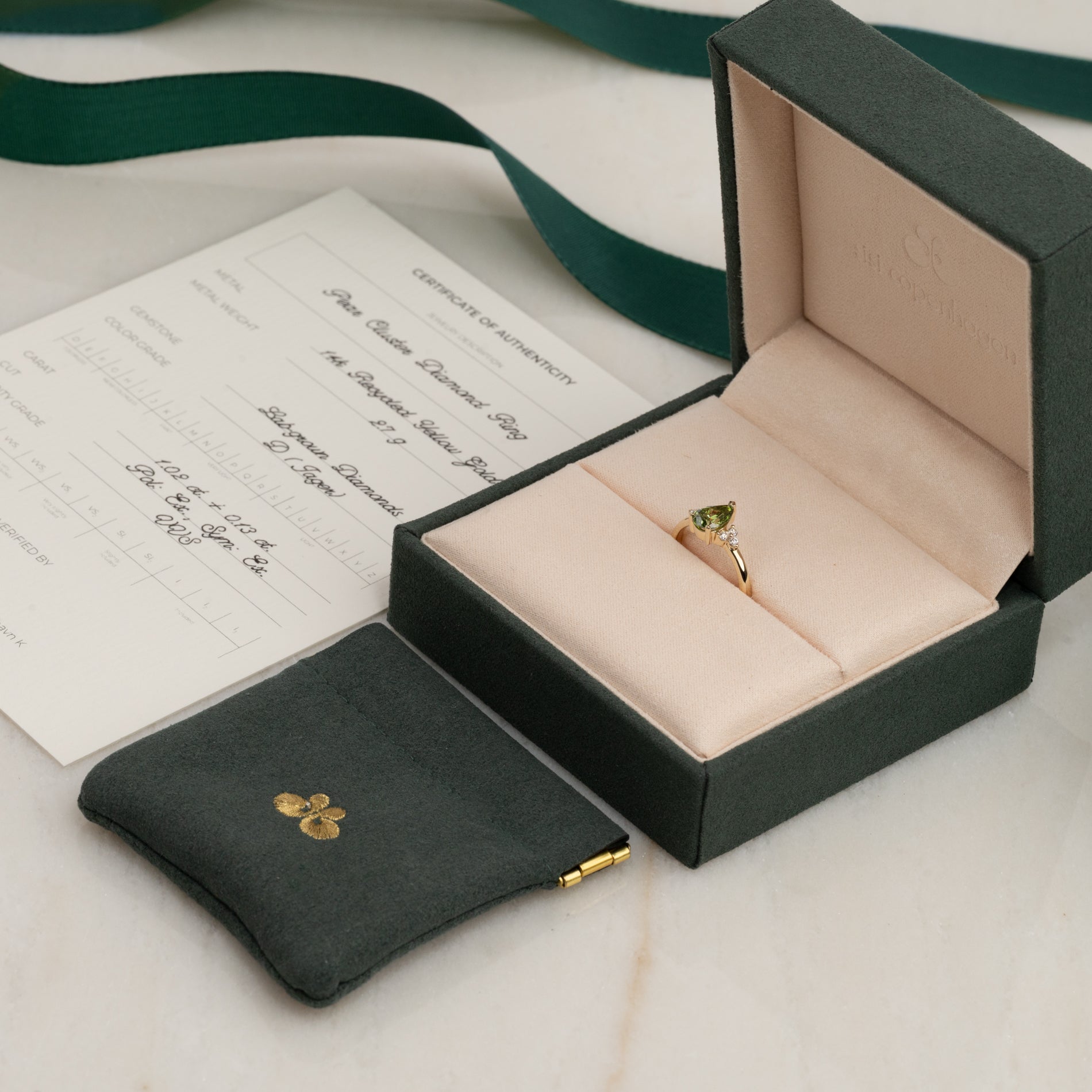 Den grønne diamant tilfører et romantisk og eventyrligt præg – perfekt til dig, der leder efter en unik forlovelsesring eller en elegant cocktailring med personlighed.