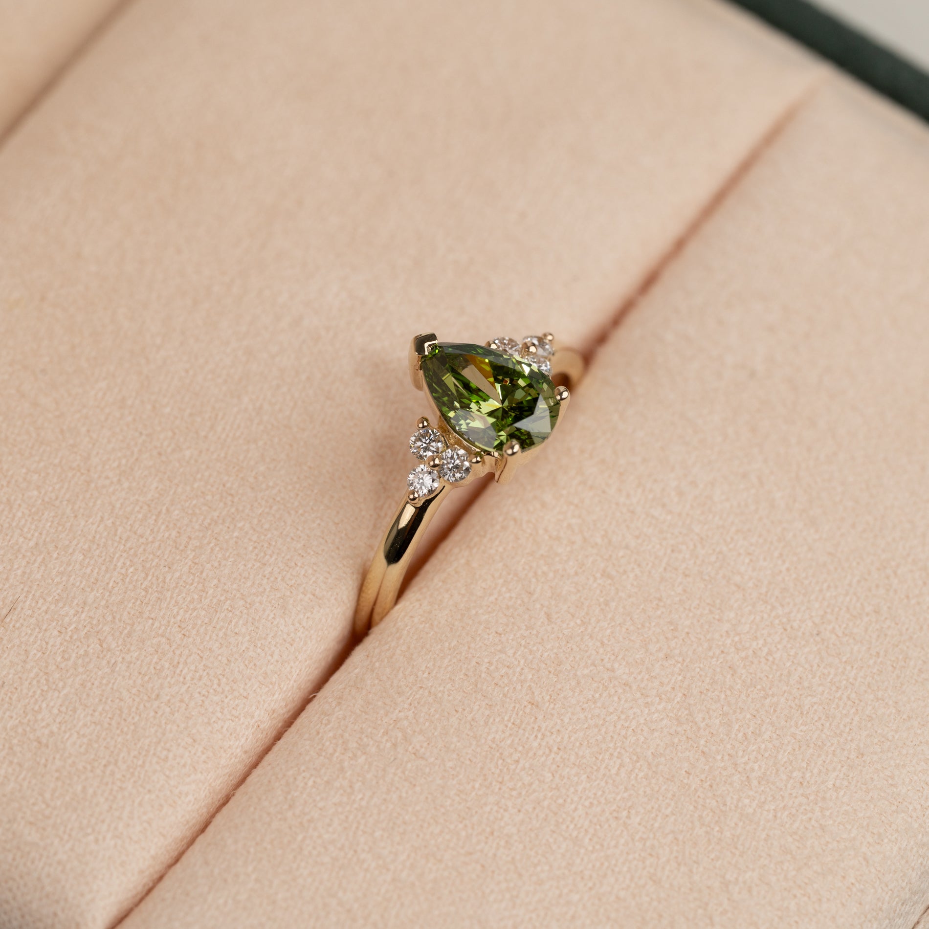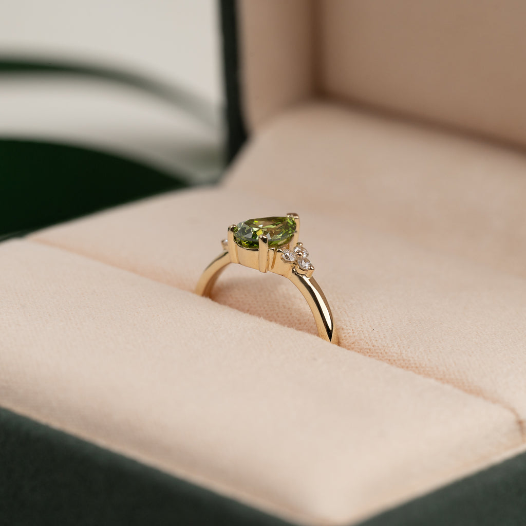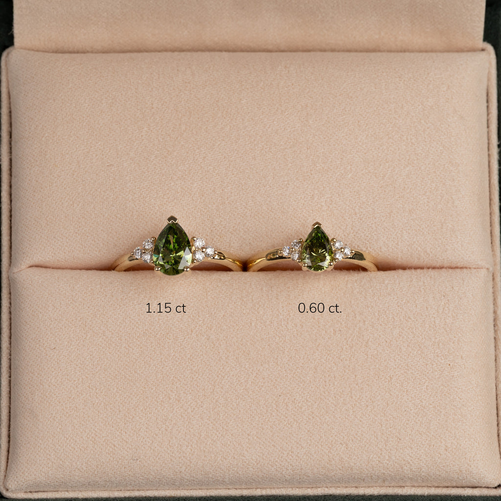 Ring i 14 karat guld med et unikt og detaljeret udtryk. I centrum sidder en smuk grøn 1,0 ct. lab-grown pæreformet diamant, der fremhæves smukt af tre mindre diamanter på hver side. Tilsammen giver de ringen en samlet caratvægt på 1,15 ct.