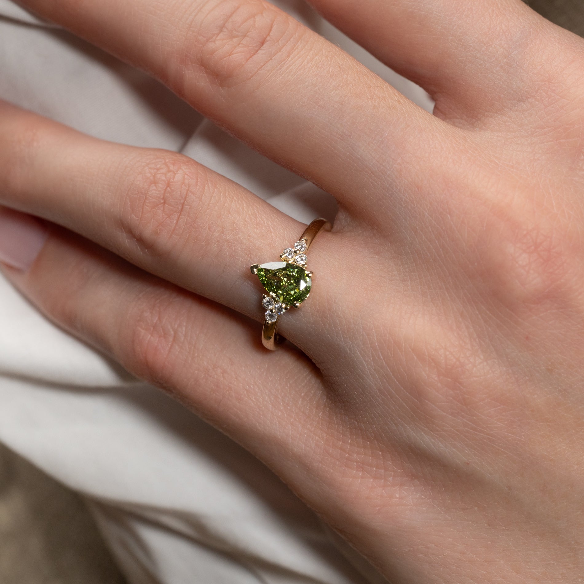 Ringen er fremstillet i 14 karat guld med en 1,0 ct. pæreformet lab-grown diamant i en smuk ‘fancy green’ farve og klarheden VVS. Smykket er skabt med omtanke; diamanterne er produceret med blandt andet solenergi, og guldet er 100% certificeret genanvendt.