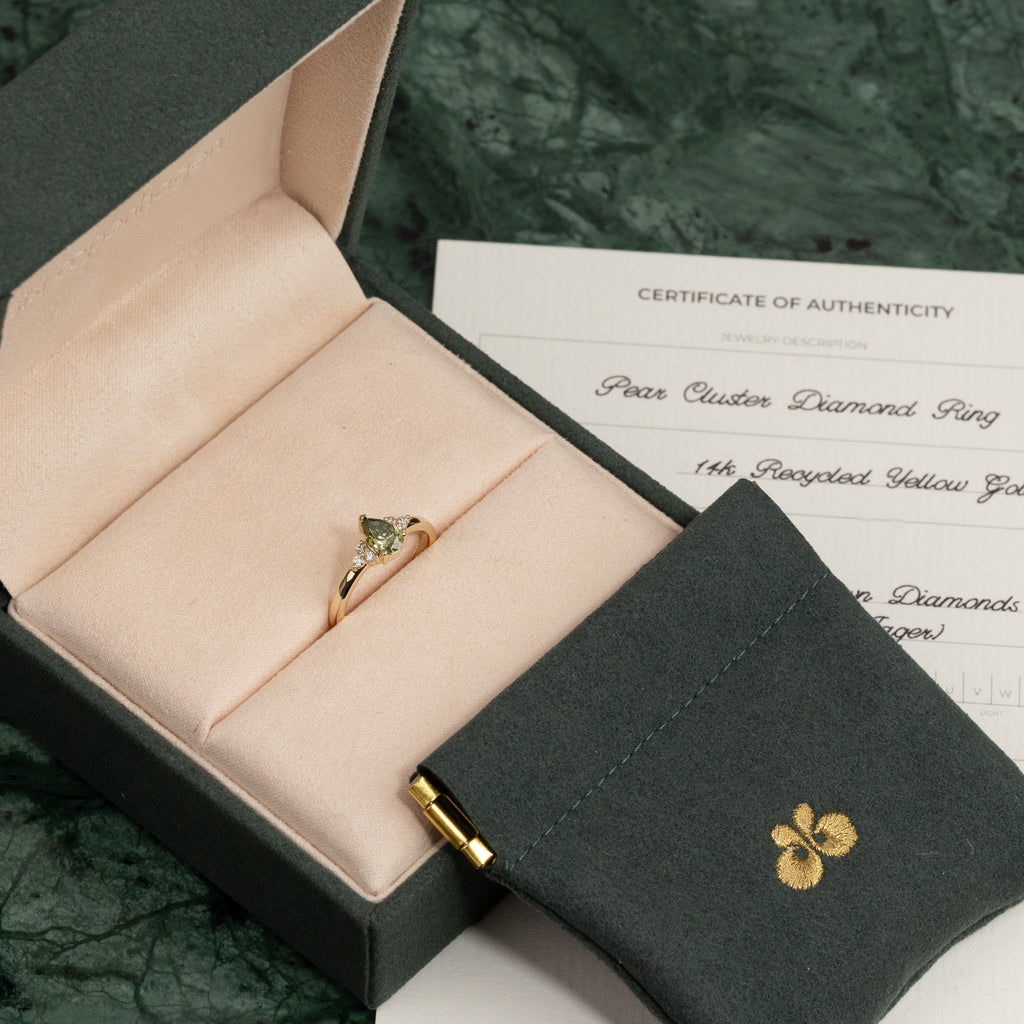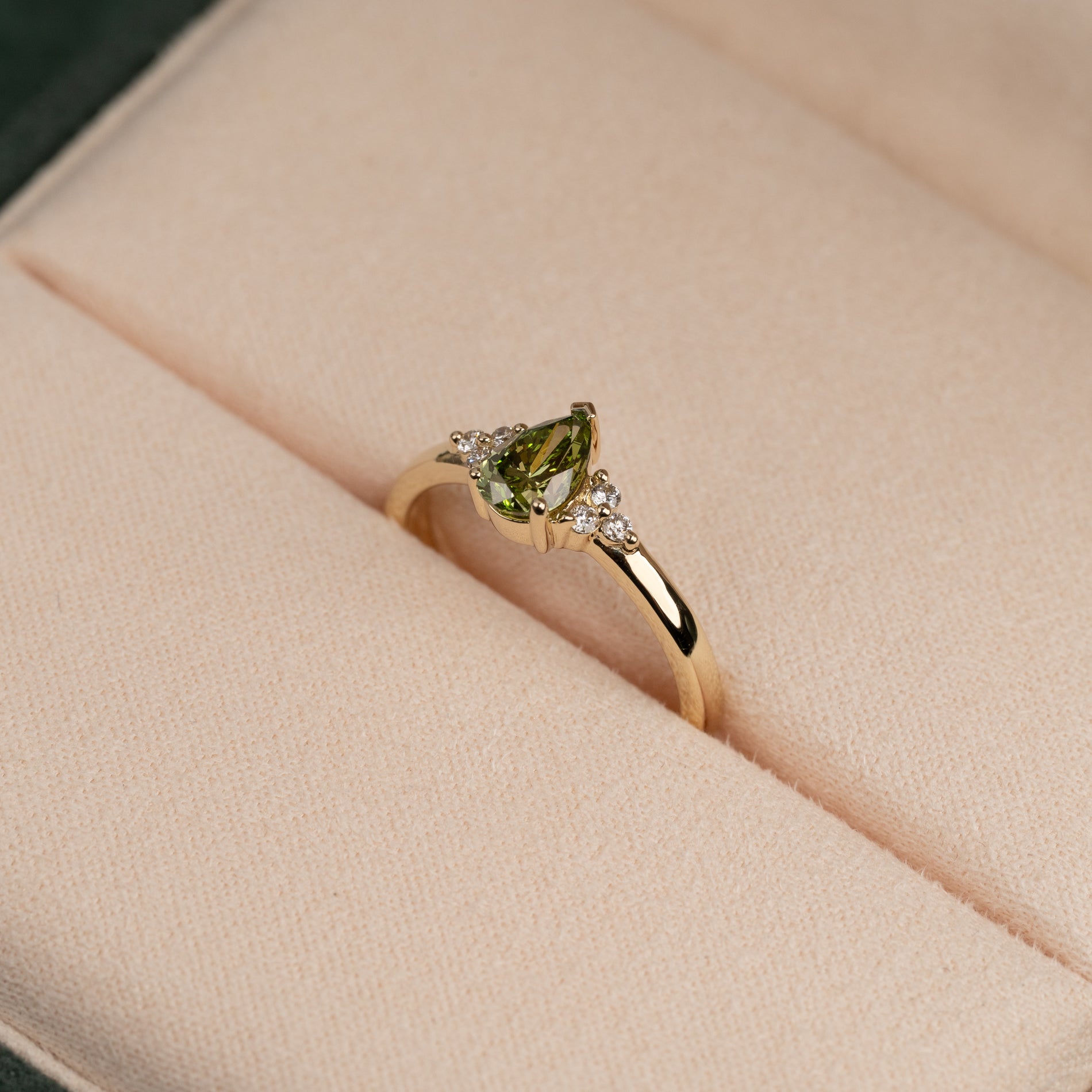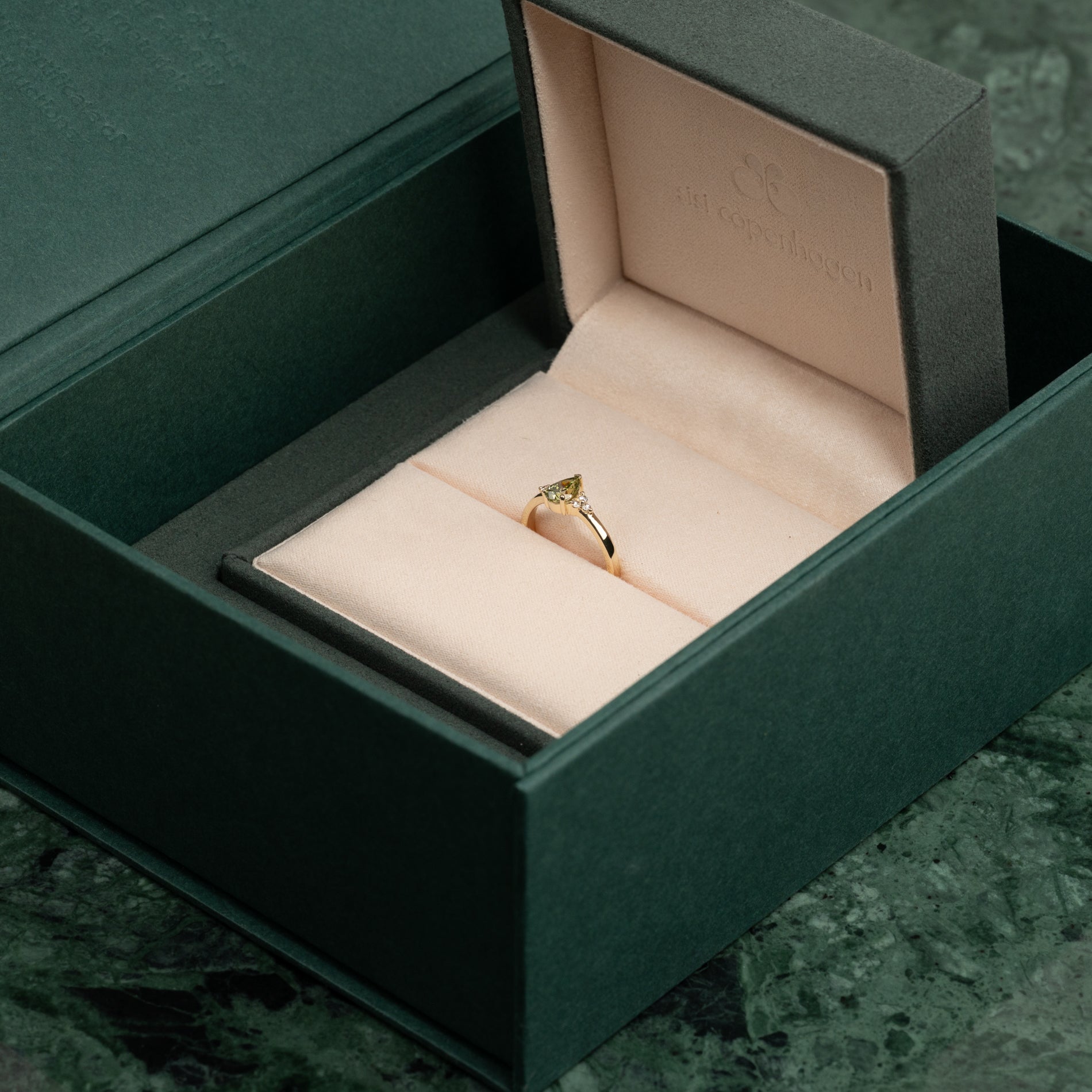 Ringen er fremstillet i 14 karat guld med en 0,6 ct. pæreformet lab-grown diamant i en smuk ‘fancy green’ farve og klarheden VVS. Smykket er skabt med omtanke; diamanterne er produceret med blandt andet solenergi, og guldet er 100% certificeret genanvendt.