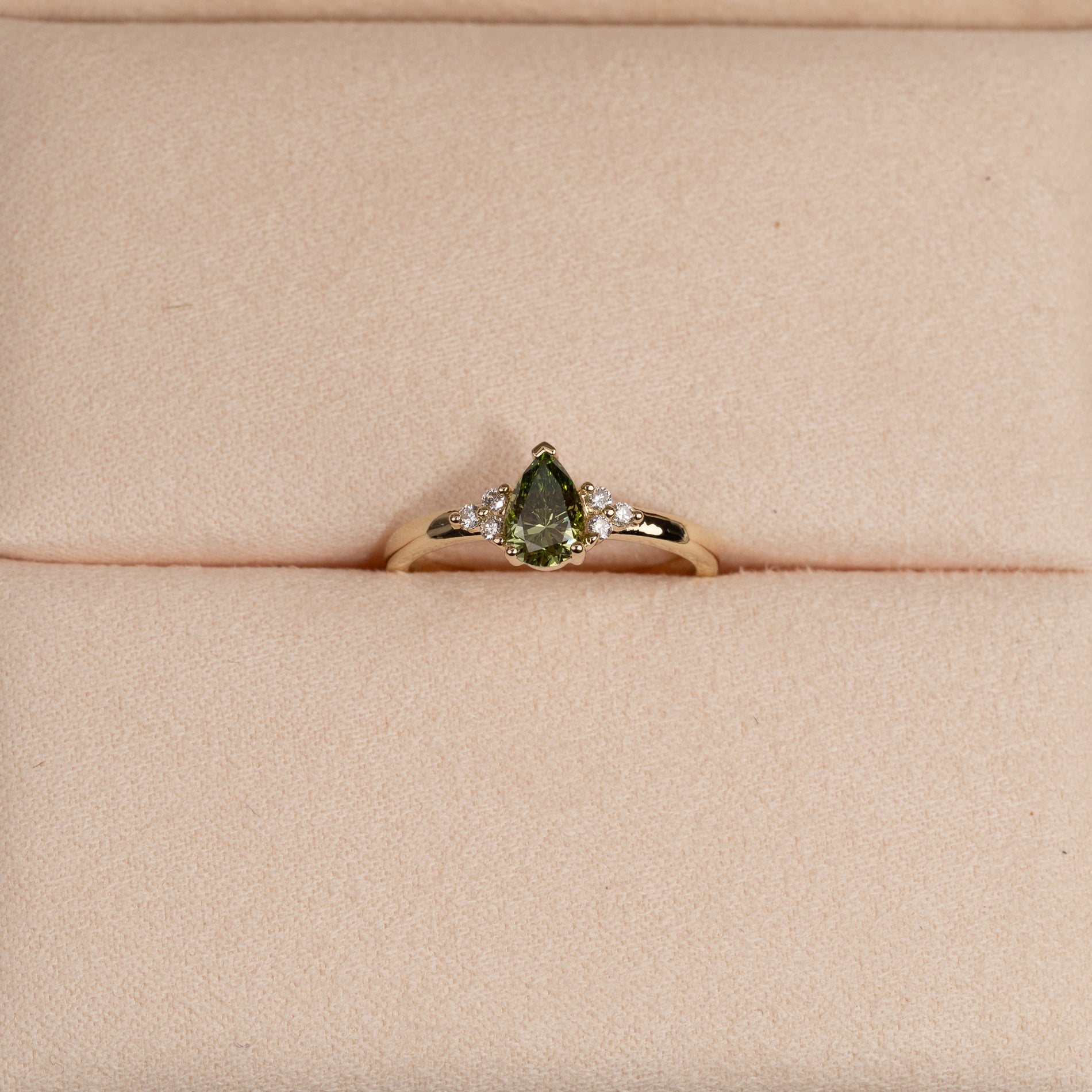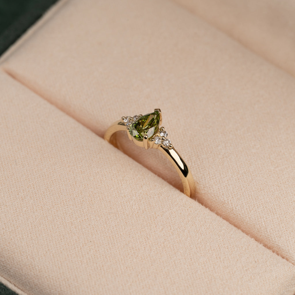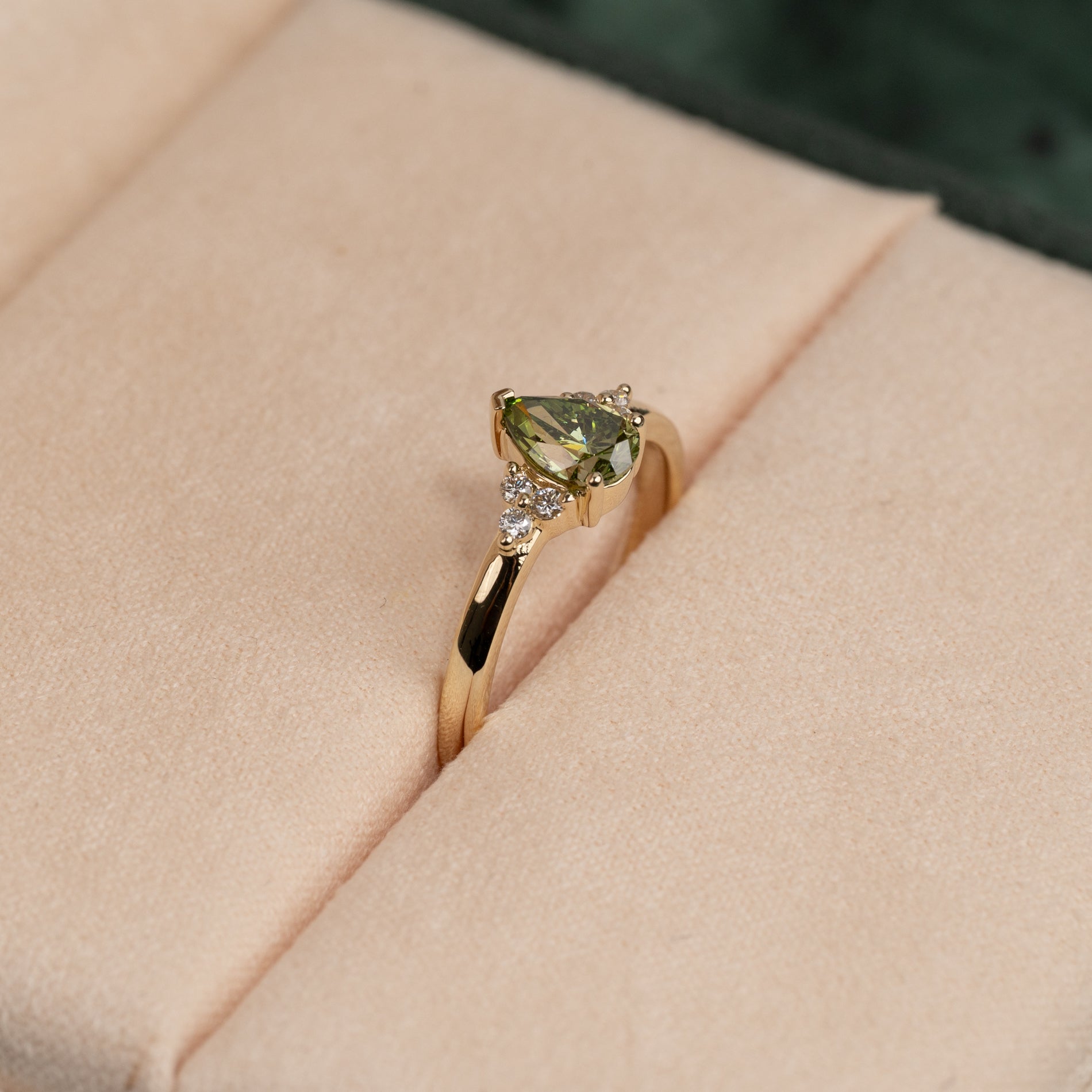 Ring i 14 karat guld med et unikt og detaljeret udtryk. I centrum sidder en smuk grøn 0,6 ct. lab-grown pæreformet diamant, der fremhæves smukt af tre mindre diamanter på hver side. Tilsammen giver de ringen en samlet caratvægt på 0,65 ct.