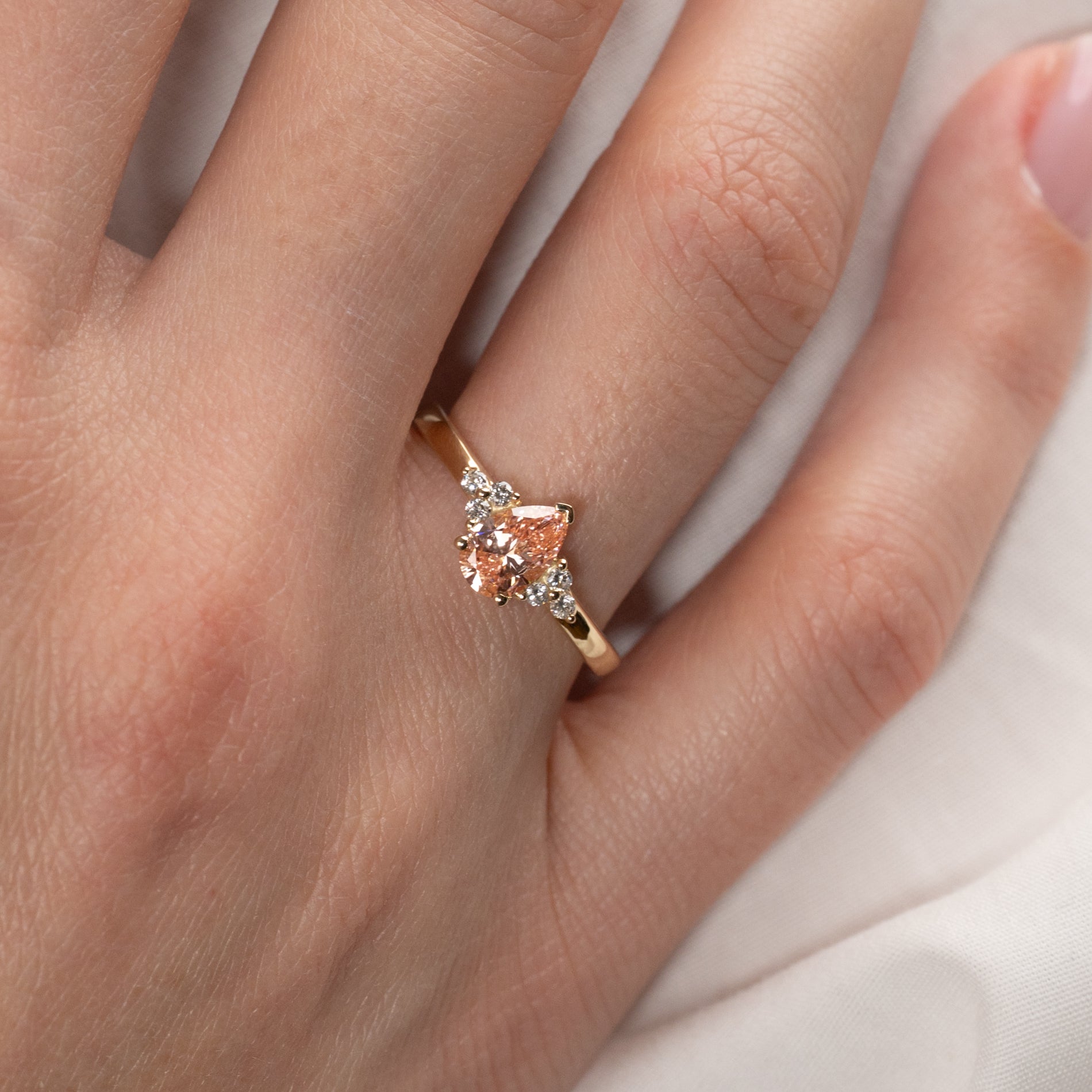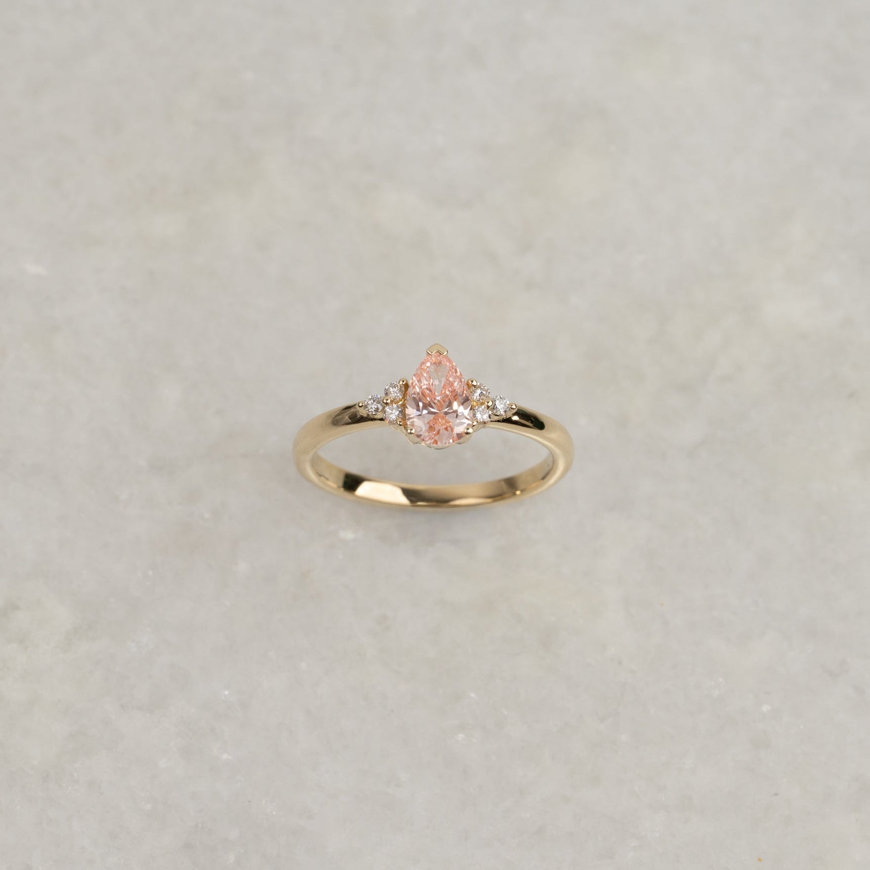 Ringen er fremstillet i 14 karat guld med en 0,60 ct pæreformet lab-grown diamant i farven Fancy Pink og klarheden VVS. Smykket er skabt med omtanke; diamanterne er produceret med blandt andet solenergi, og guldet er 100% certificeret genanvendt.