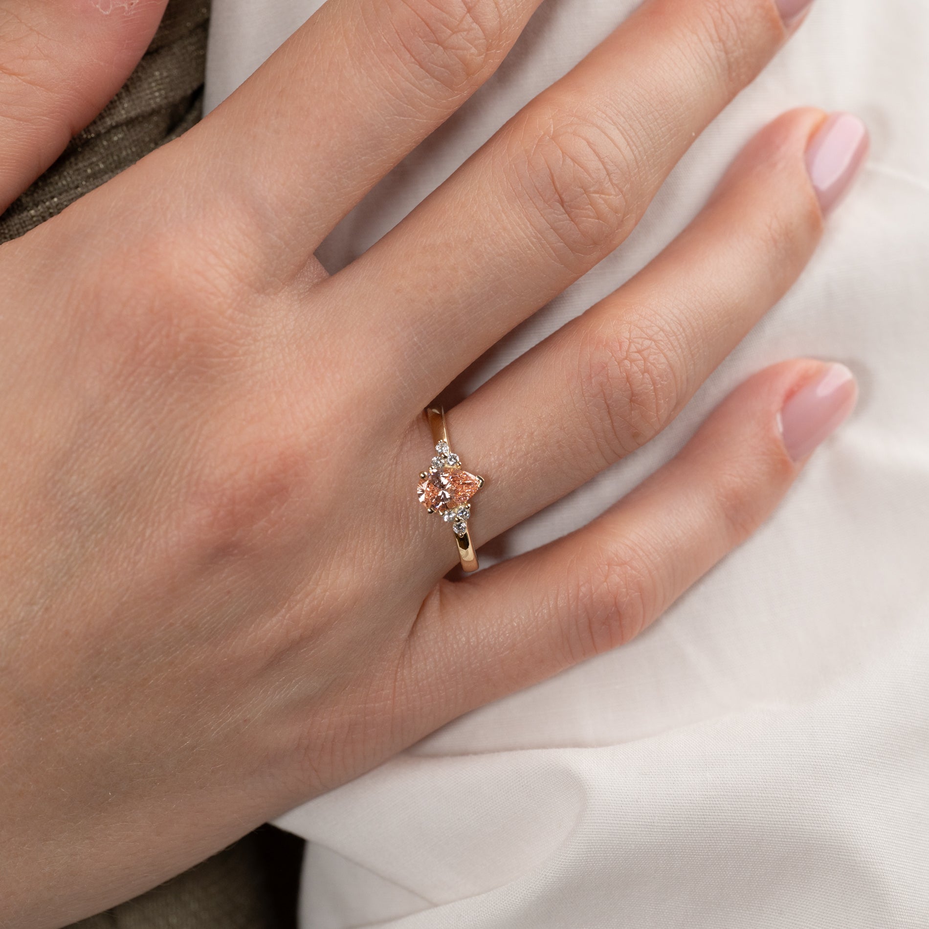 Ring i 14 karat guld med et unikt og detaljeret udtryk. I centrum sidder en smuk pink 0,6 ct. lab-grown pæreformet diamant, der fremhæves smukt af tre mindre diamanter på hver side. Tilsammen giver de ringen en samlet caratvægt på 0,65 ct.