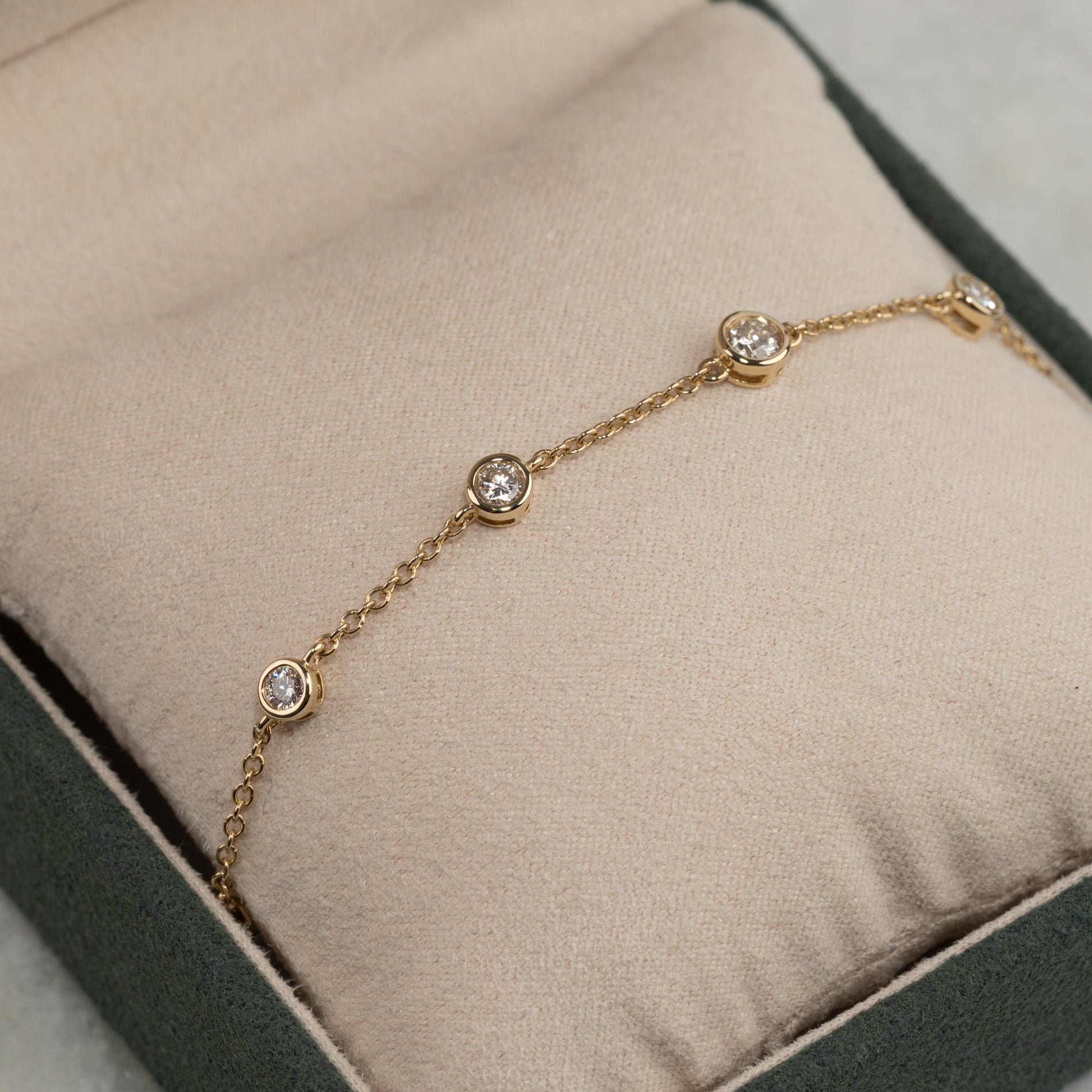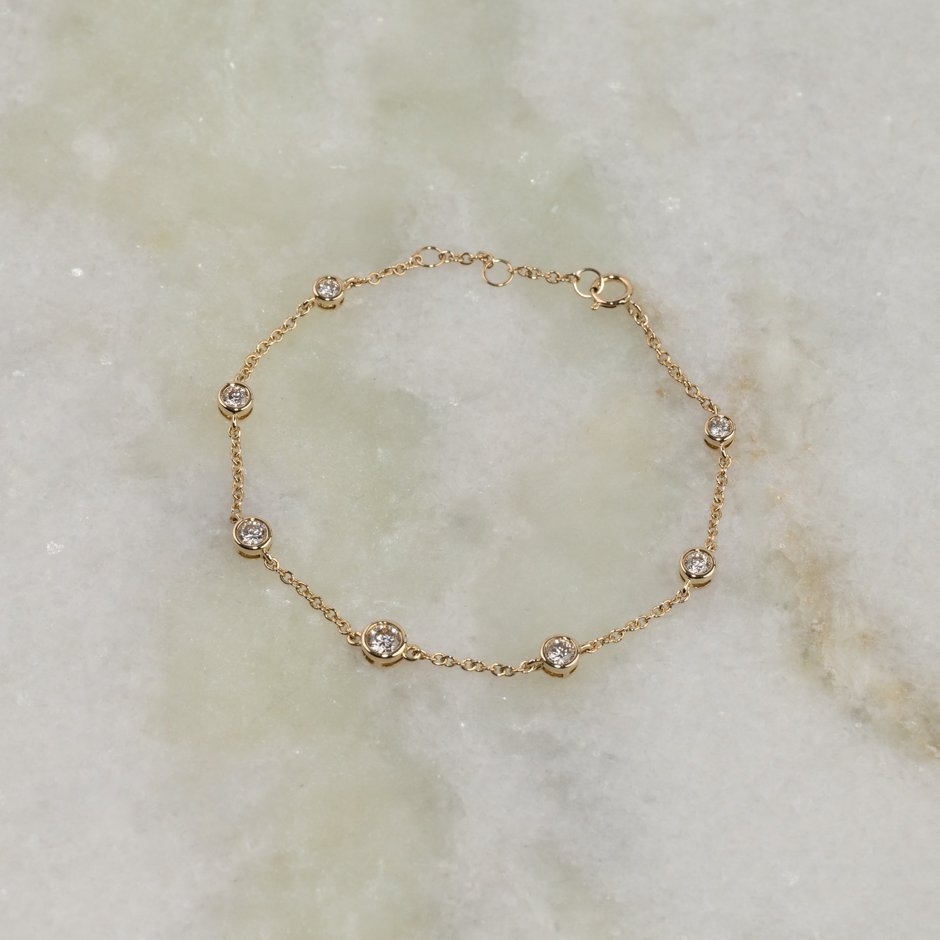 Et klassisk og tidløst armbånd i 14 karat massivt guld med syv lab-grown diamanter i graduerede størrelser, smukt fattet i elegante bezel-fatninger.