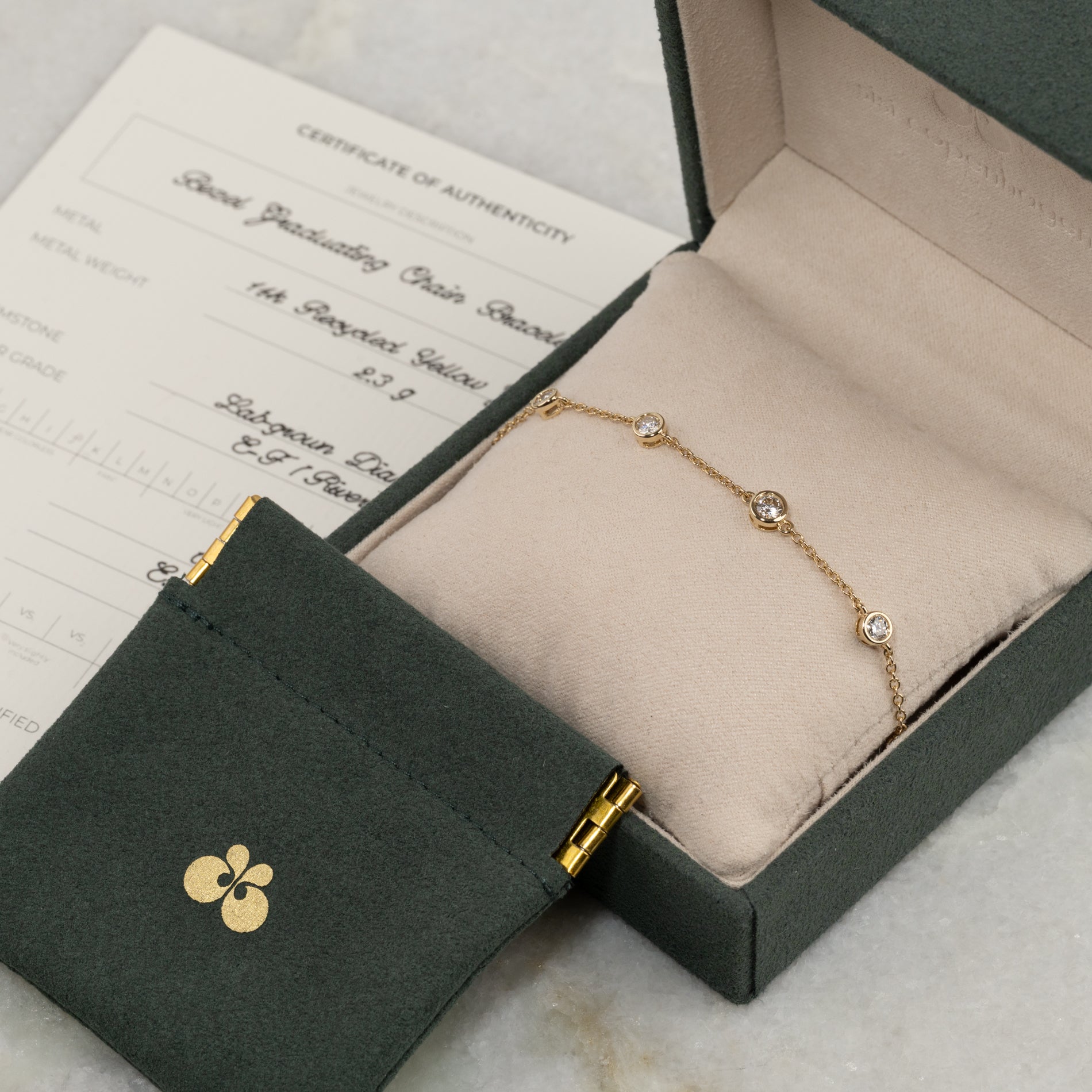 Armbåndet er lavet i 14 karat massivt guld med lab-grown diamanter, der har en samlet vægt på 0,75 ct. Diamanterne har farven E/F (River) og klarheden VVS. Smykket er skabt med omtanke; diamanterne er fremstillet med blandt andet solenergi, og guldet er 100% certificeret genanvendt.