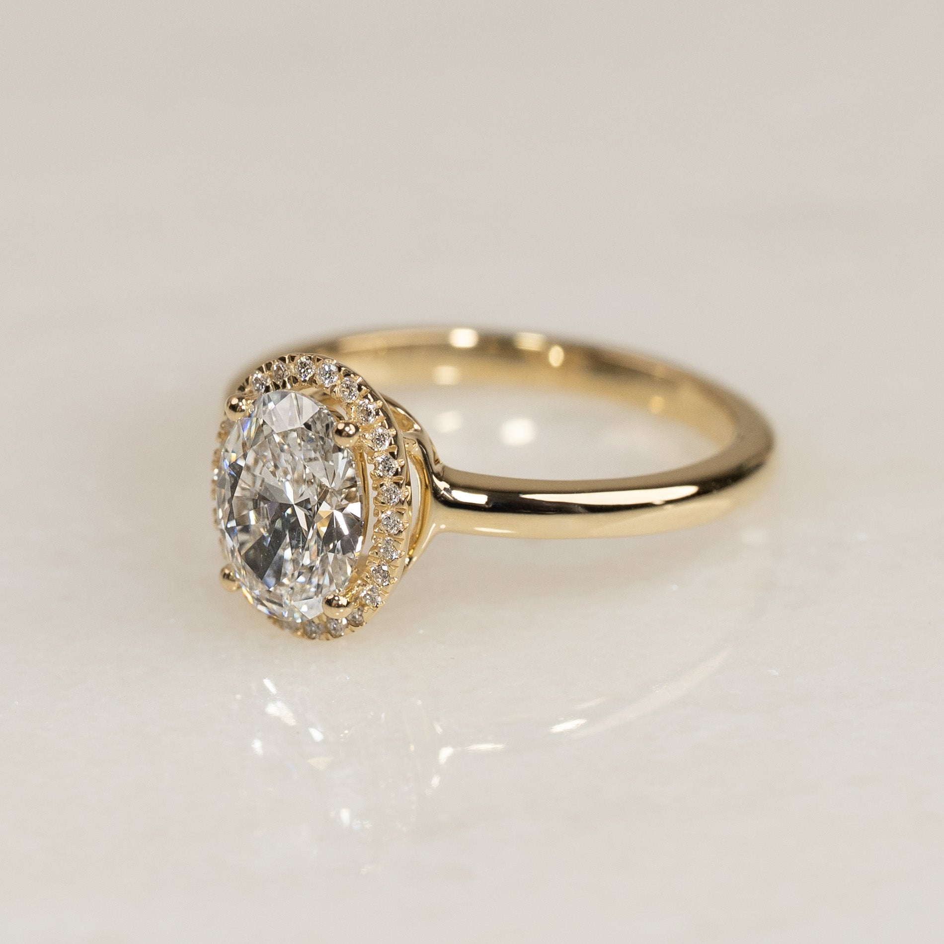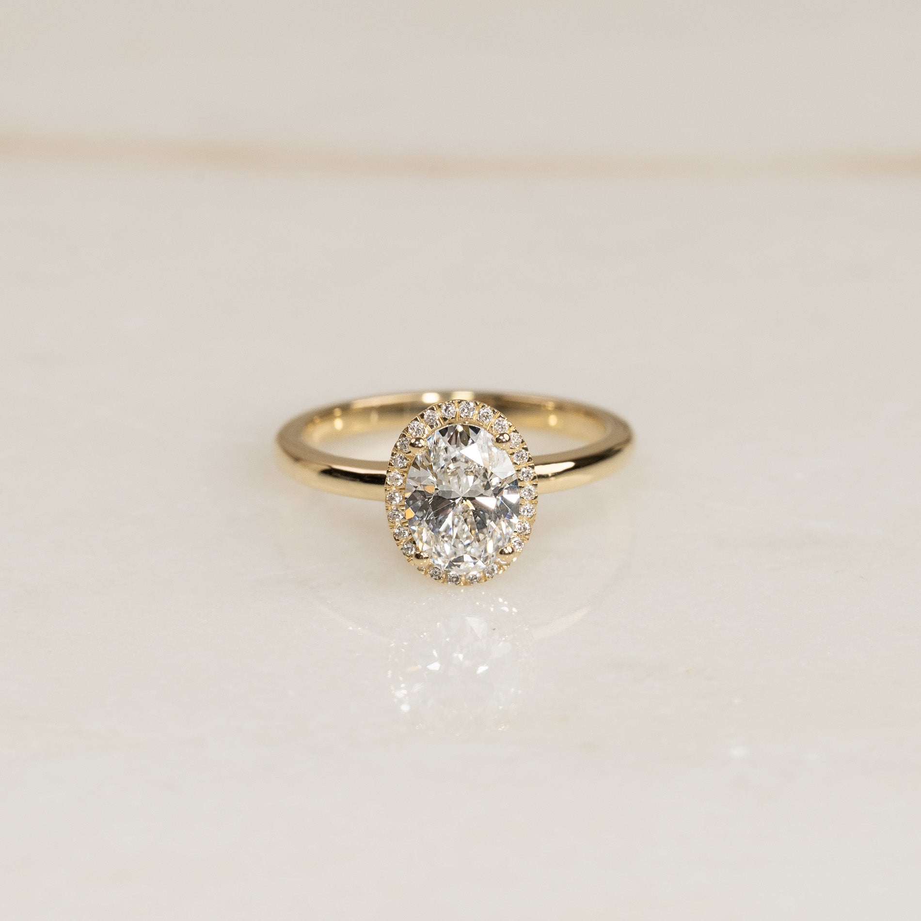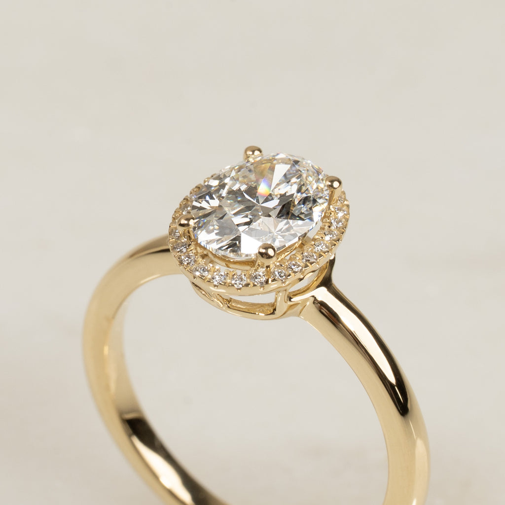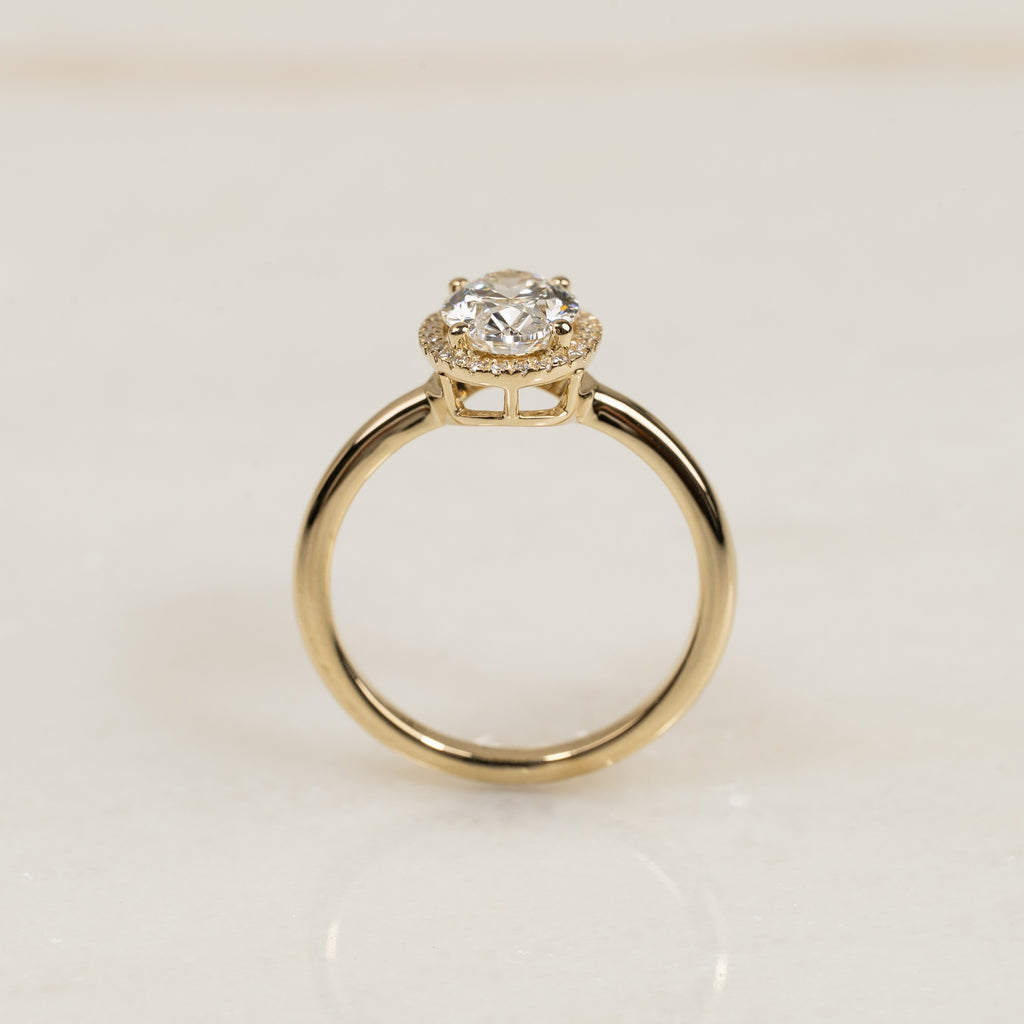 Ringen er fremstillet i 14 karat guld og har et sofistikeret, tidløst og enkelt design. Den ovale centerdiamant på 1,0 ct. er smukt omkranset af en halo af mindre diamanter, som fremhæver dens brillans og tilfører ekstra glans.