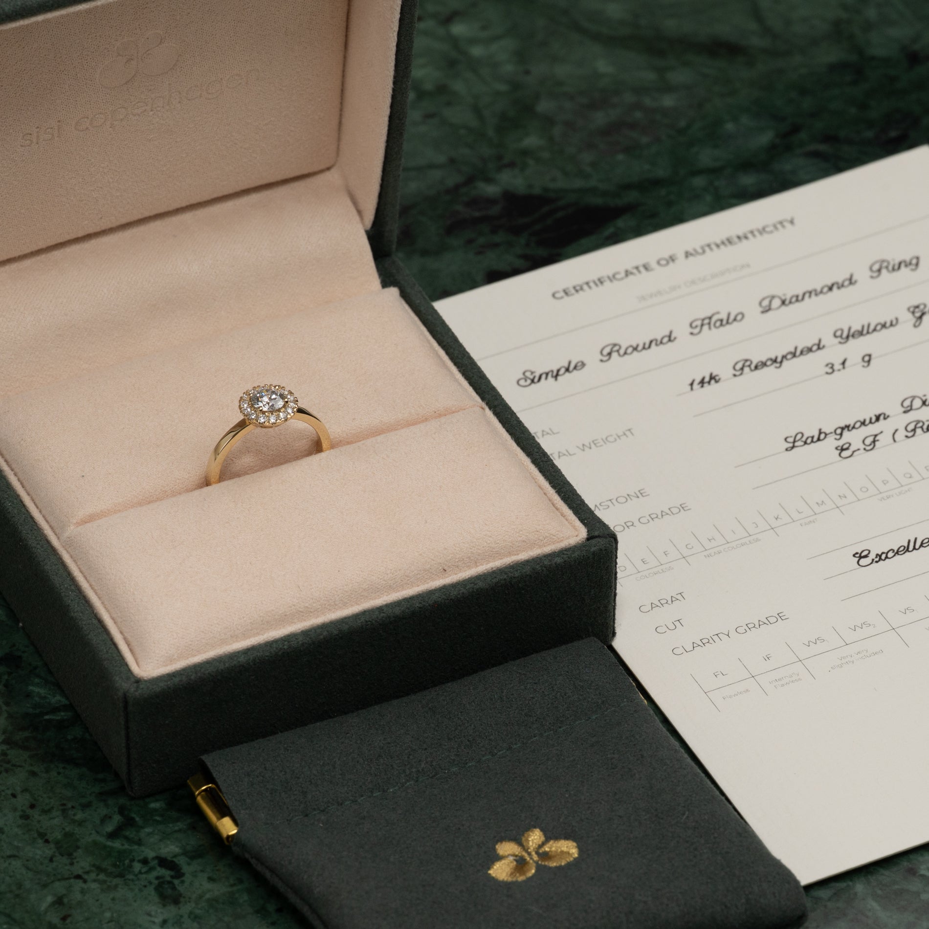 Ringen er i 14 karat massivt guld med lab-grown diamanter på samlet 0,7 ct. Diamanterne har farven E/F (River) og klarheden VVS. Smykket er skabt med omtanke; diamanterne er fremstillet med blandt andet solenergi, og guldet er 100% certificeret genanvendt.