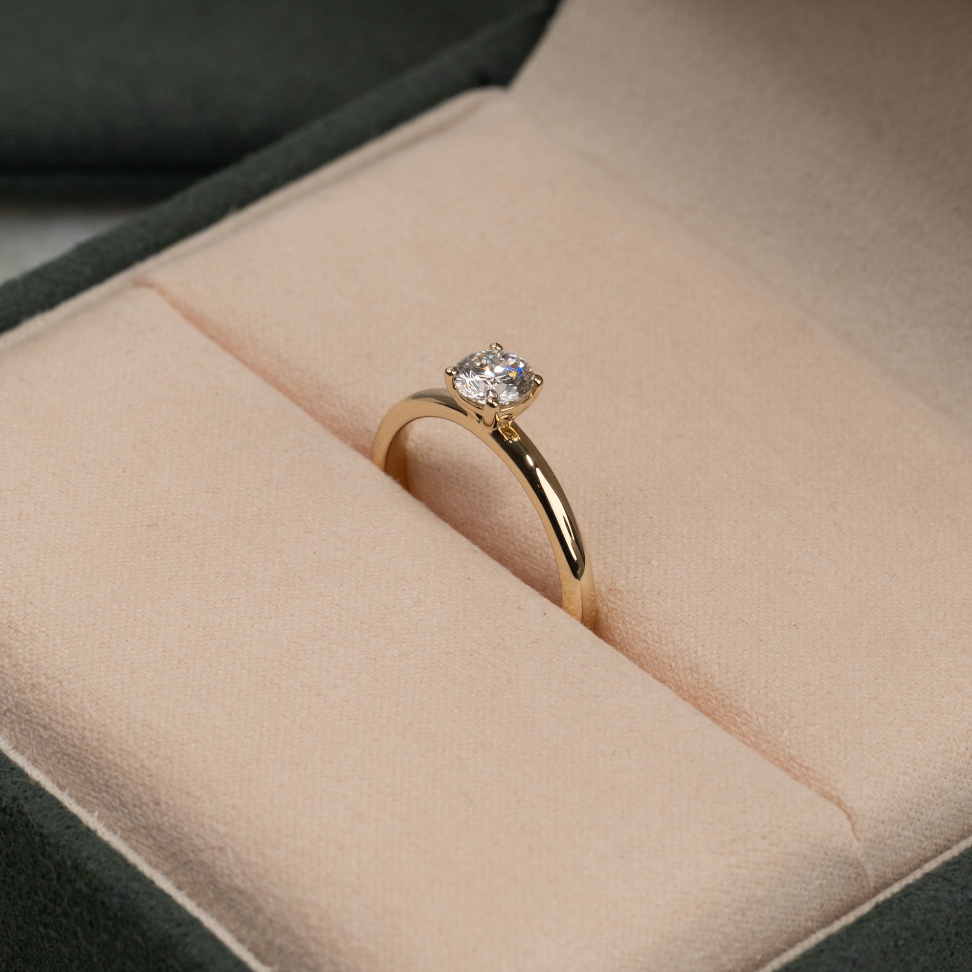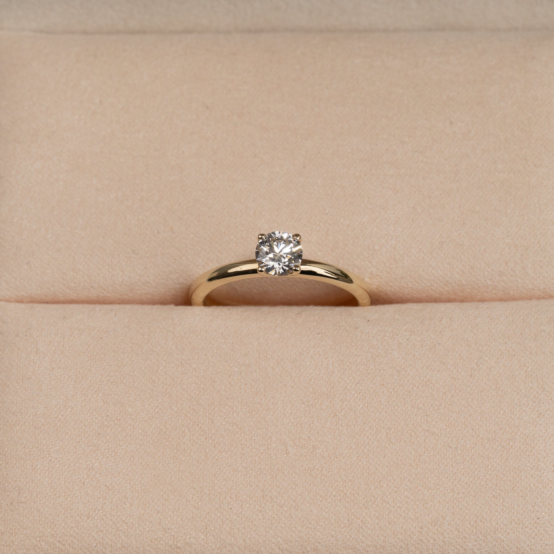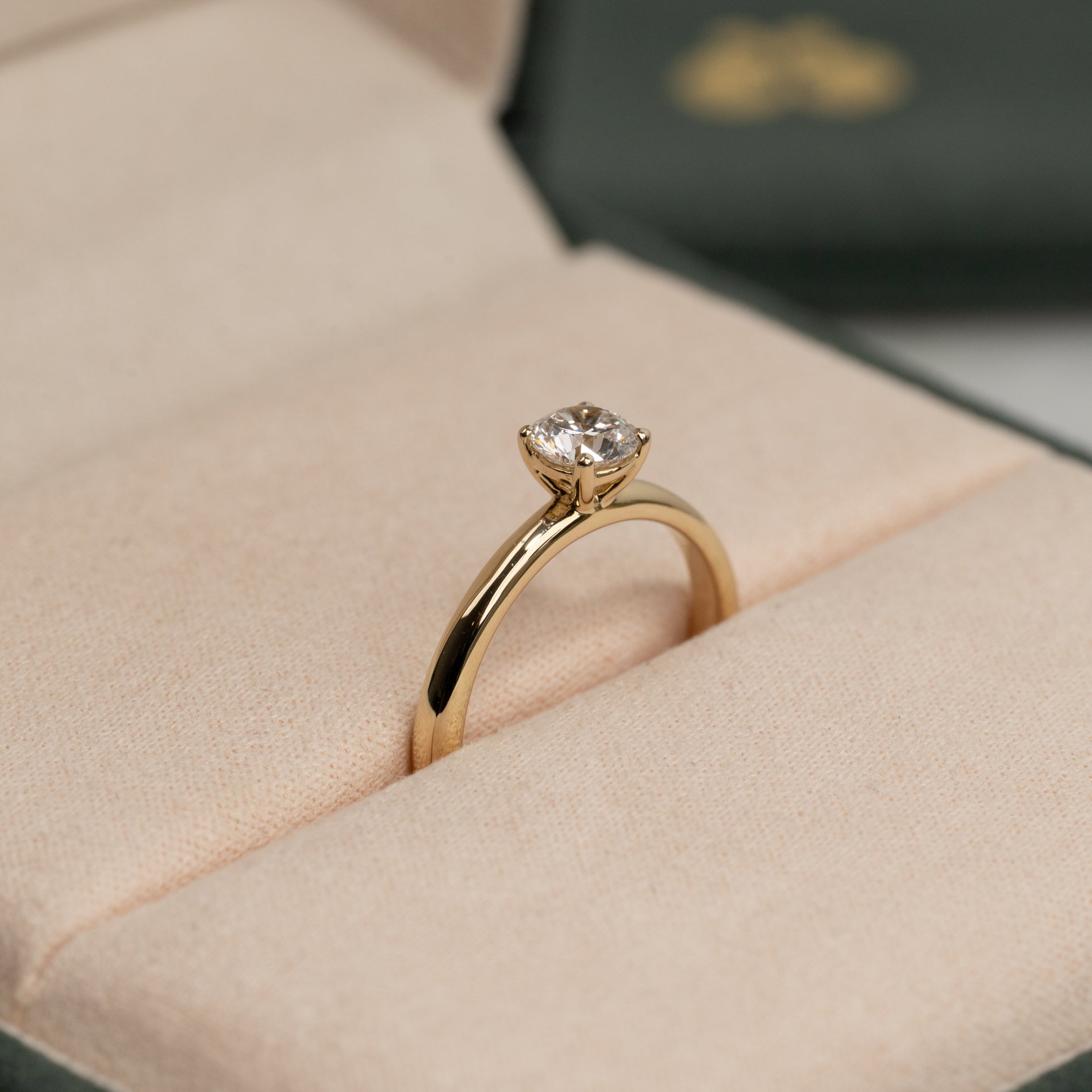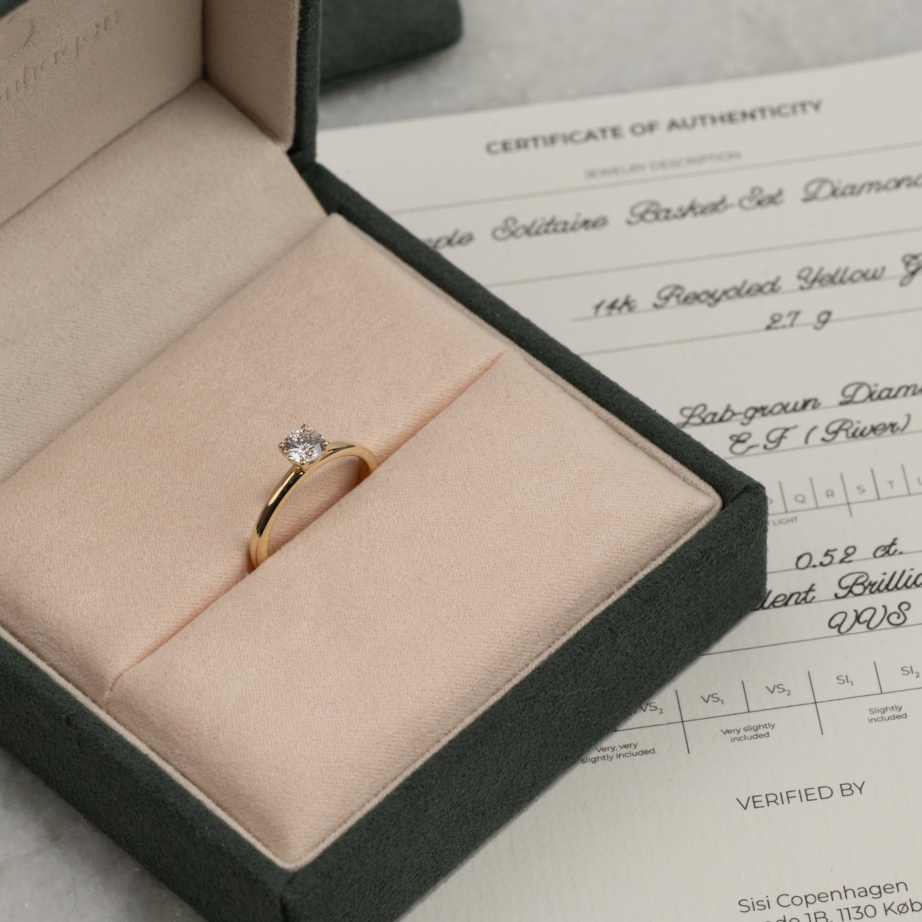 Vores solitairering består af en enkel diamant. Den 0,5 ct. brillantslebne lab-grown diamant sidder fattet i en klassisk basket-fatning, som er smukt hævet over den minimalistiske ringskinne. Ringen er et elegant og tidløst smykke, der er perfekt til at give som gave til en, man elsker og holder af eller som en klassisk forlovelsesring.