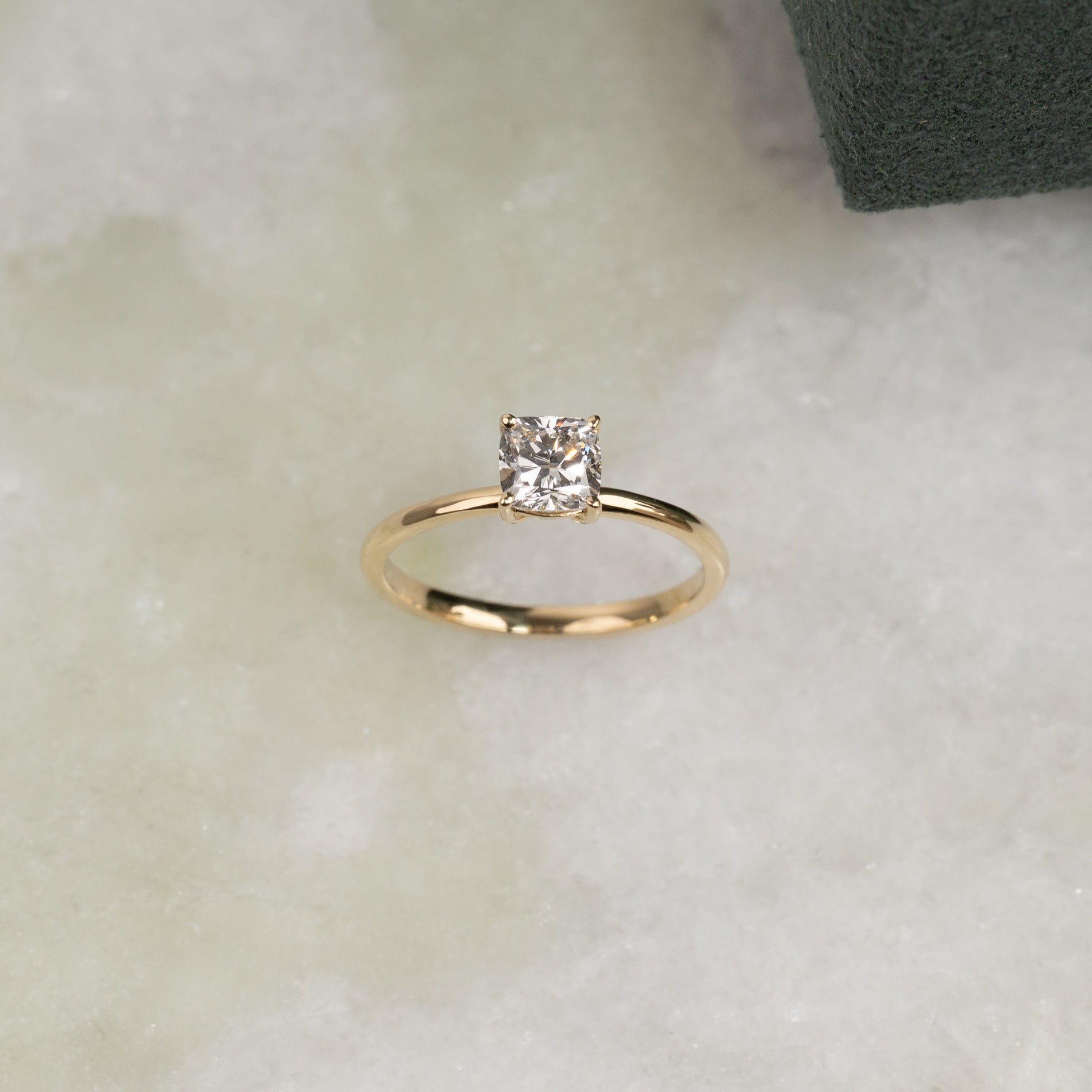 Elegant solitairering i 14 karat massivt guld med en 0,75 ct. cushion-cut lab-grown diamant. Diamanten er fattet med en klassisk basket-fatning. Cushion-slibningen blander et firkantet snit med bløde former - ligesom en pude. Kombinationen af den minimalistiske ringskinne, den klassiske basket-fatning og den lidt specielle cushion-slibning giver en smuk og tidløs ring med både moderne og klassiske referencer. Ringen er den perfekte gave til en man elsker og holder af - eller som den perfekte forlovelsesring.