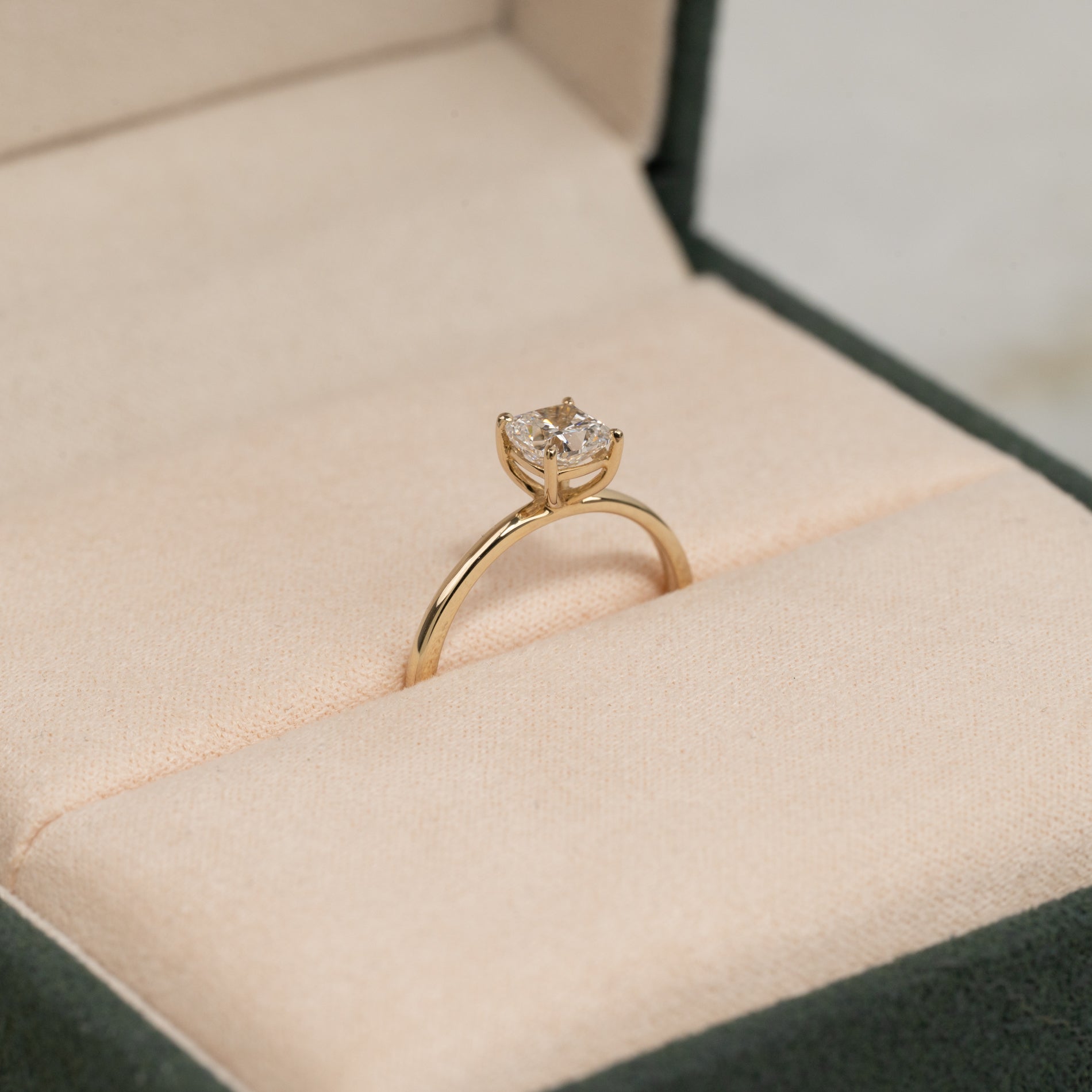 Ringen er skabt i 14 karat massivt guld med en 0,75 ct. lab-grown diamant. Diamanten har farven E/F (River) og klarheden VVS. Diamanten måler 5,2 x 5,2 mm. Smykket er skabt med omtanke; diamanterne er fremstillet med blandt andet solenergi, og guldet er 100% certificeret genanvendt.