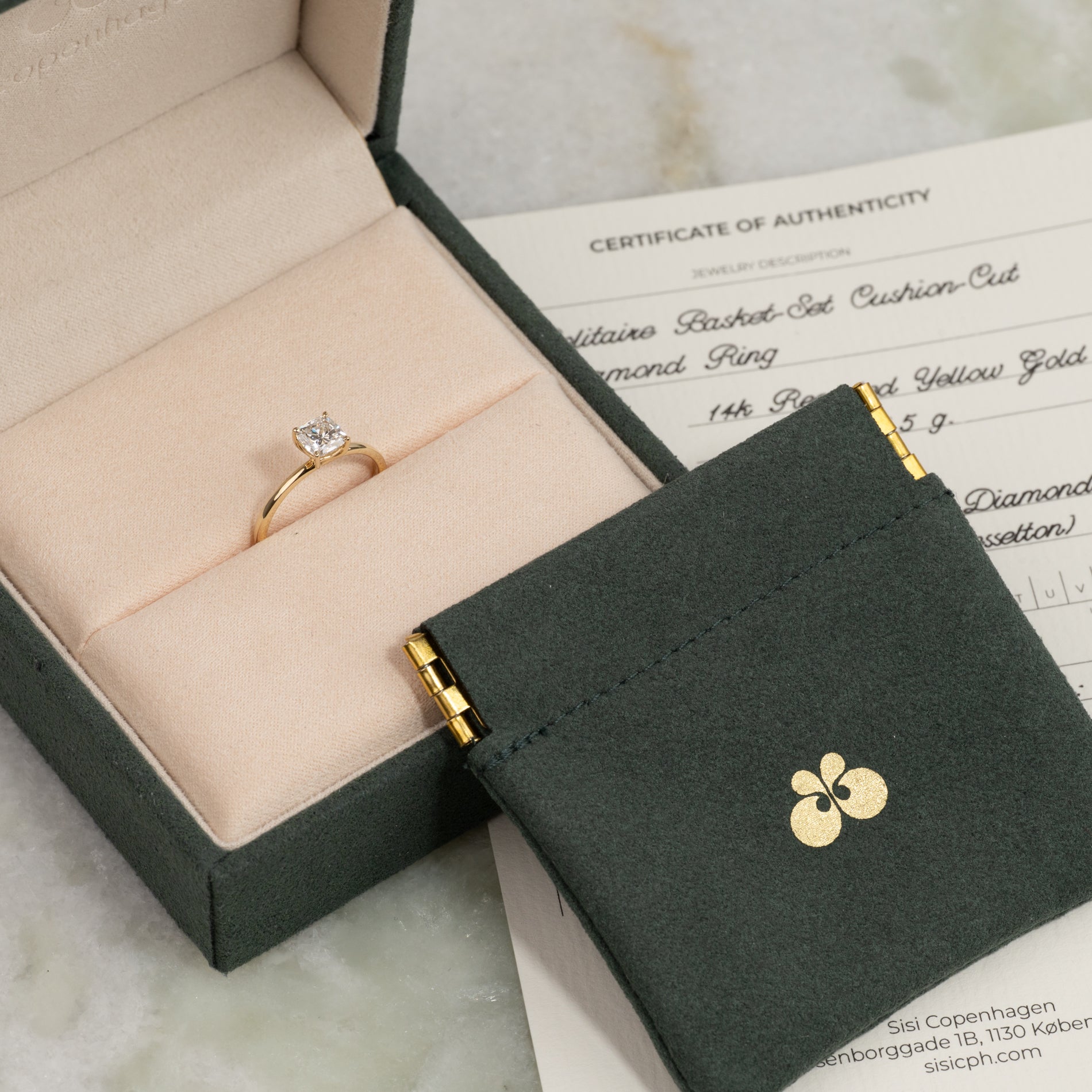 Ringen kommer i vores eksklusive Diamond Collection boks med gavebånd. I boksen findes en smykkeæske, et certifikat og en pouch.