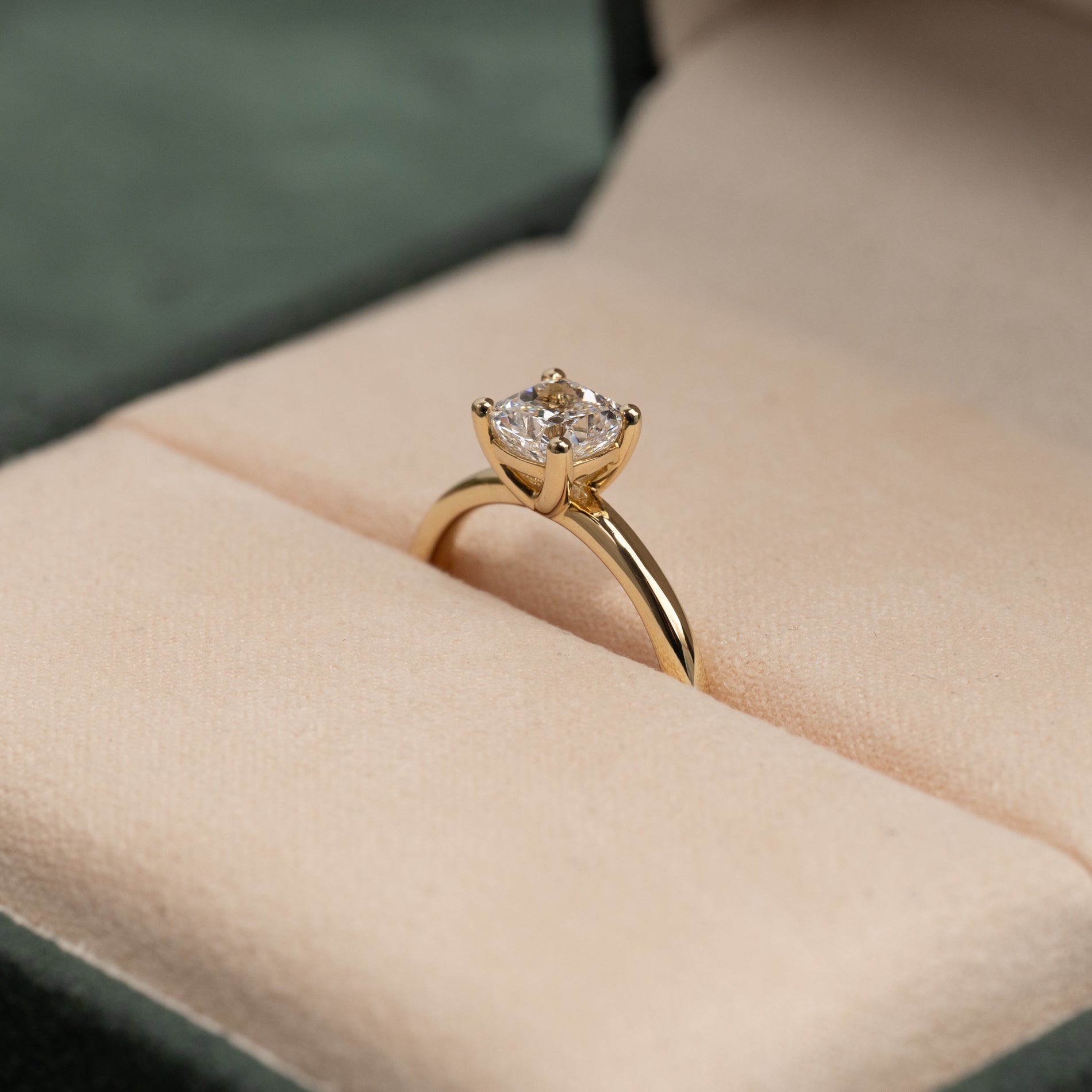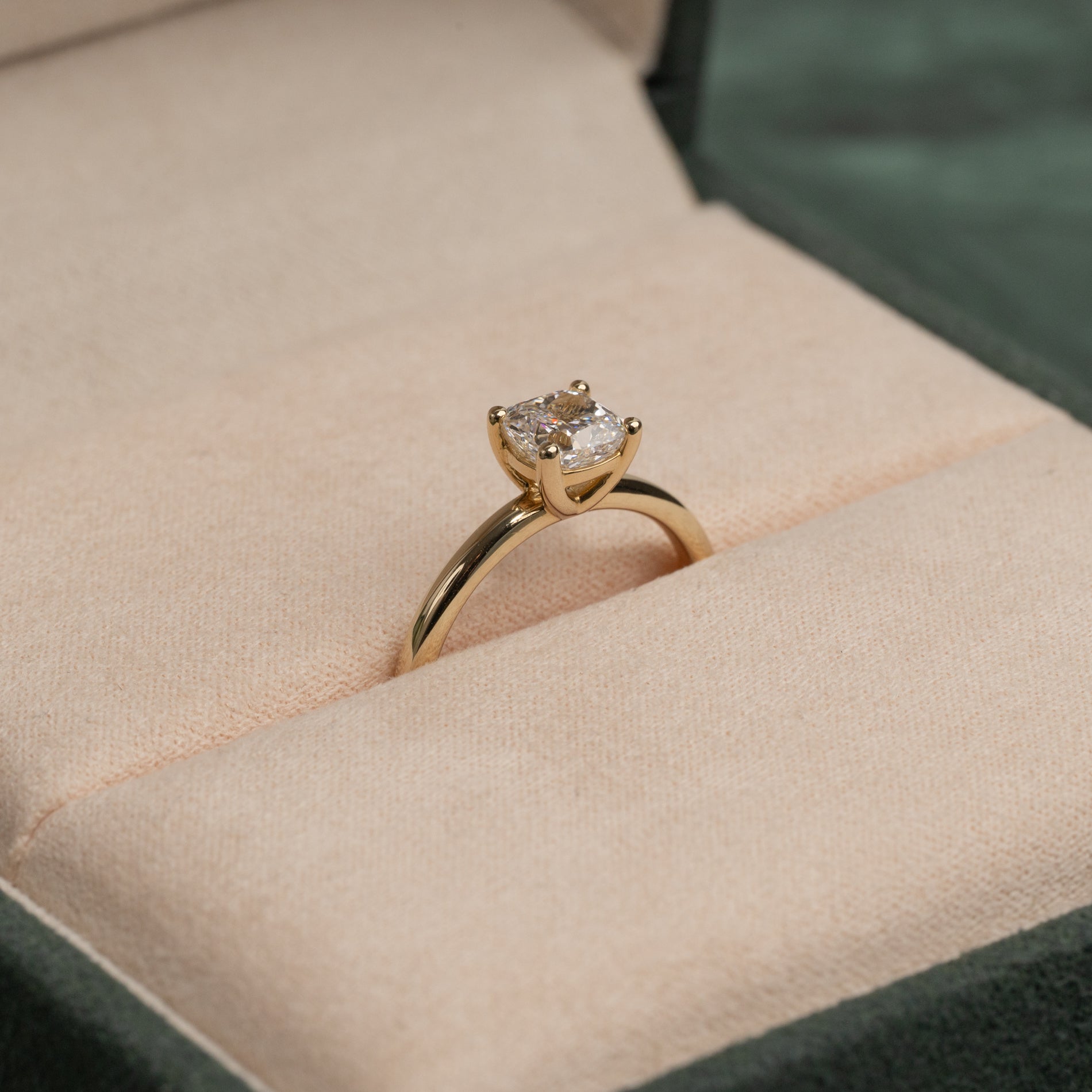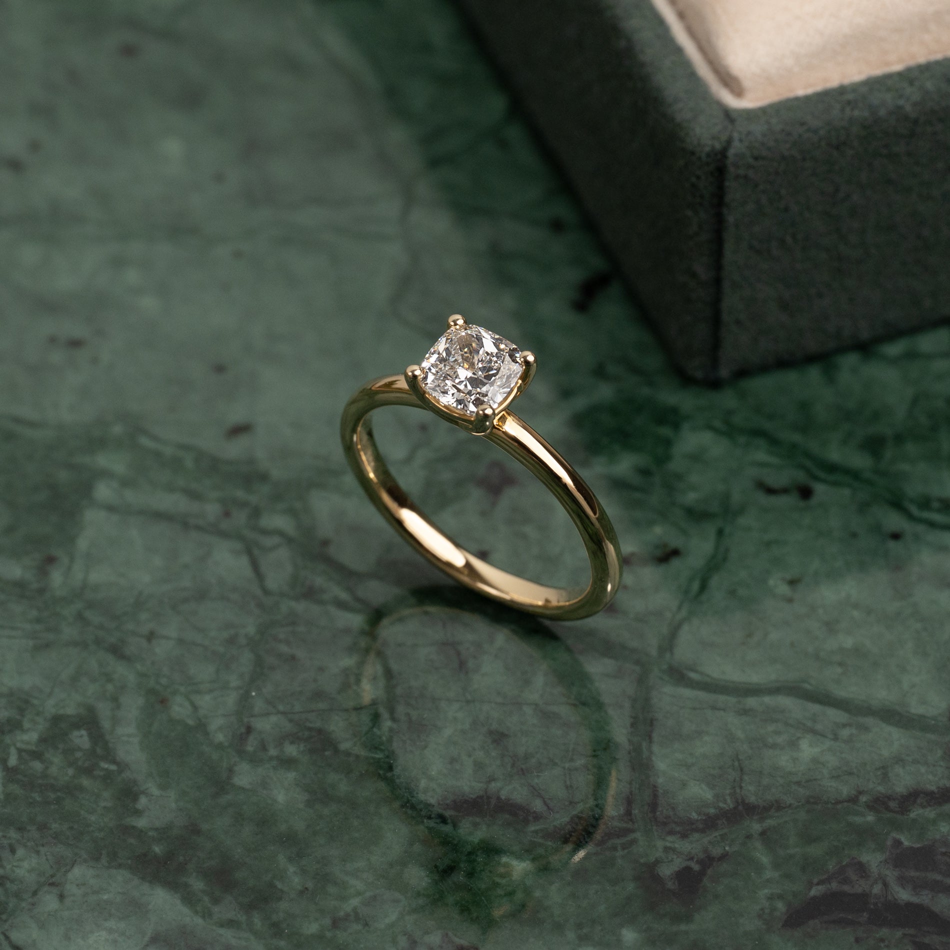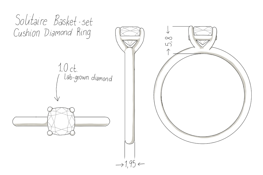 Elegant solitairering i 14 karat massivt guld med en 1,0 ct. cushion-cut lab-grown diamant. Diamanten er fattet med en klassisk basket-fatning. Cushion-slibningen blander et firkantet snit med bløde former - ligesom en pude. Kombinationen af den minimalistiske ringskinne, den klassiske basket-fatning og den lidt specielle cushion-slibning giver en smuk og tidløs ring med både moderne og klassiske referencer. Ringen er den perfekte gave til en, man elsker og holder af eller som den perfekte forlovelsesring.