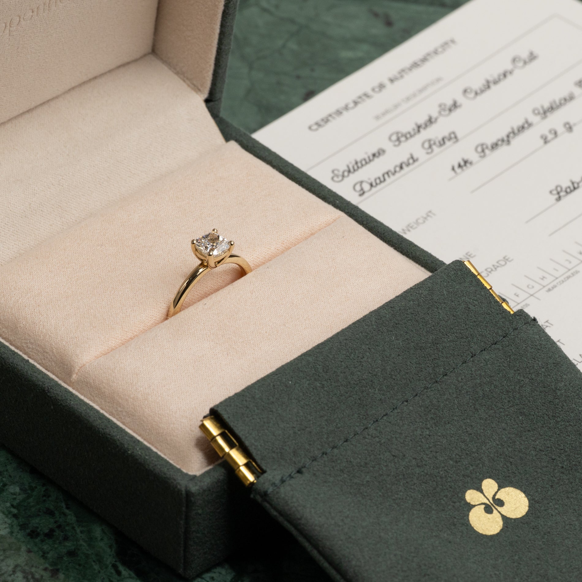 Ringen er skabt i 14 karat massivt guld med en 1,0 ct. lab-grown diamant. Diamanten har farven E/F (River) og klarheden VVS. Diamanten måler 5,3 x 5,3 mm, og selve ringskinnen har en bredde på 1,8 mm. Smykket er skabt med omtanke; diamanterne er fremstillet med blandt andet solenergi, og guldet er 100% certificeret genanvendt.
