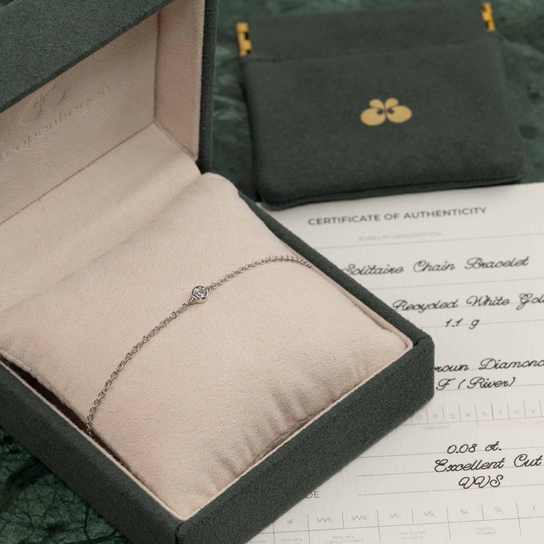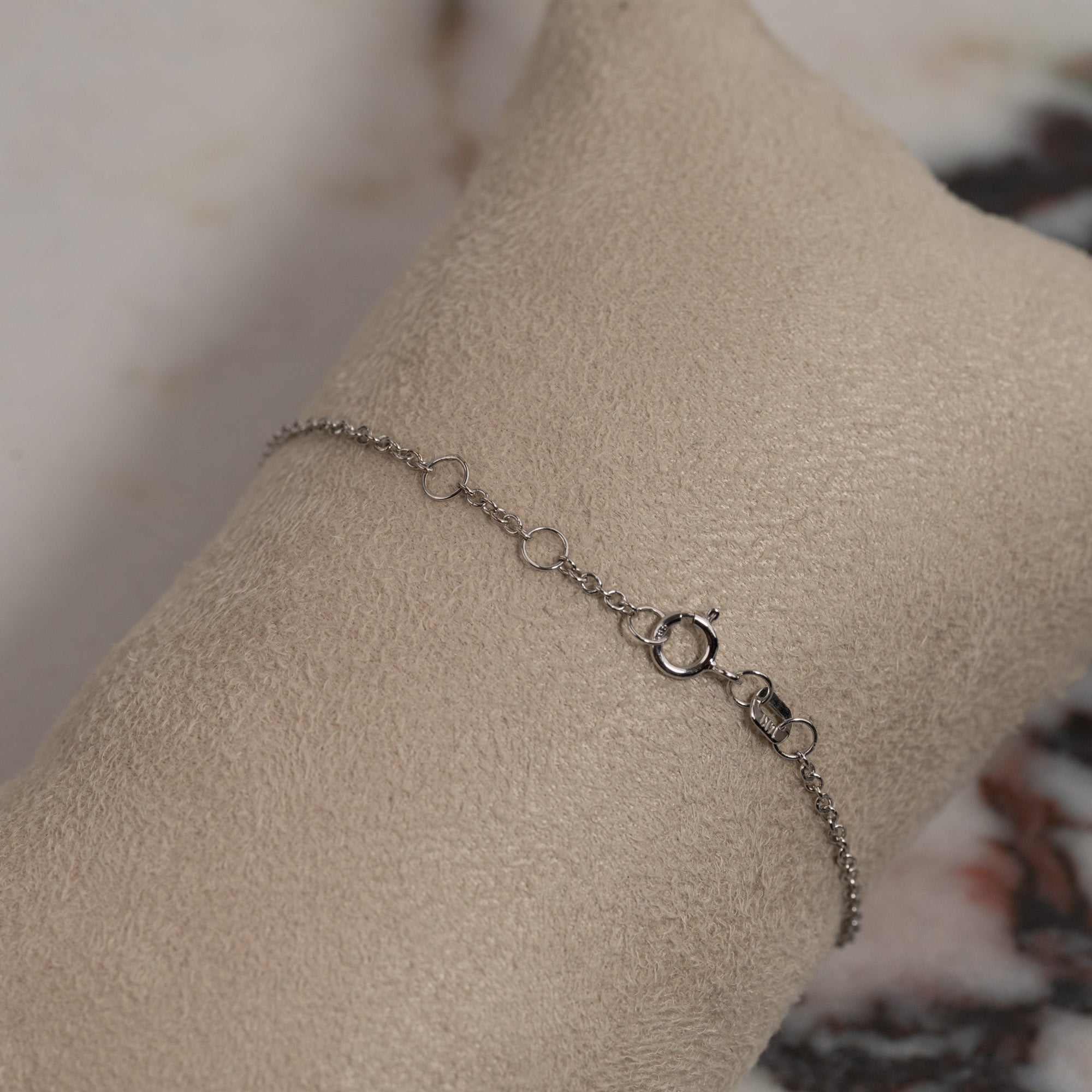 Armbåndet er lavet i 14 karat massivt hvidguld med en 0.08 ct. lab-grown diamant. Diamanten har farven E/F (River) og klarheden VVS. Smykket er skabt med omtanke; diamanten er fremstillet med blandt andet solenergi, og guldet er 100% certificeret genanvendt.
