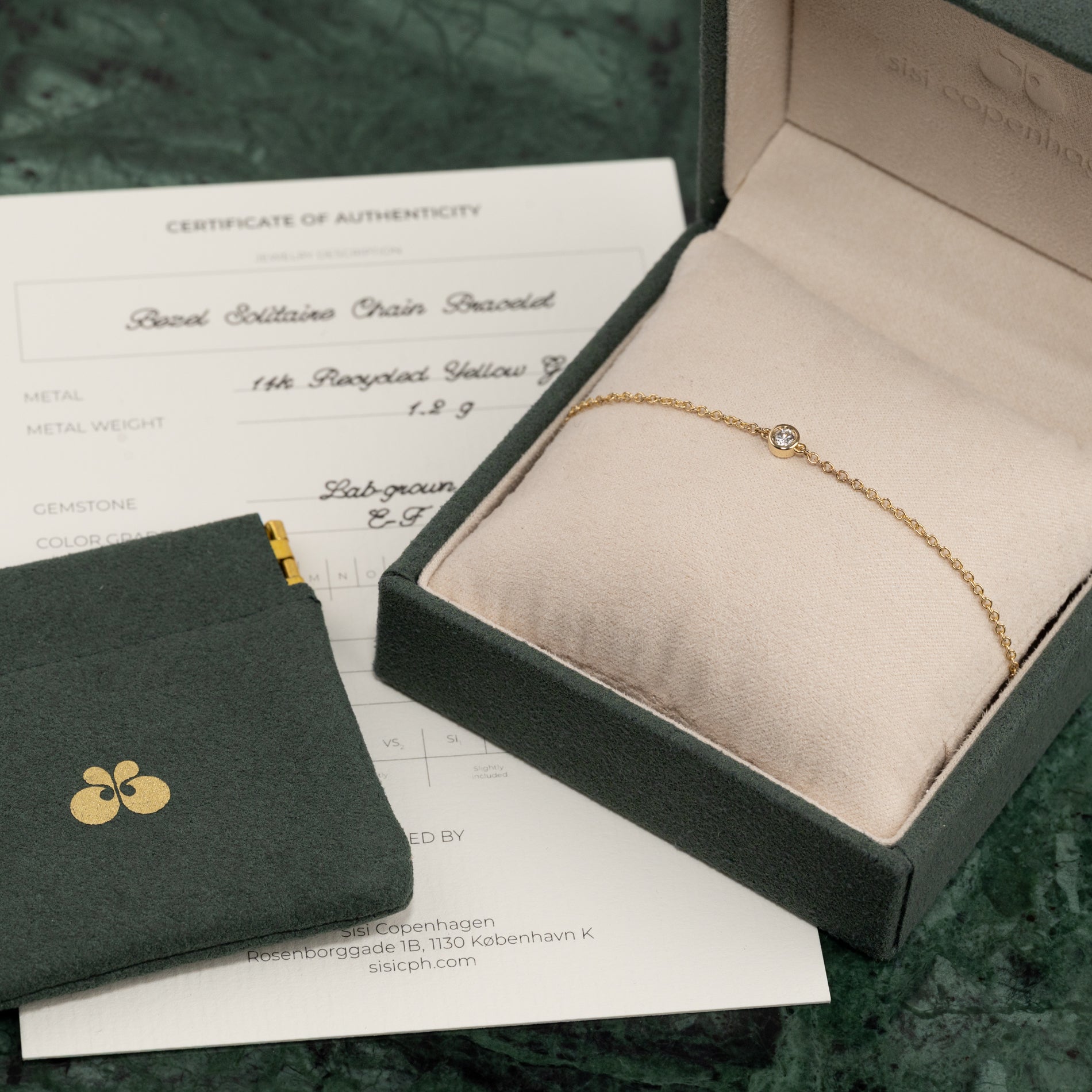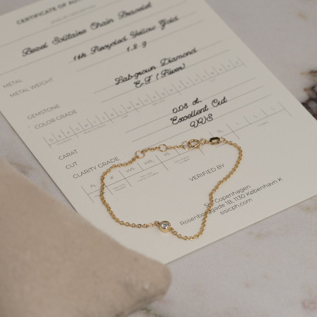 Armbåndet er lavet i 14 karat massivt guld med en 0.08 ct. lab-grown diamant. Diamanten har farven E/F (River) og klarheden VVS. Smykket er skabt med omtanke; diamanten er fremstillet med blandt andet solenergi, og guldet er 100% certificeret genanvendt.