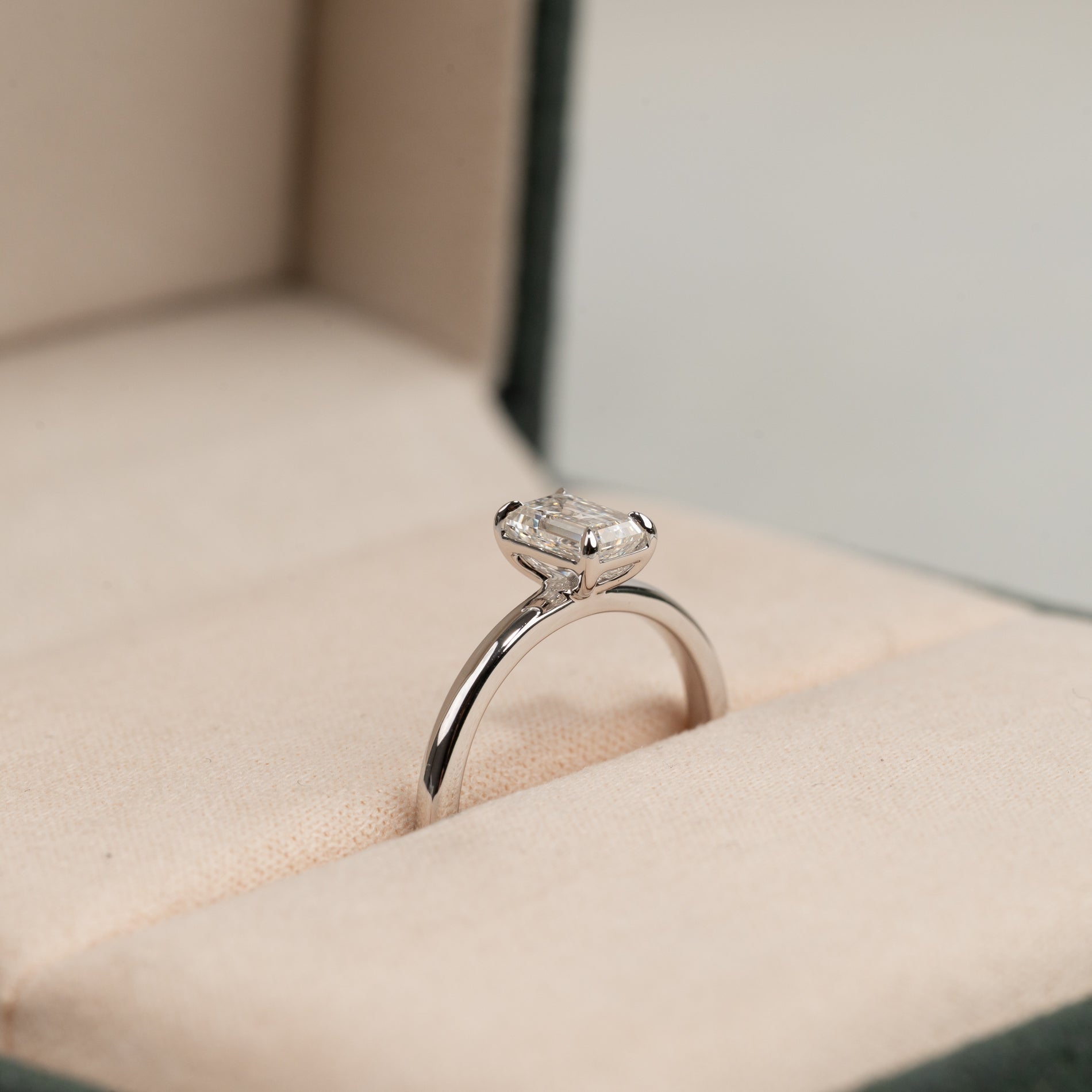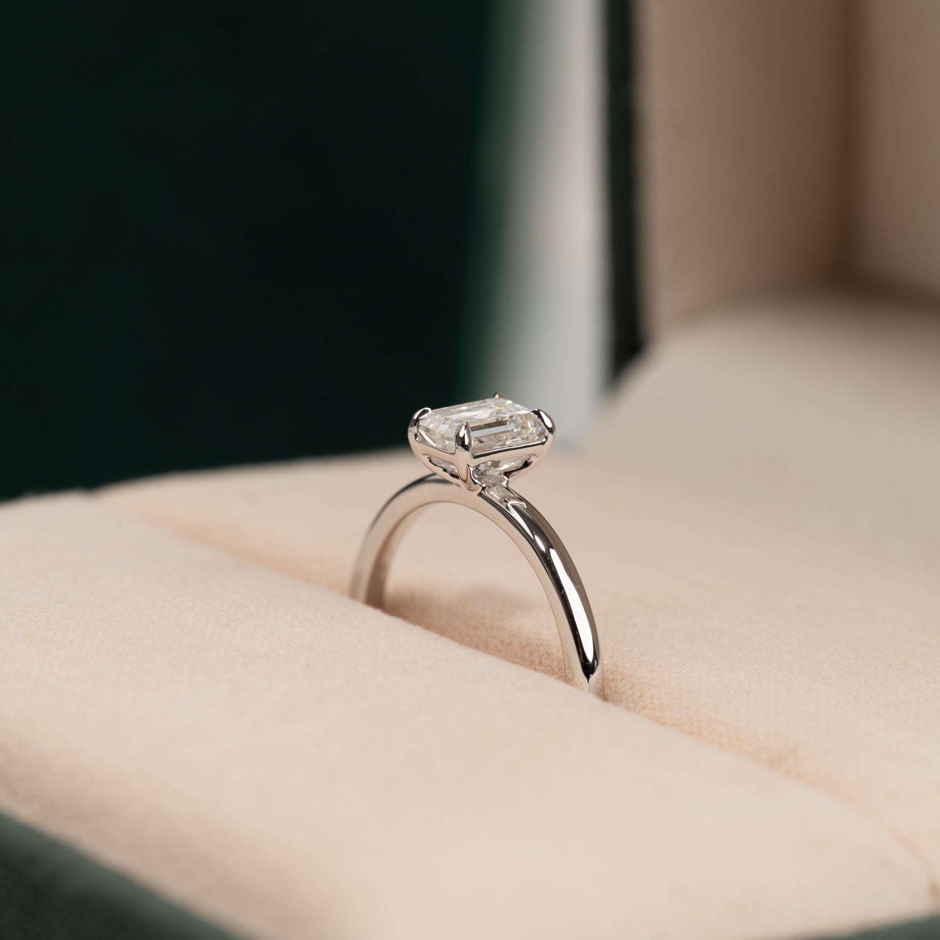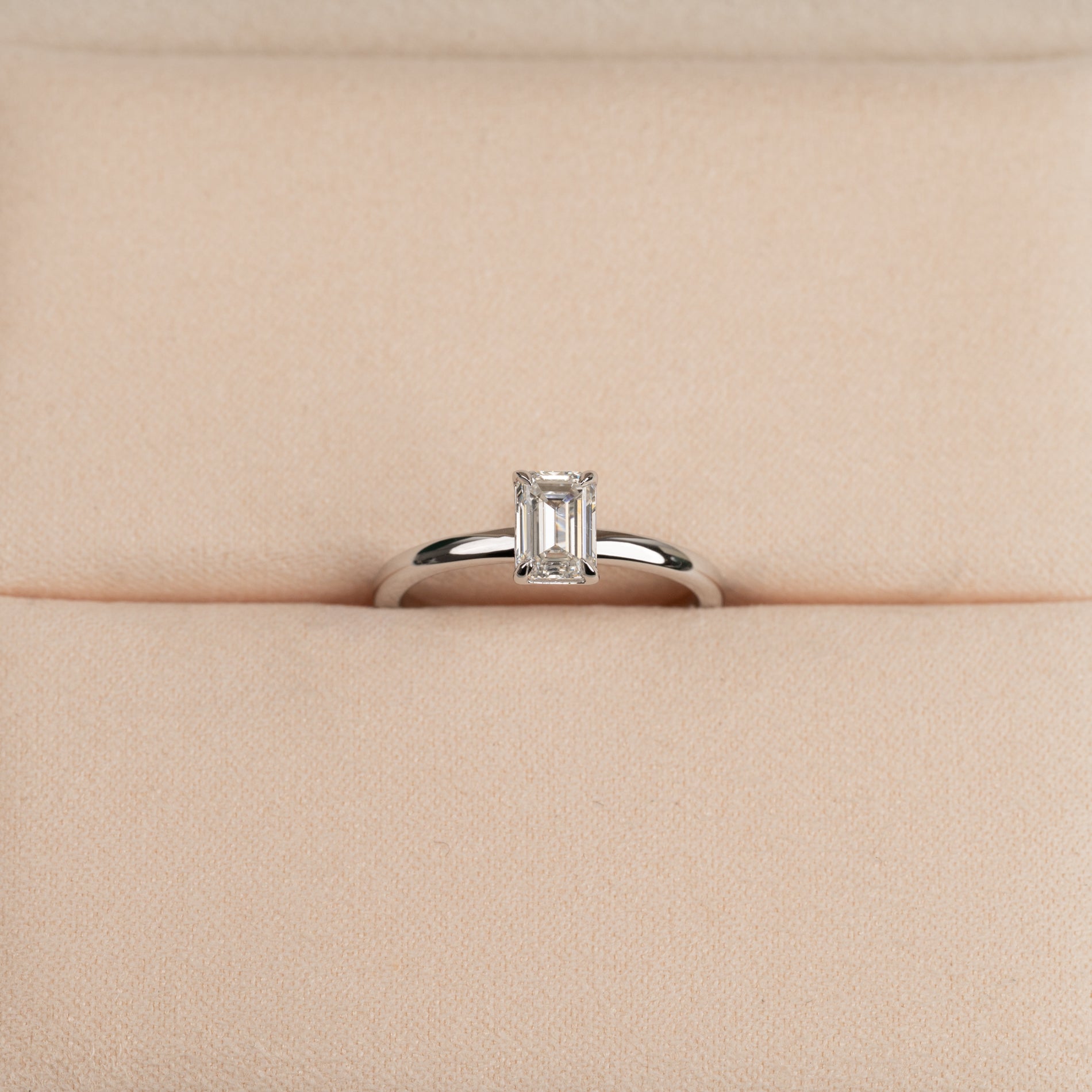 En tidløs ring i 14 karat hvidguld med en smuk emerald‑slebet lab‑grown diamant på 0,75 ct. Diamanten er elegant fattet i en let hævet basket-fatning, der komplimenterer den klare, spejlende glans og de karakteristiske trappeformede facetter, der kendetegner emerald‑cut.