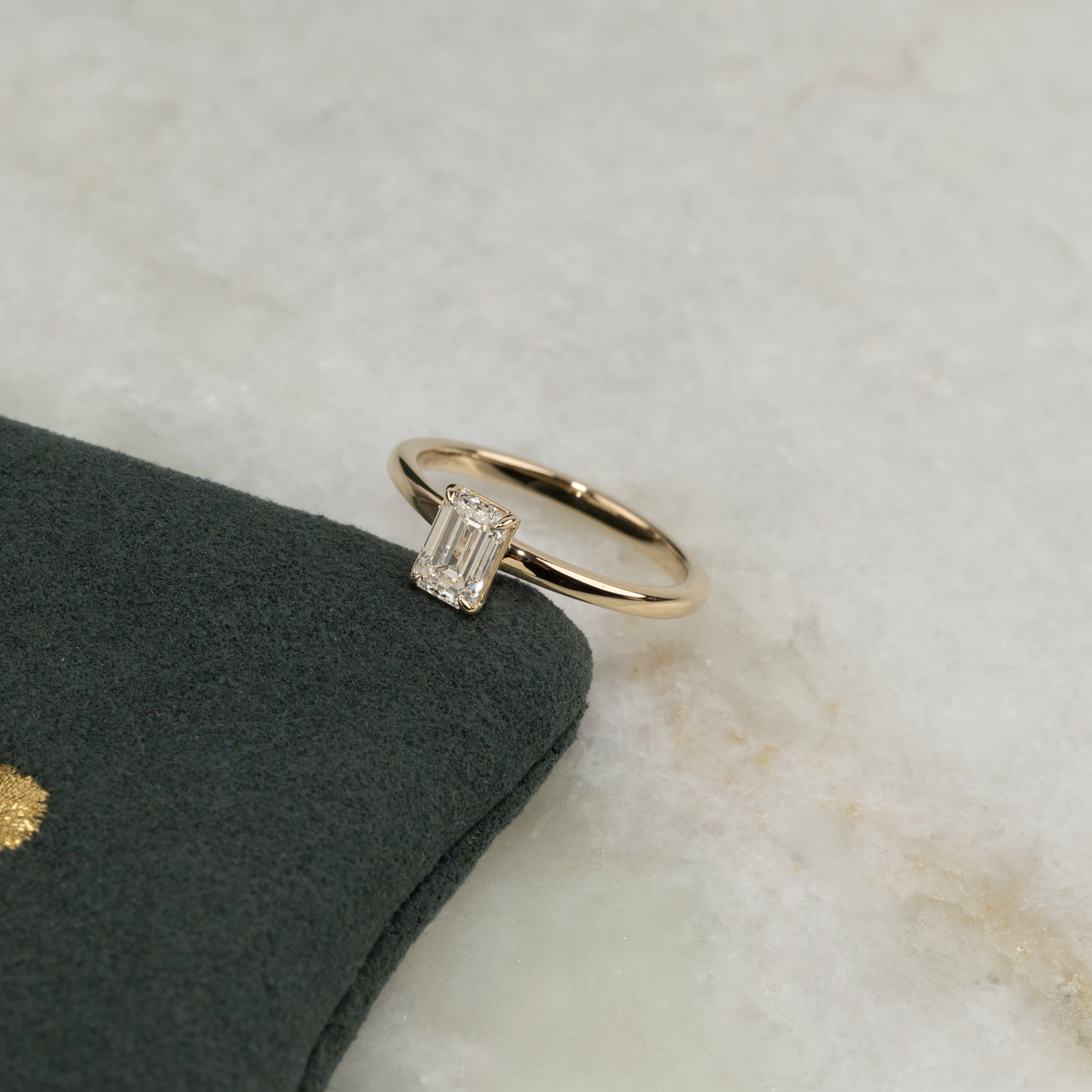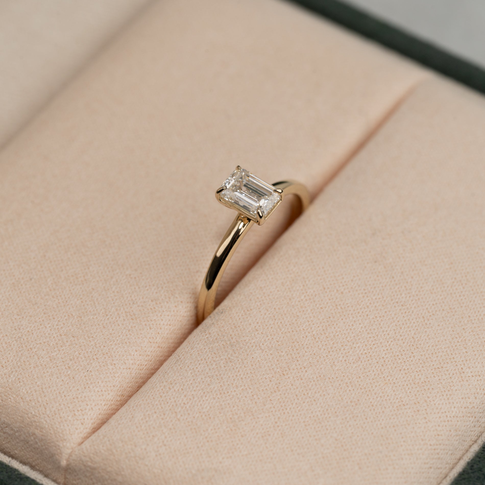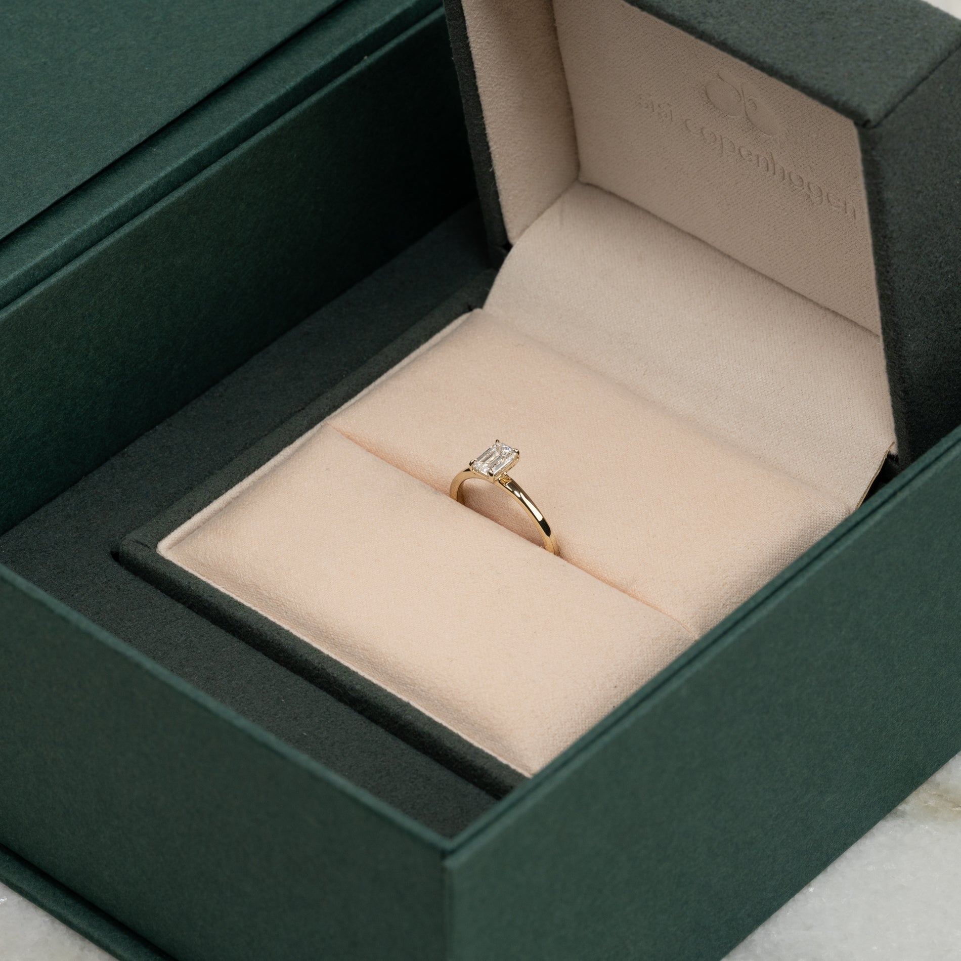 En tidløs ring i 14 karat guld med en smuk emerald‑slebet lab‑grown diamant på 0,75 ct. Diamanten er elegant fattet i en let hævet basket-fatning, der komplimenterer den klare, spejlende glans og de karakteristiske trappeformede facetter, der kendetegner emerald‑cut.