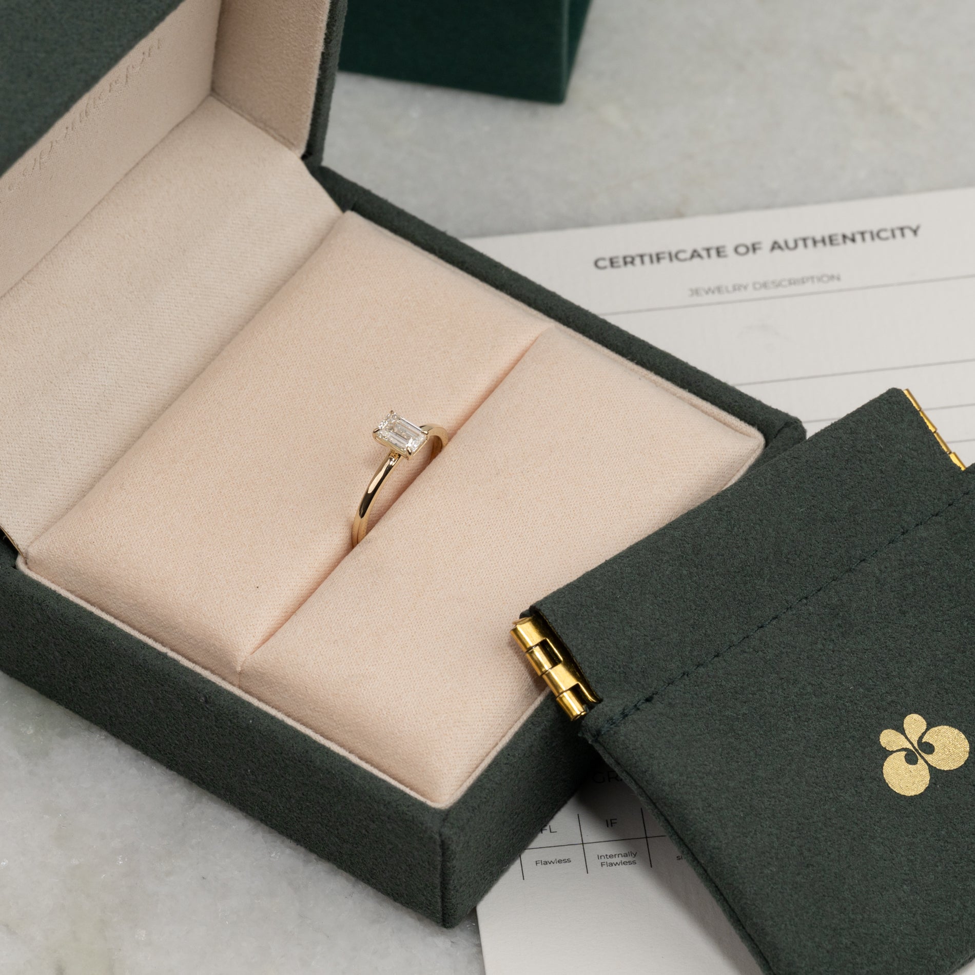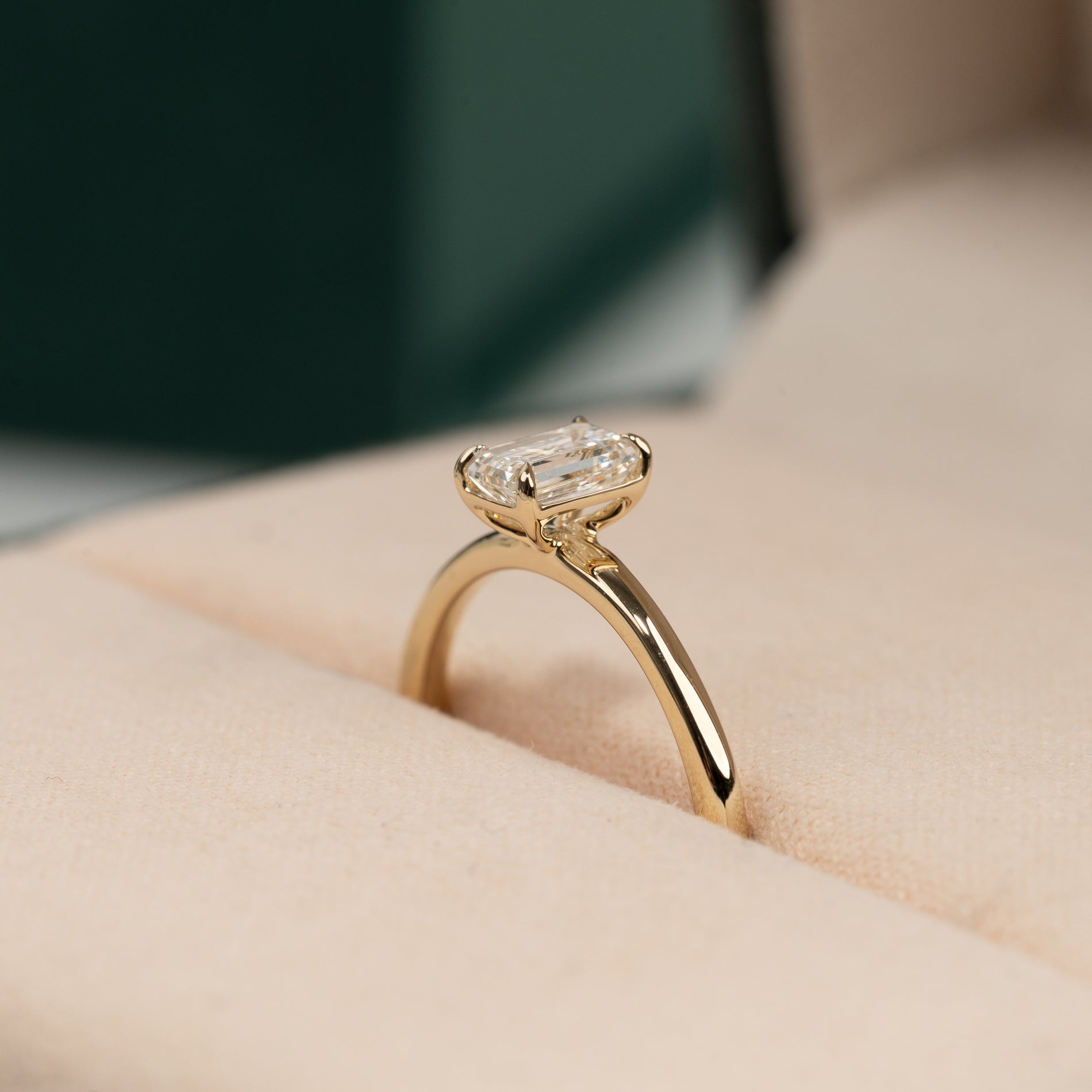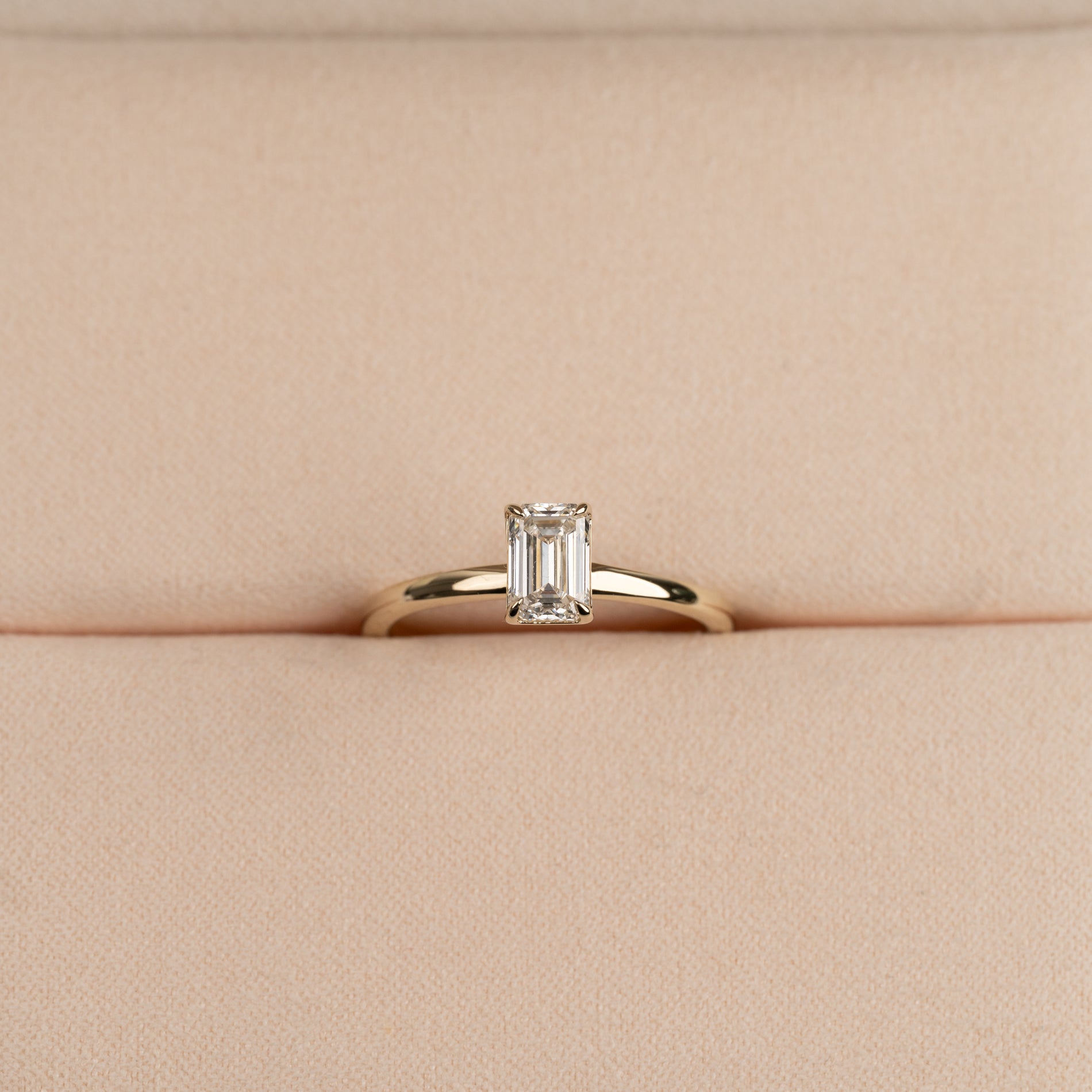 En tidløs ring i 14 karat guld med en smuk emerald‑slebet lab‑grown diamant på 0,75 ct. Diamanten er elegant fattet i en let hævet basket-fatning, der komplimenterer den klare, spejlende glans og de karakteristiske trappeformede facetter, der kendetegner emerald‑cut.